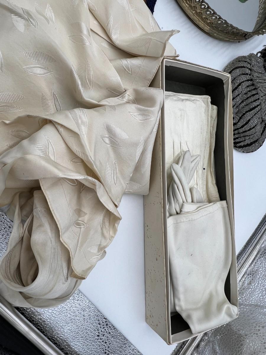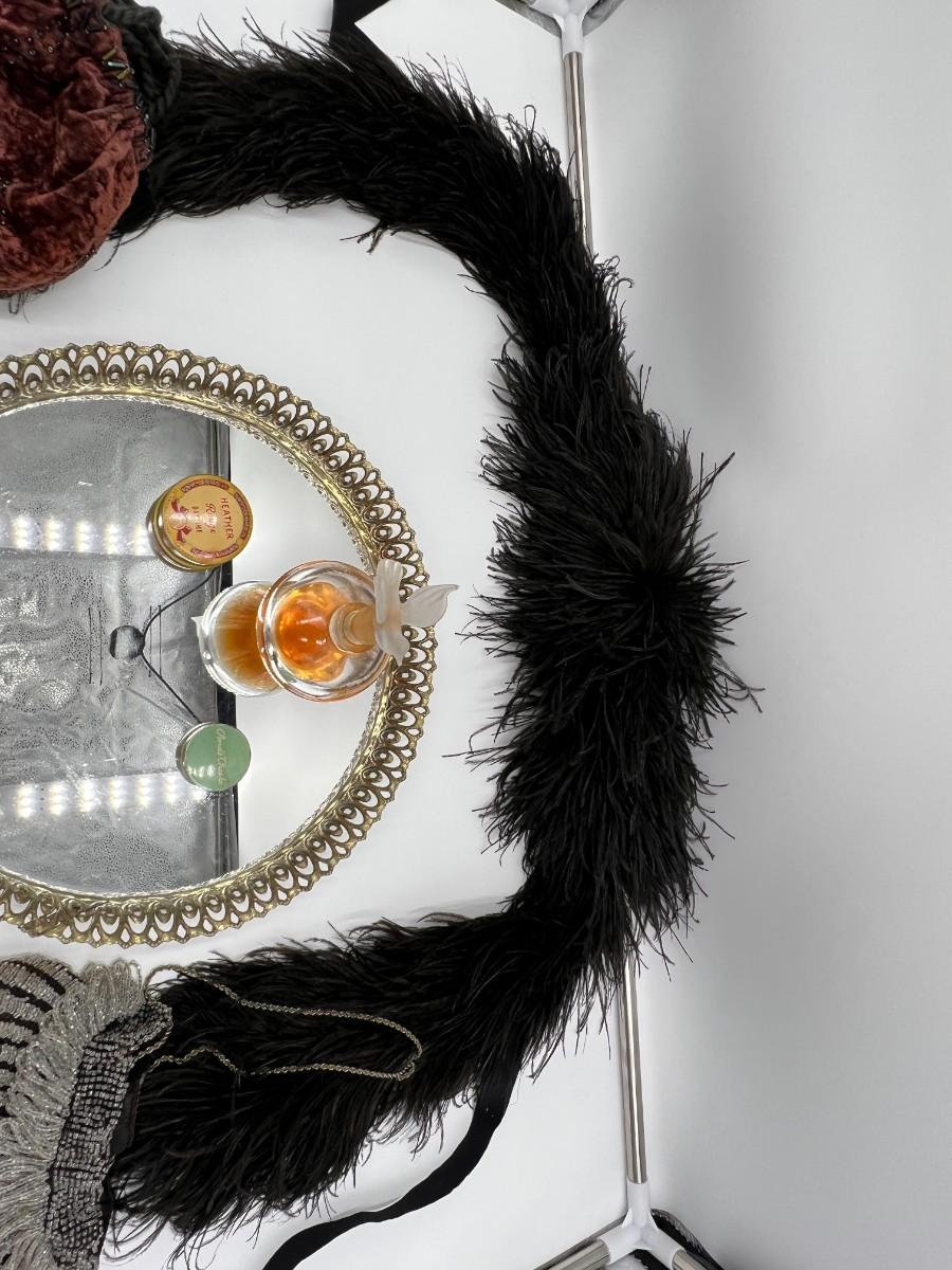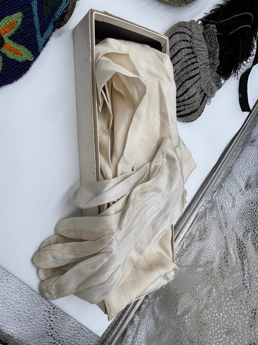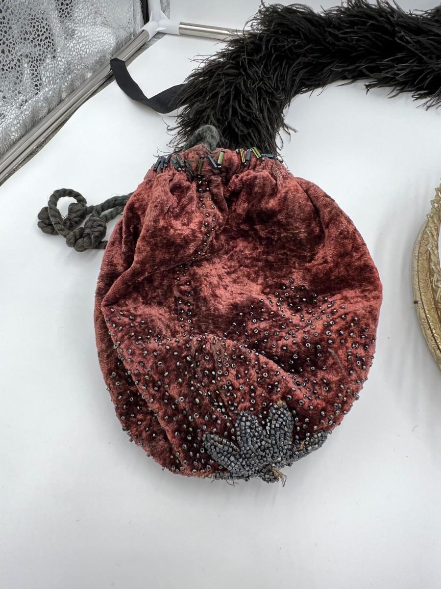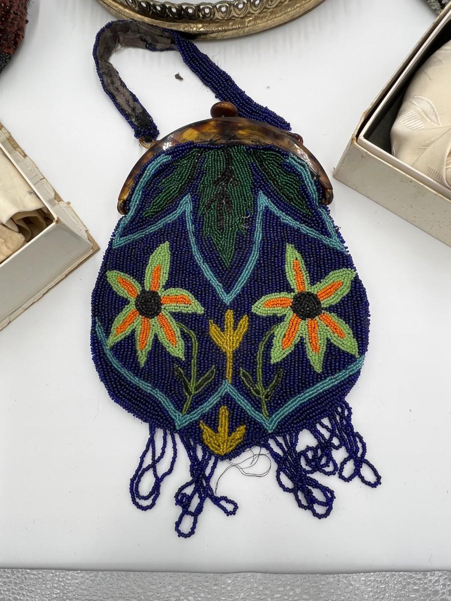 Vintage Lot of Antique Beaded Handbags, Pouches, Gloves, Garter Belts, Black Feather Boa, Perfume, and Cosmetics
