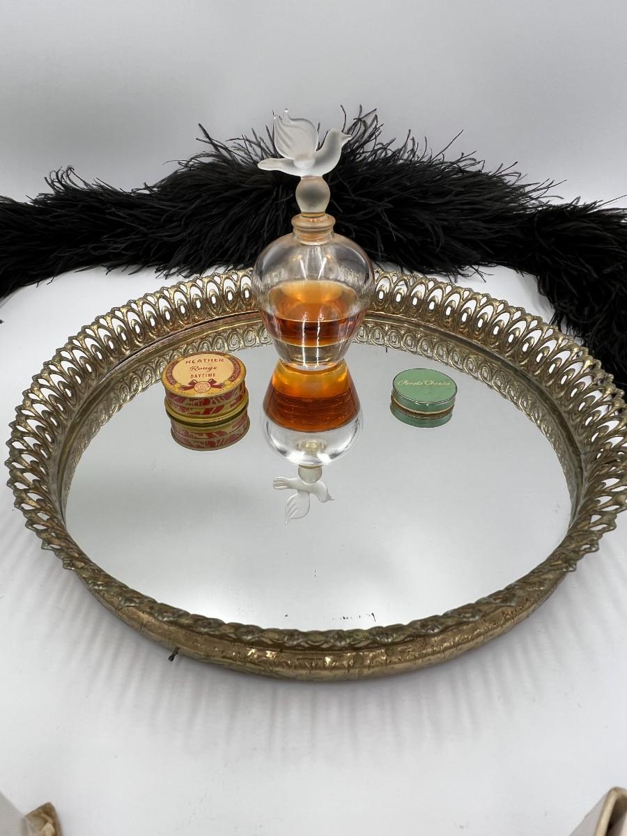 Beautiful vintage beauty lot! Includes; 3 beaded hand bags or pouches or purses, antique black feather boa, vintage gloves and scarves, antique garter belts, vintage mirror tray, vintage perfume bottle, Pond's Cheeks Dry Rouge Pink Blush tin (very lightly used), and Heather Rouge Blush tin (unused). Condition as shown.