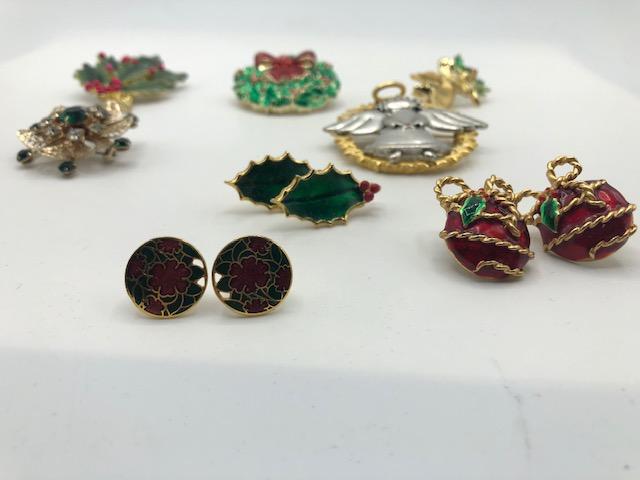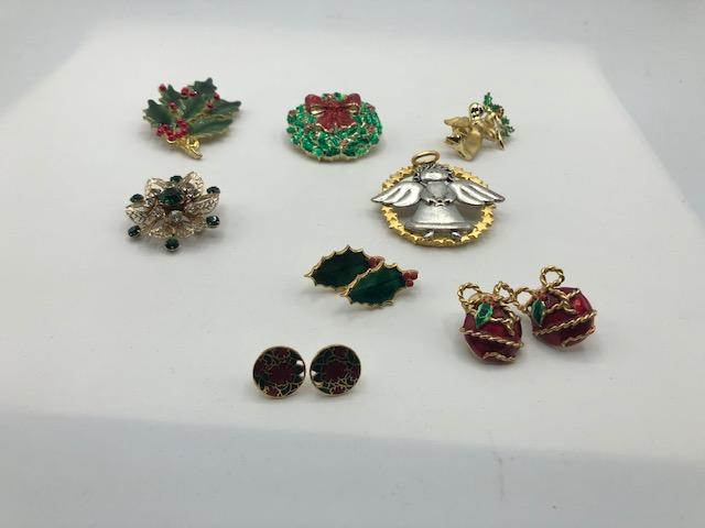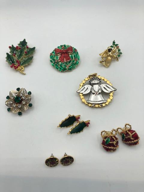 Mixed vintage lot of Christmas holiday pins and earrings. 5 pins & 3 pairs of earrings. Earrings are for pierced ears.