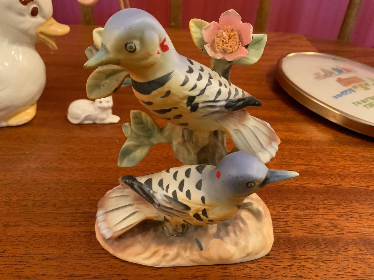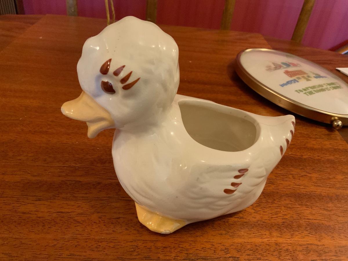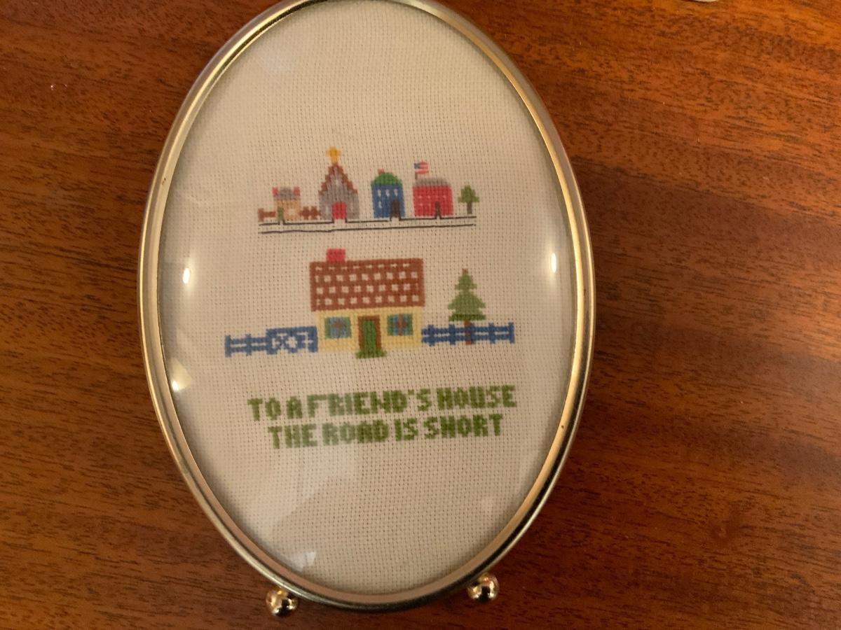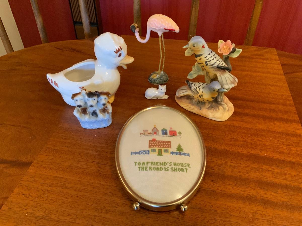 Vintage Lot of household decorations including a cross stitch picture in a bubble frame