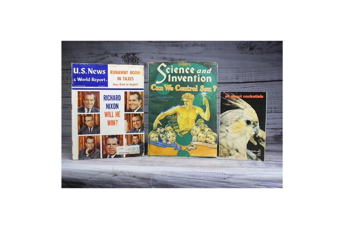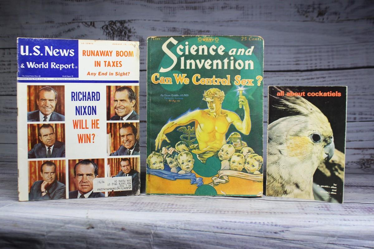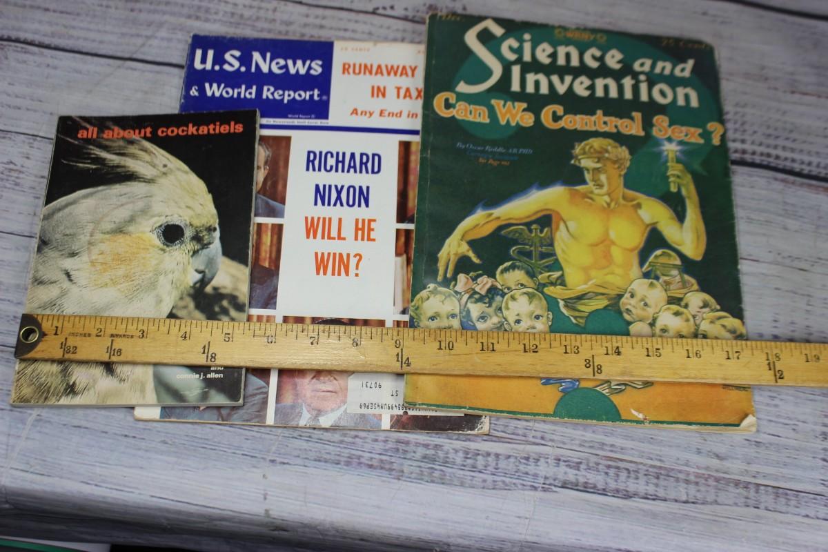 Vintage lot of books and magazines. US News with Nixon on the cover, Science and Invention magazine, and a book about cockatiels. Vintage read condition.