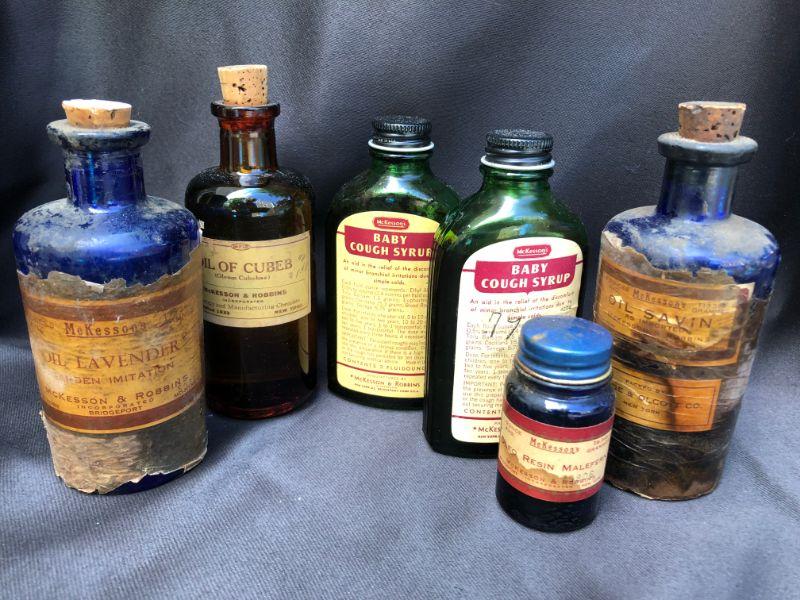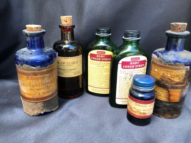 Vintage Lot of Mixed Blue, Amber and Green Medicine Pharmaceutical Bottles. Include (2) Green Mckesson's Baby Cough Syrup, 2 Blue Bottles of Oil Lavender and Oil Savin, Amber Bottle of Oil of Cubes, and Small Blue Bottle of Oleo Resin Malefern. NOT FOR USE OR CONSUMPTION.