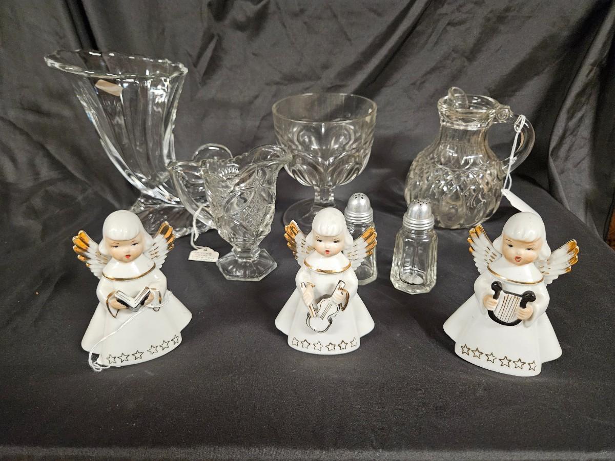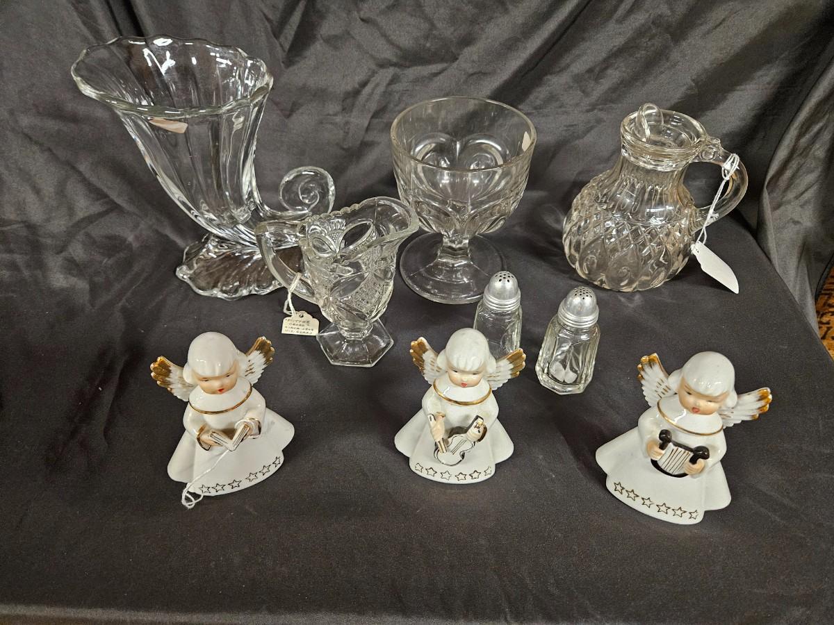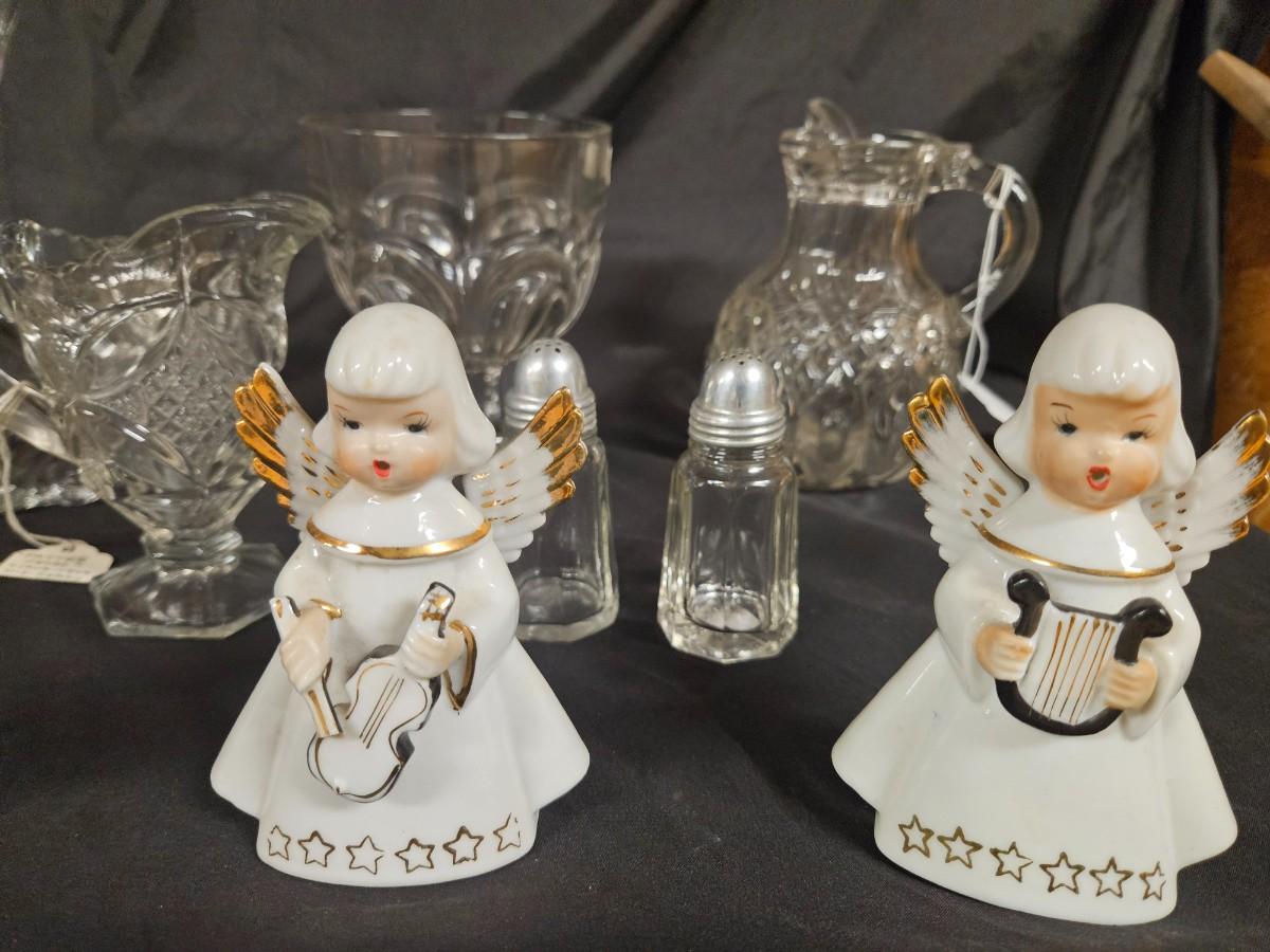 Vintage Lot of Pressed Glass, Goblet, MCM Angels and S&P Shakers