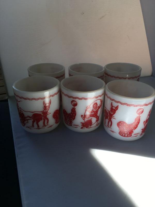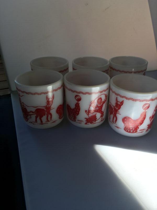 Vintage Lot of SIX Pyrex Milk Glass Children's Theme Circus Cup Mug Clowns Old Donkey Pig