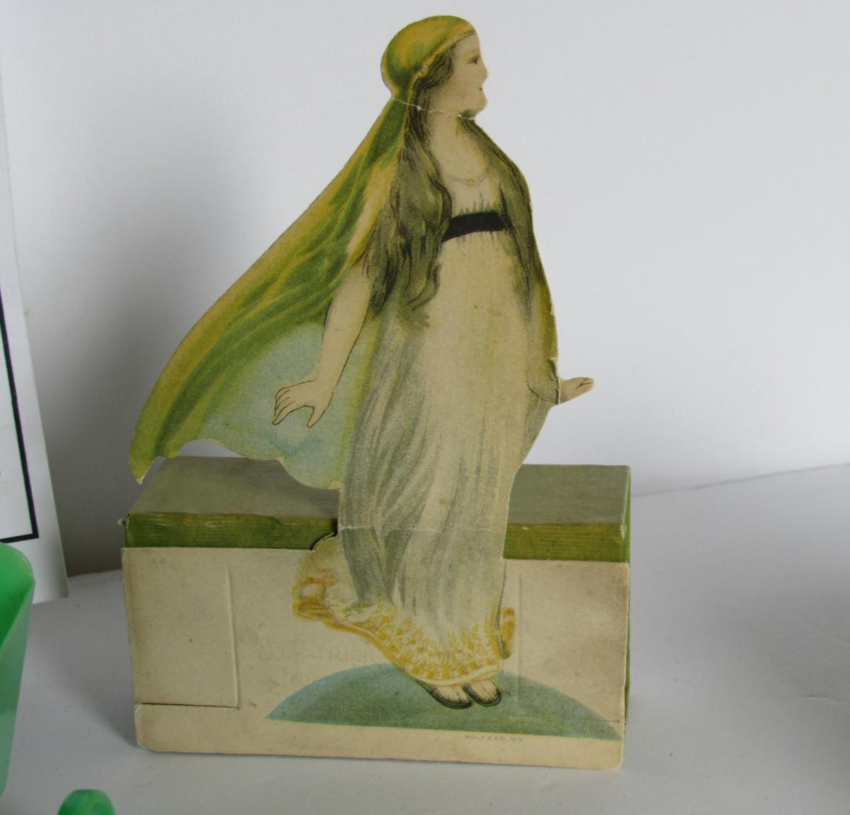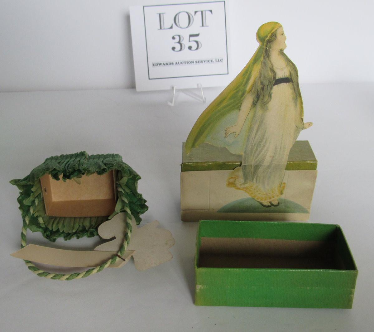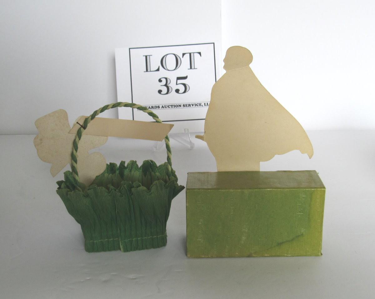 The cart has a chip. The lady scrap on the candy container box has bends but is intact. Rare piece. The crepe paper and scrap nut cup is in nice shape. A neat old lot of hard to find stuff. Shipping is available on this lot with additional shipping and handling fees. Please see our terms for details.