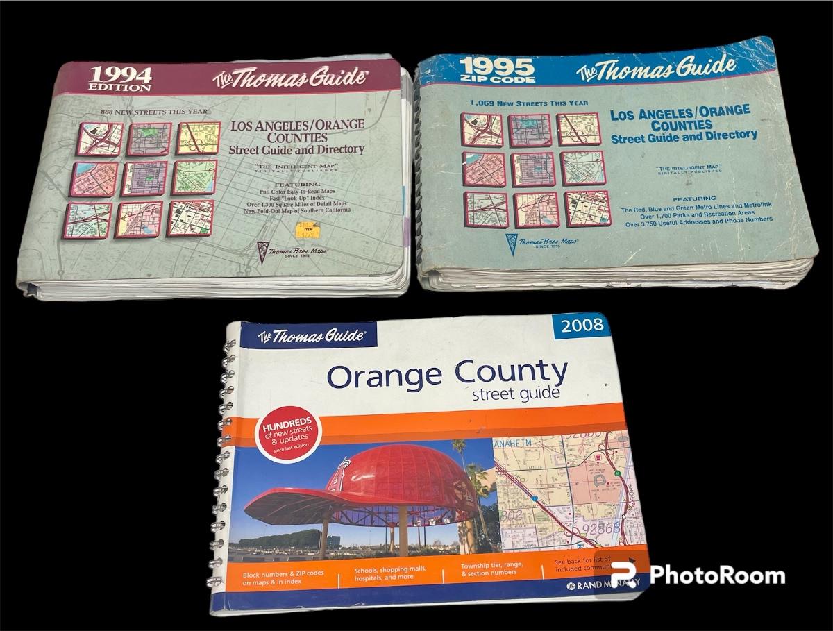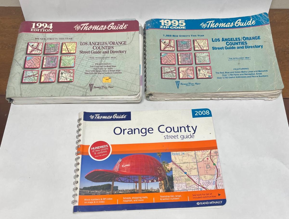 Set includes Orange County Streets in 2008, and 2 Los Angeles County / Orange County combined books from 1994 and 1995. In good used condition.