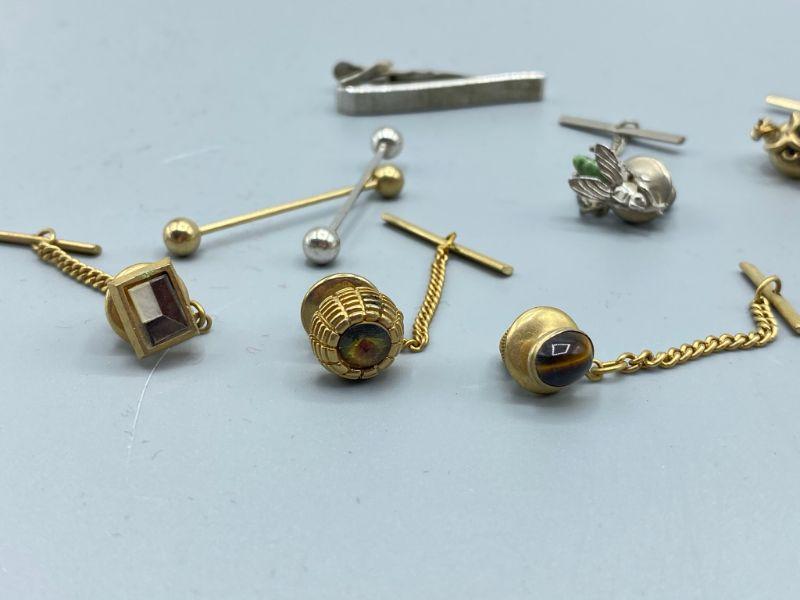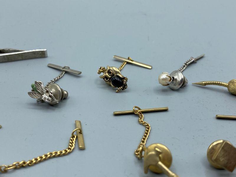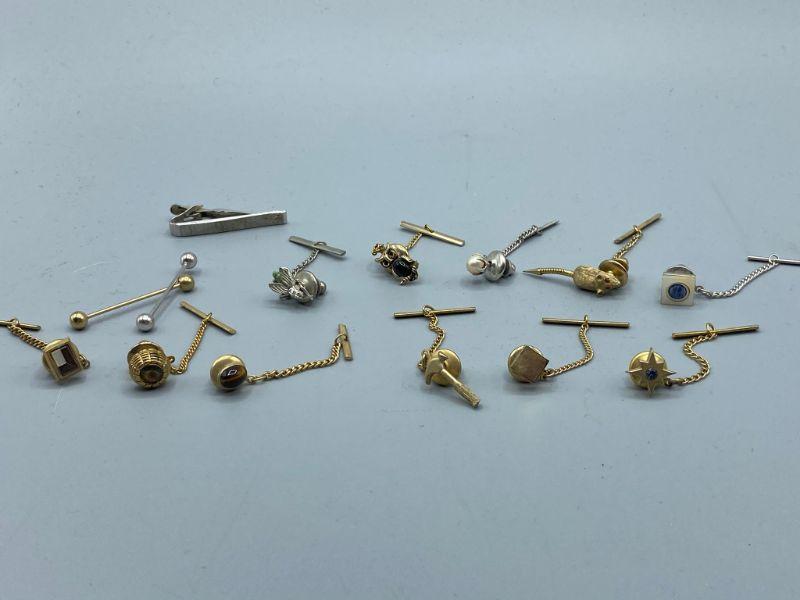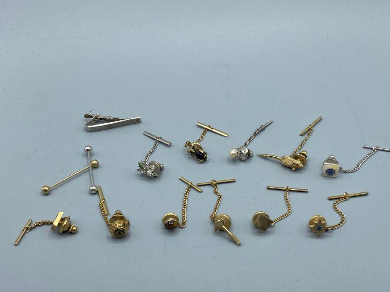 Great vintage lot of tie tacks. Gold tone and silver tone metal. Each one different. 14 pieces total.