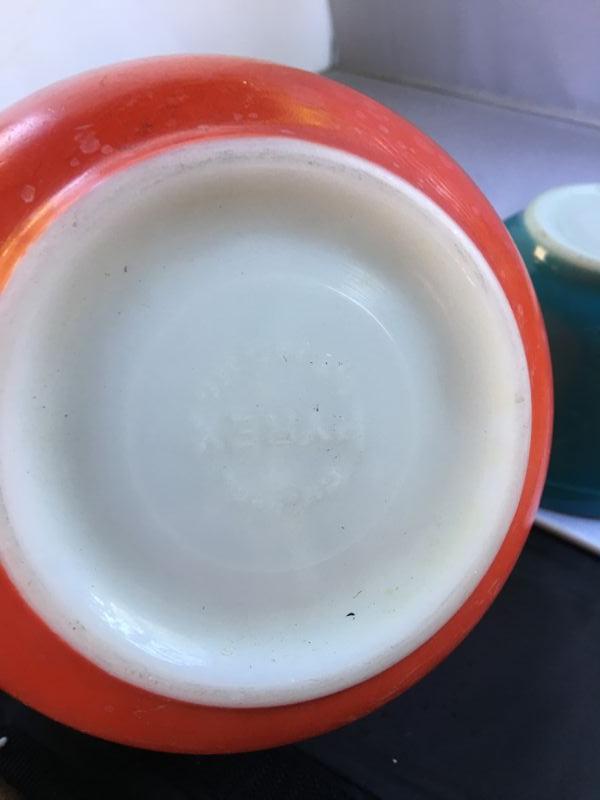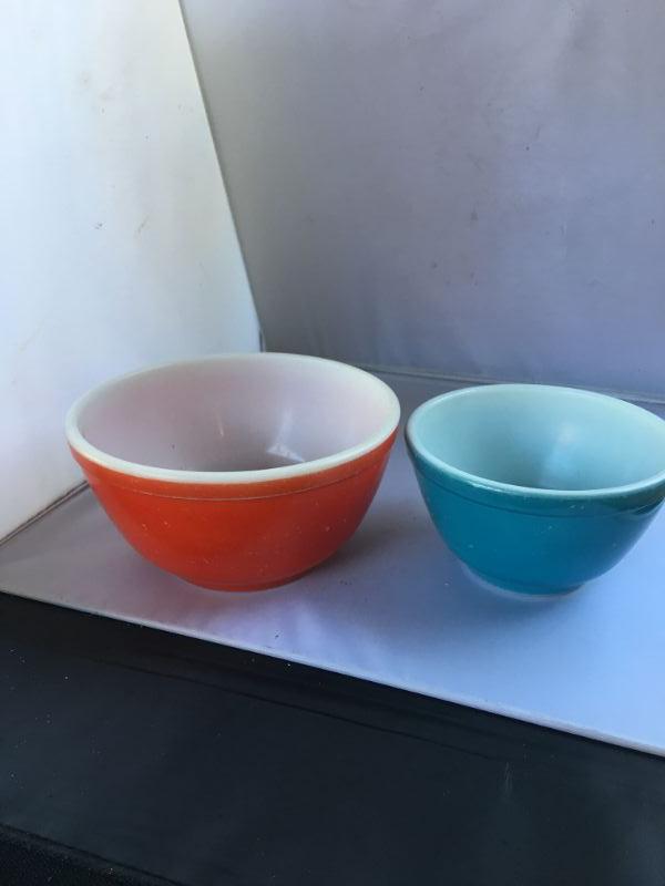 In VG conditions. The orange one measures 7" X 4" and show wear such as scratches on the surface but no chips or cracks. The blue bowl measures 6" X 4" in VG conditions.