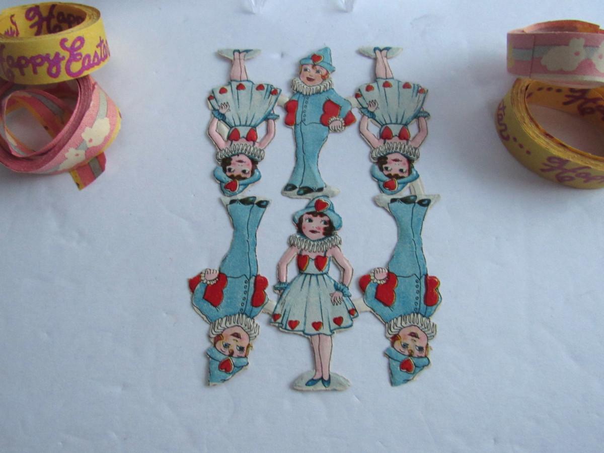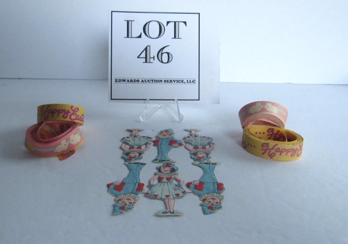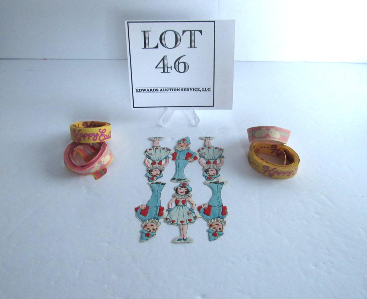 The Valentine scraps are old German embossed thin paper, very nice shape. The Easter ribbon is thin paper for crafting, egg decorating, etc. Nice shape, nice age patina. Shipping is available at shipping cost plus $5 a box handling fee. See our terms for details.