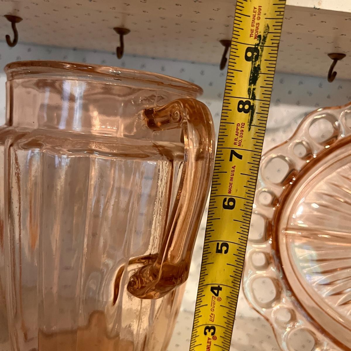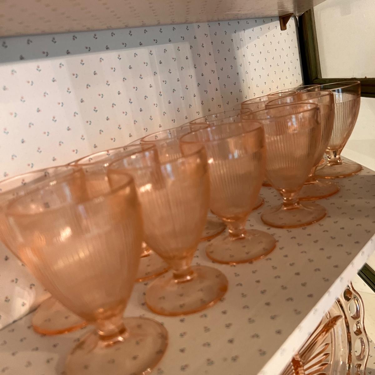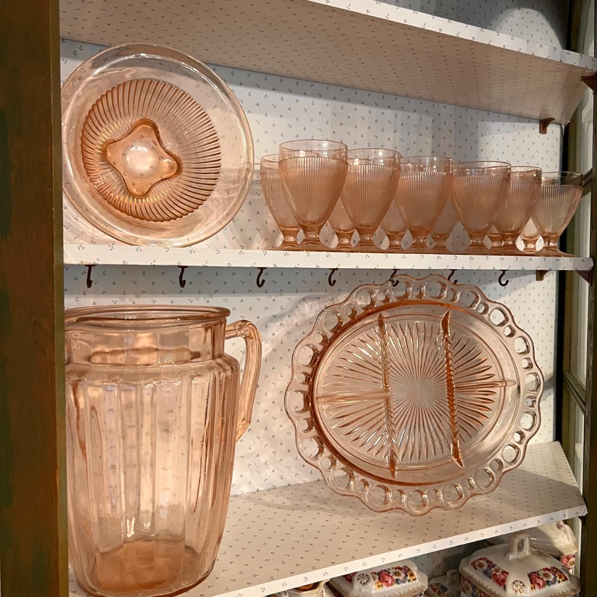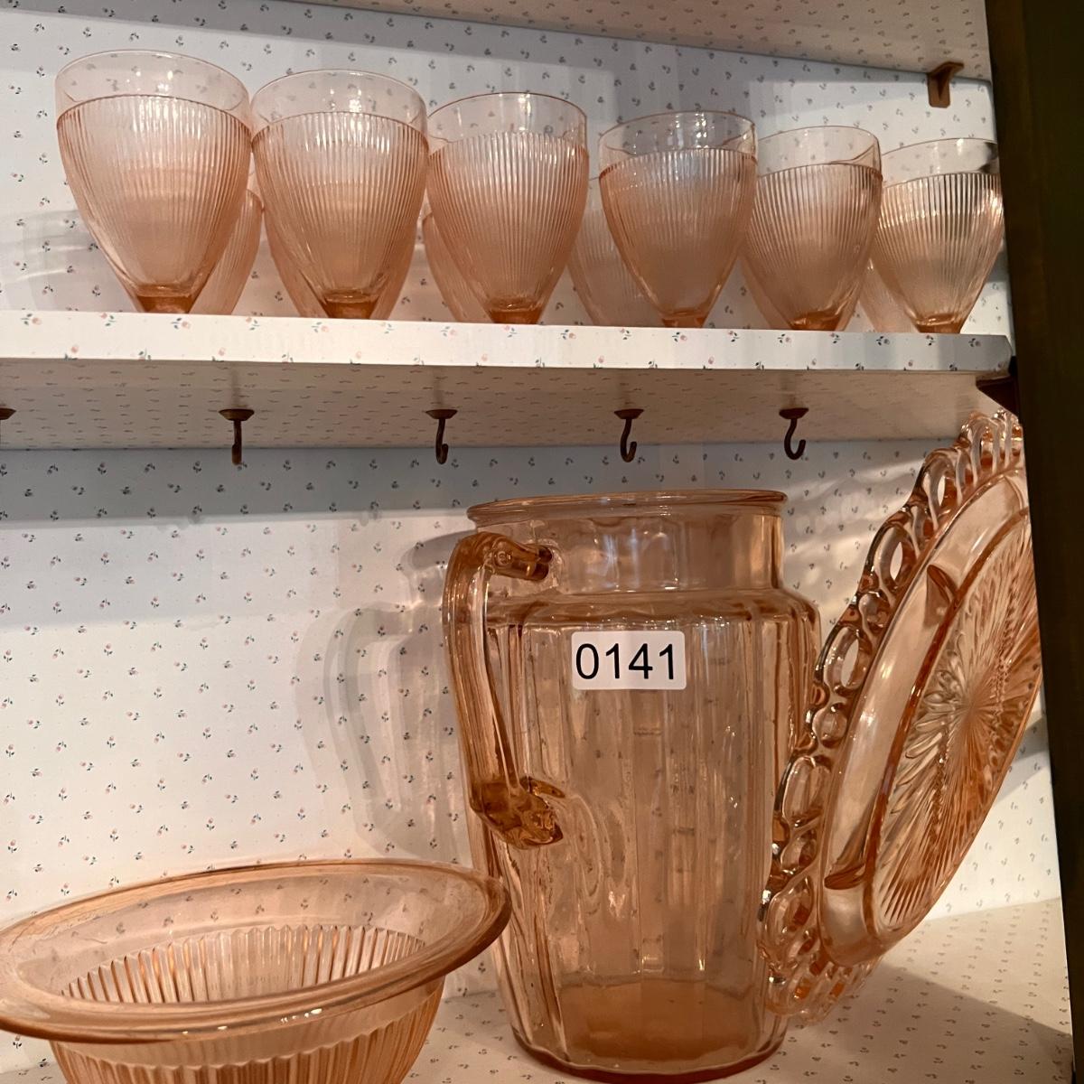 12 cups, 1 pitcher, 1 bowl and 1 separated platter plate. In excellent condition.