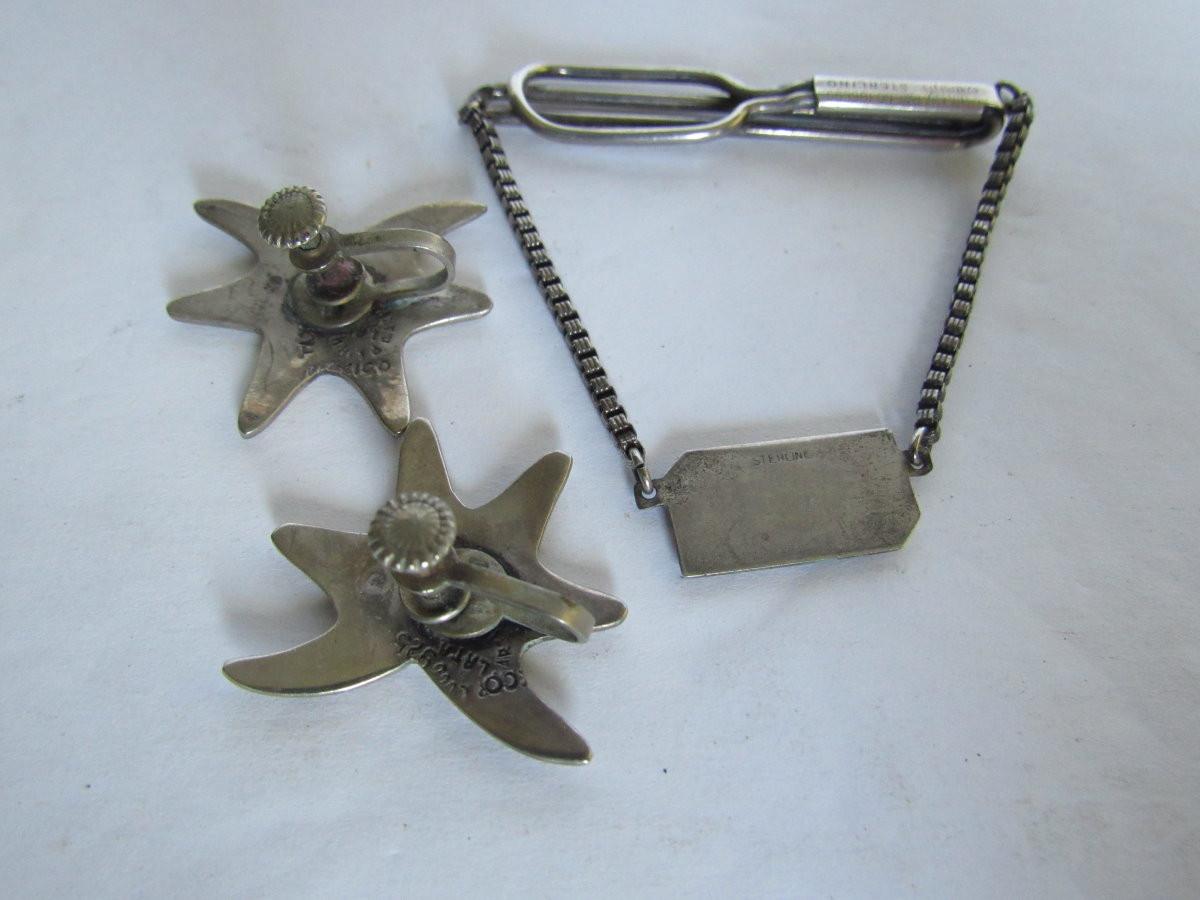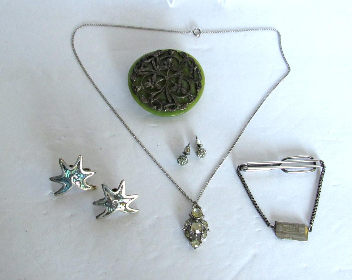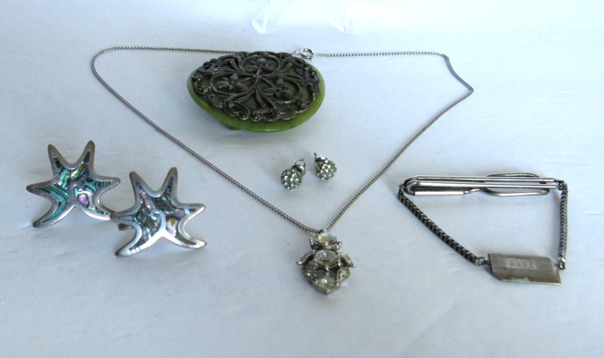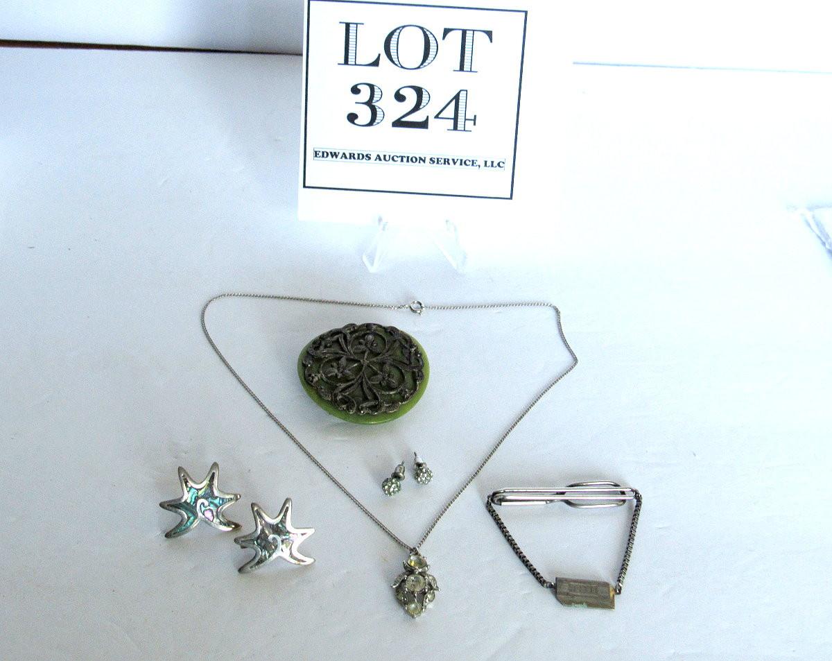 Lot 324: Vintage Lot, Sterling and Shell Earrings, Sterling Bar Pin, Plastic Belt Buckle More