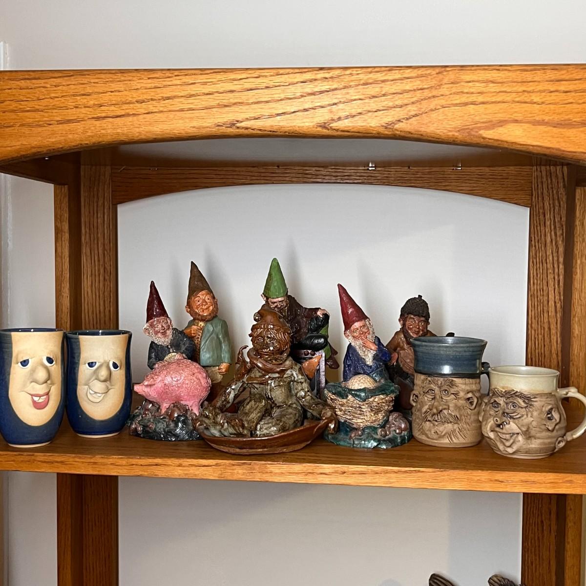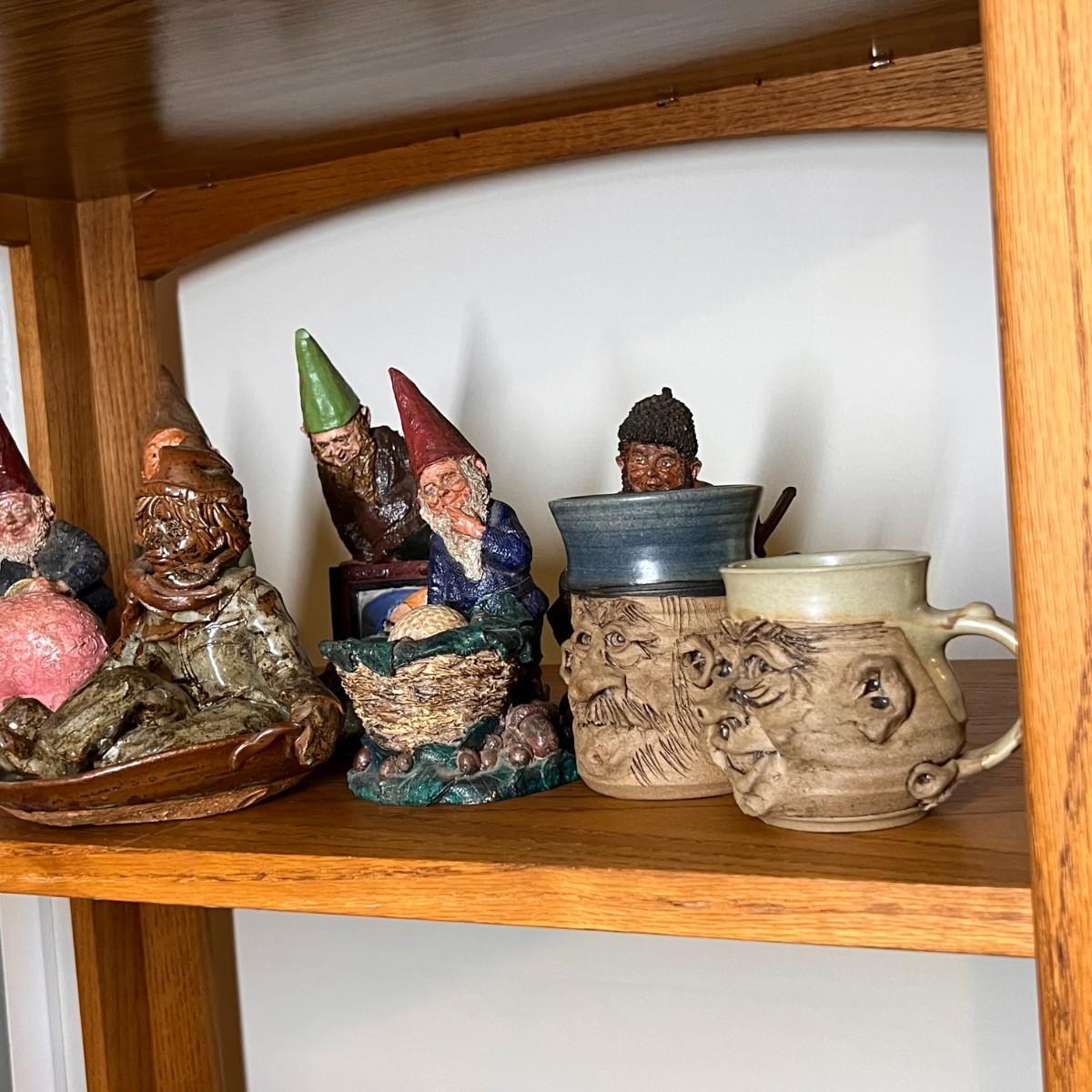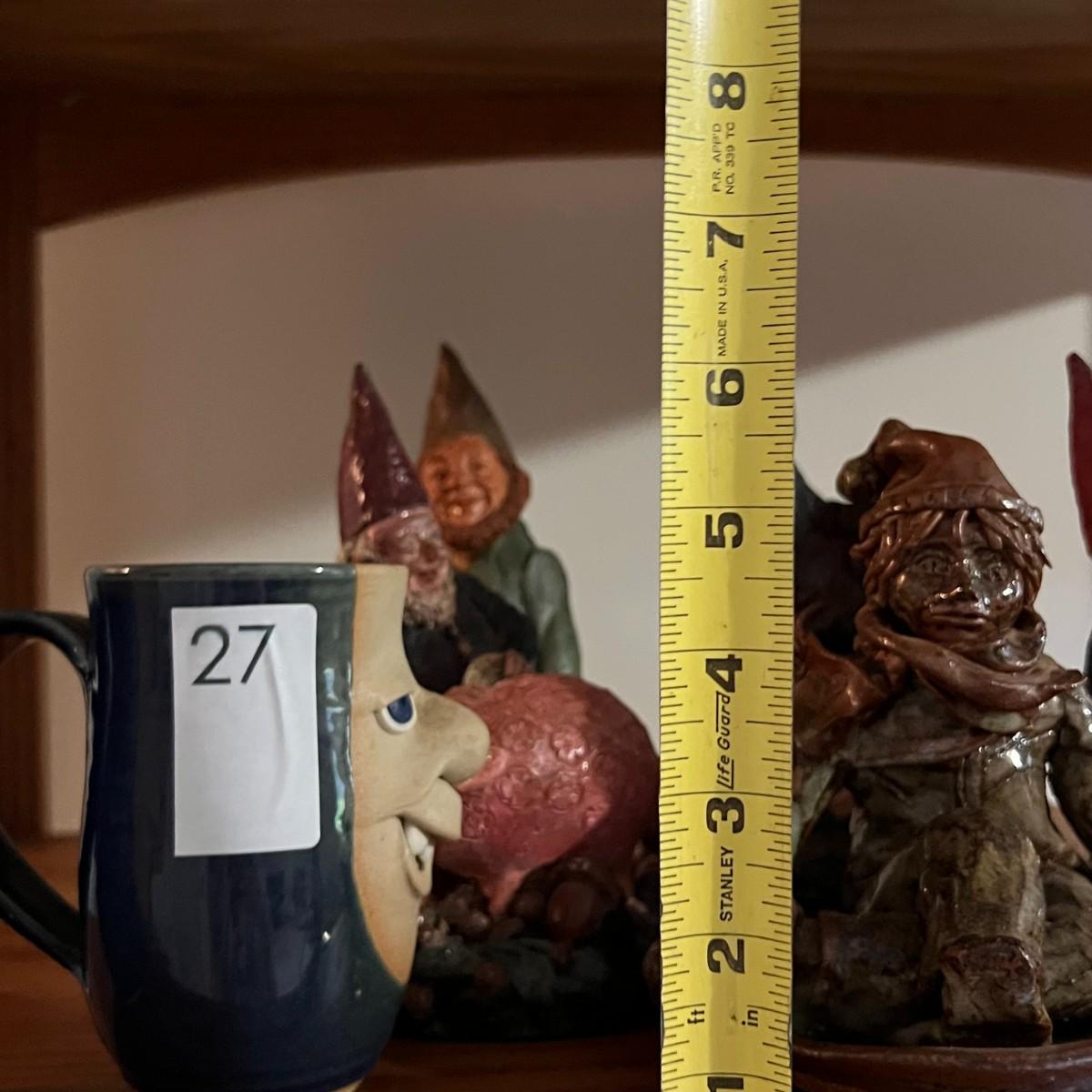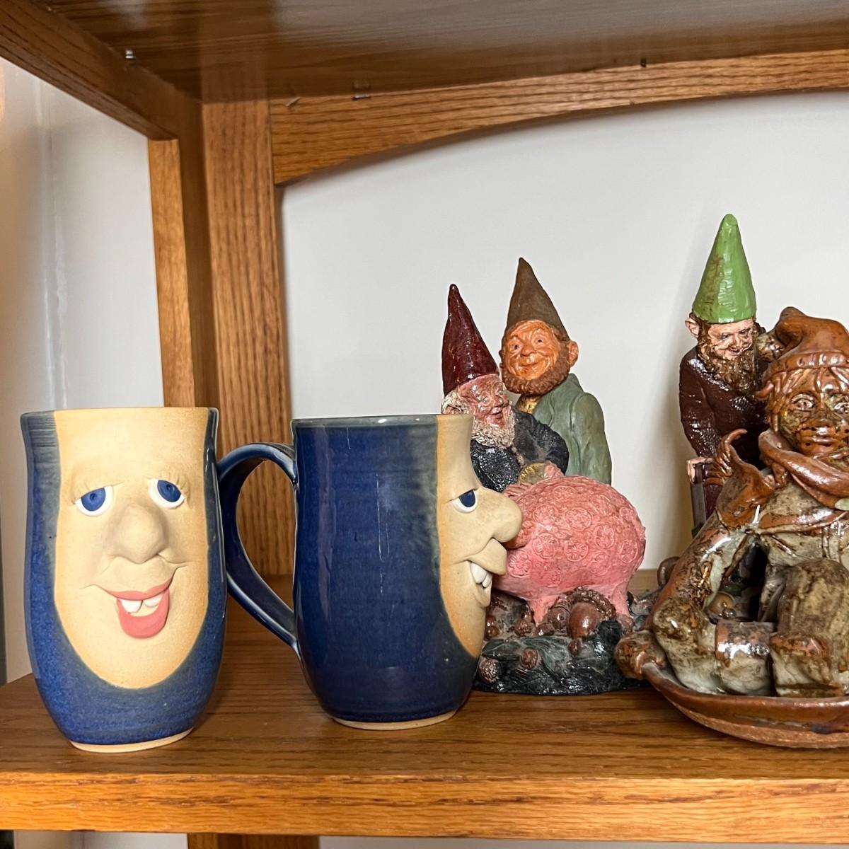 Lot of collectible Tom Clark Gnomes signed (we believe the glossier 3 are “seconds”) from Cairn Studios and pottery mugs. 2 Village Potter Nova Scotia and 2 Hassfeld Pottery.