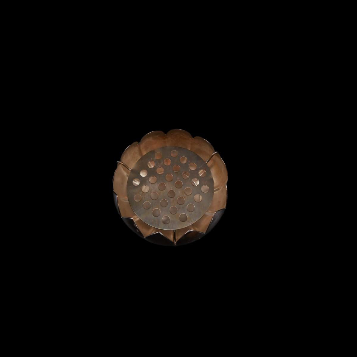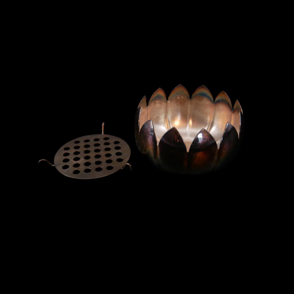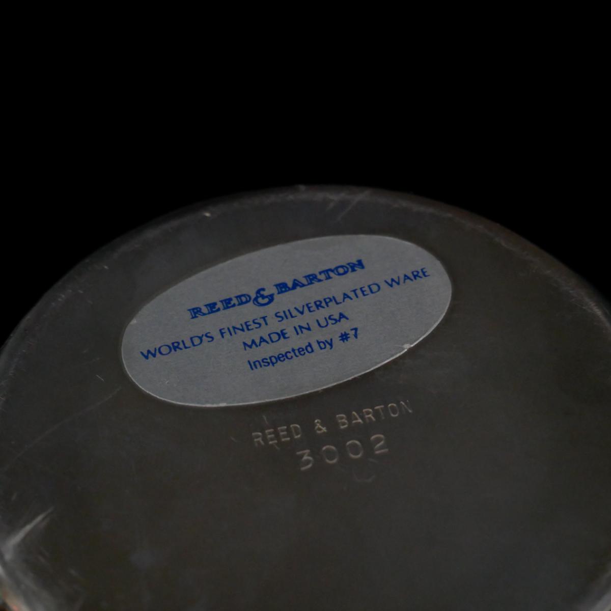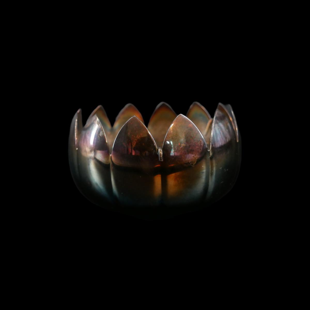Vintage mid-century style silver-plated lotus flower vase. Maker's mark Reed & Barton, made in USA number 3002. Beautiful patina with purple, blue, and yellow but can also be polished. Measures approximately L 4.5" x H 3", weighs 8 oz. (D79)