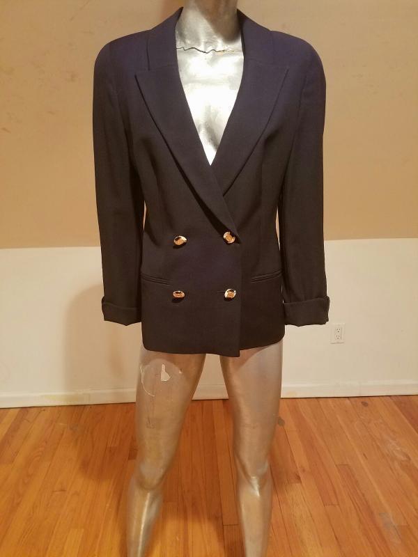 Stunning Louis Feraud Germany double breasted Jacket fully lined with the iconic signature all over and the gold chain. In very good to great vintage condition. Us size 6