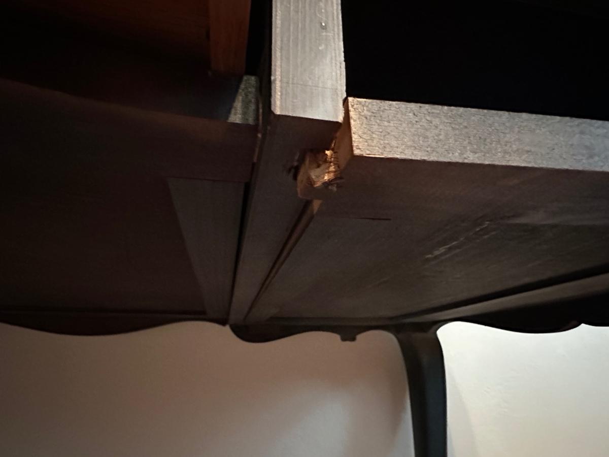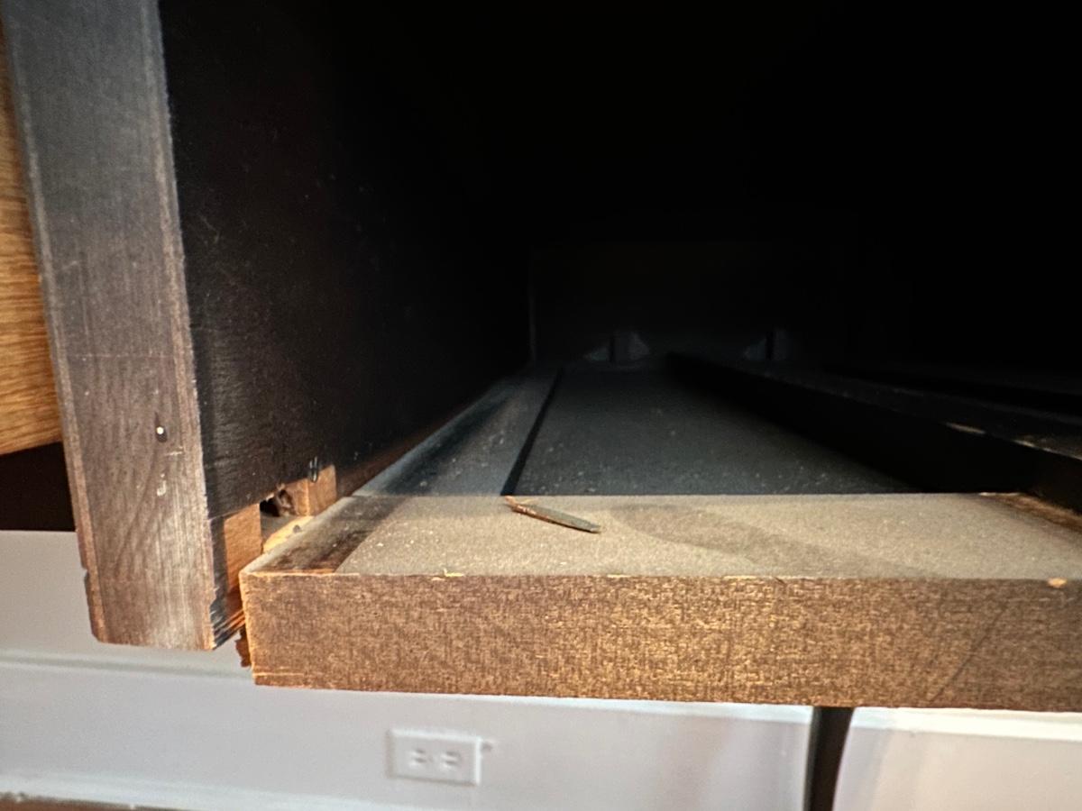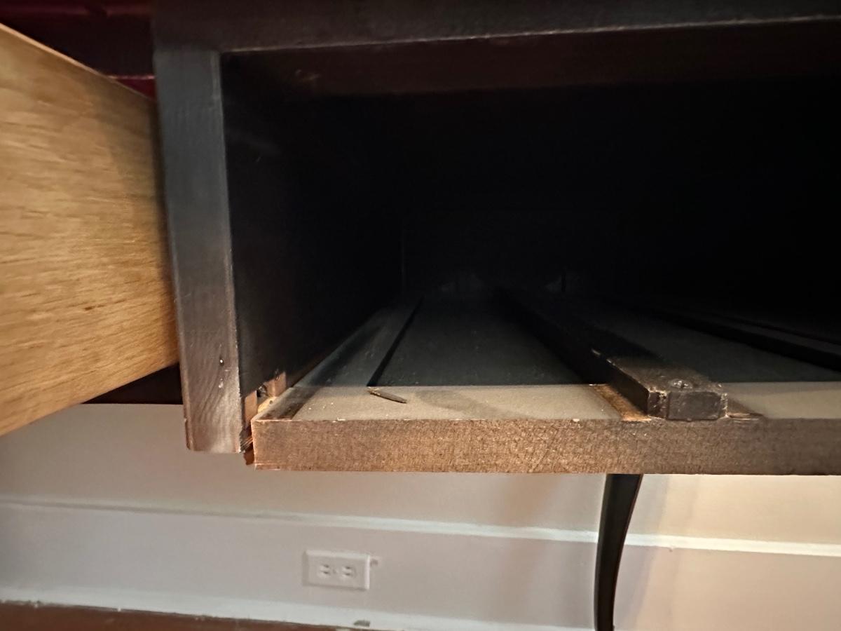 *The board underneath the right hand drawer needs some attention. Easy fix with some wood glue and a clamp. The red pads lift right out.