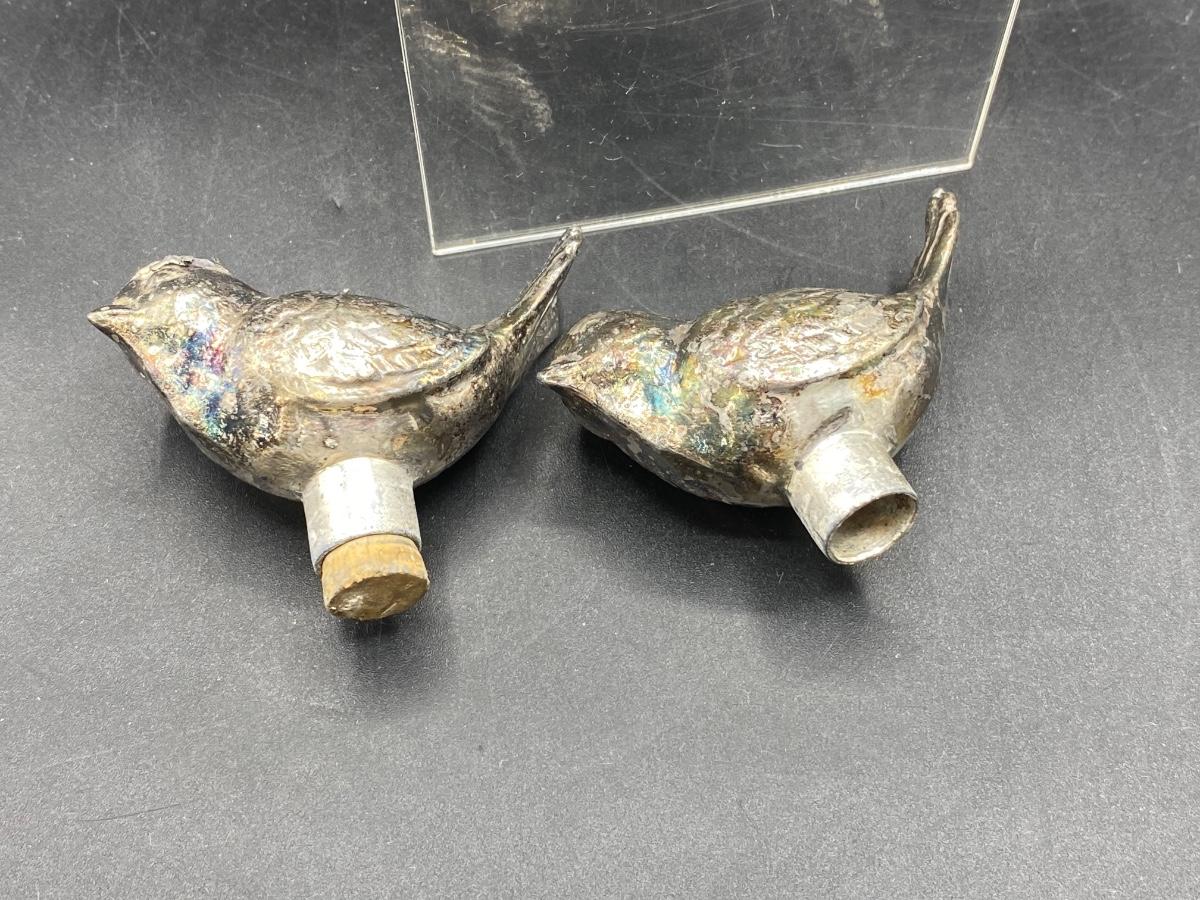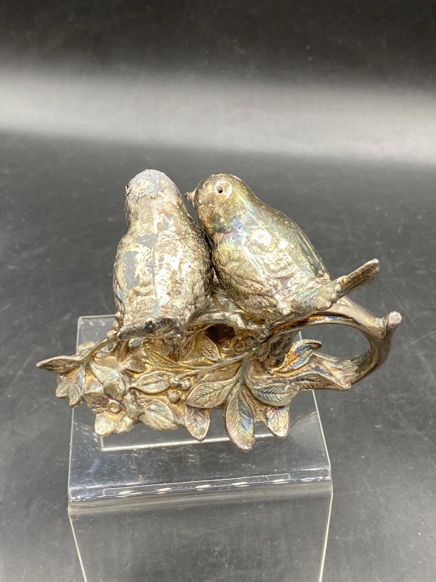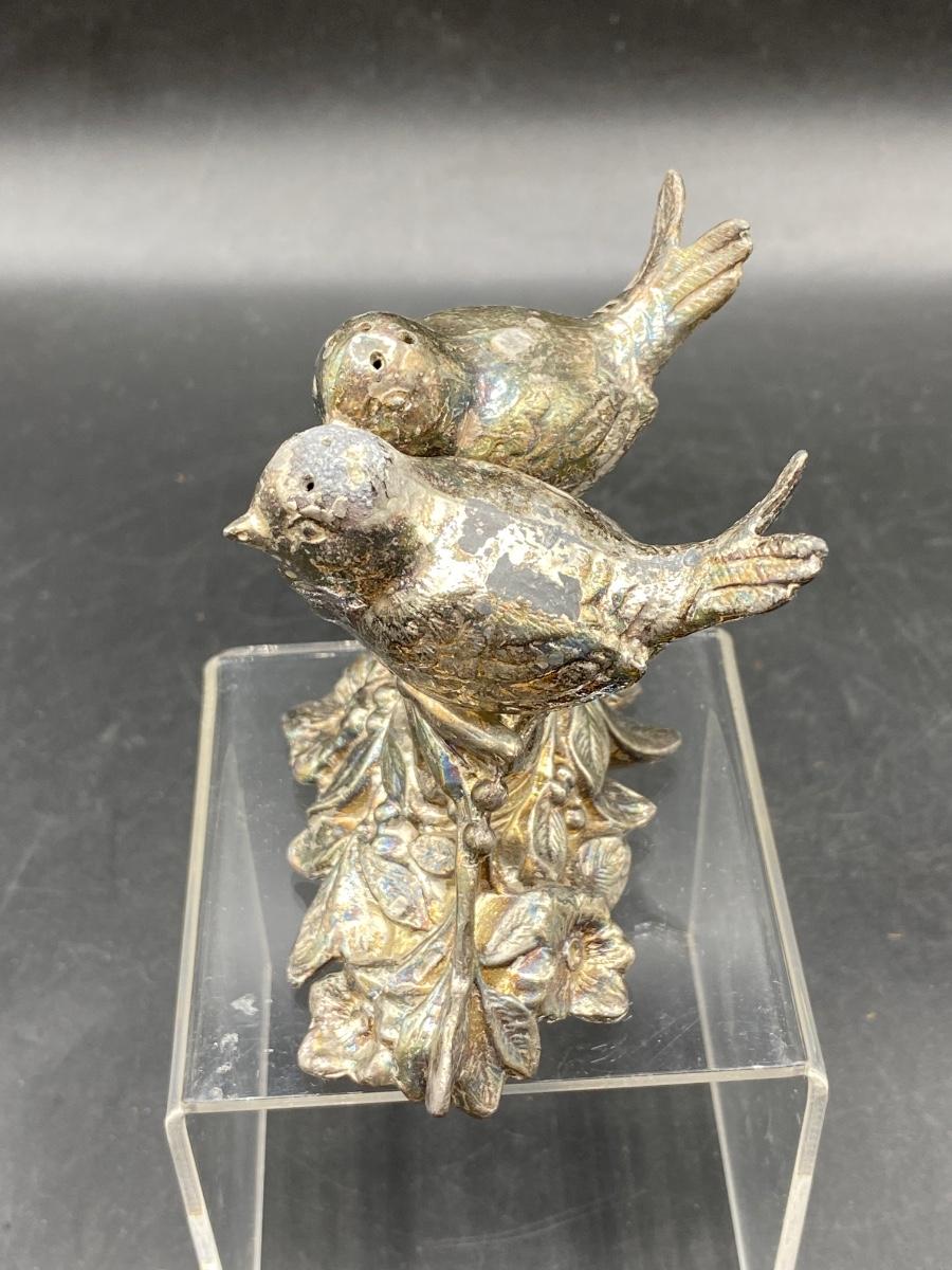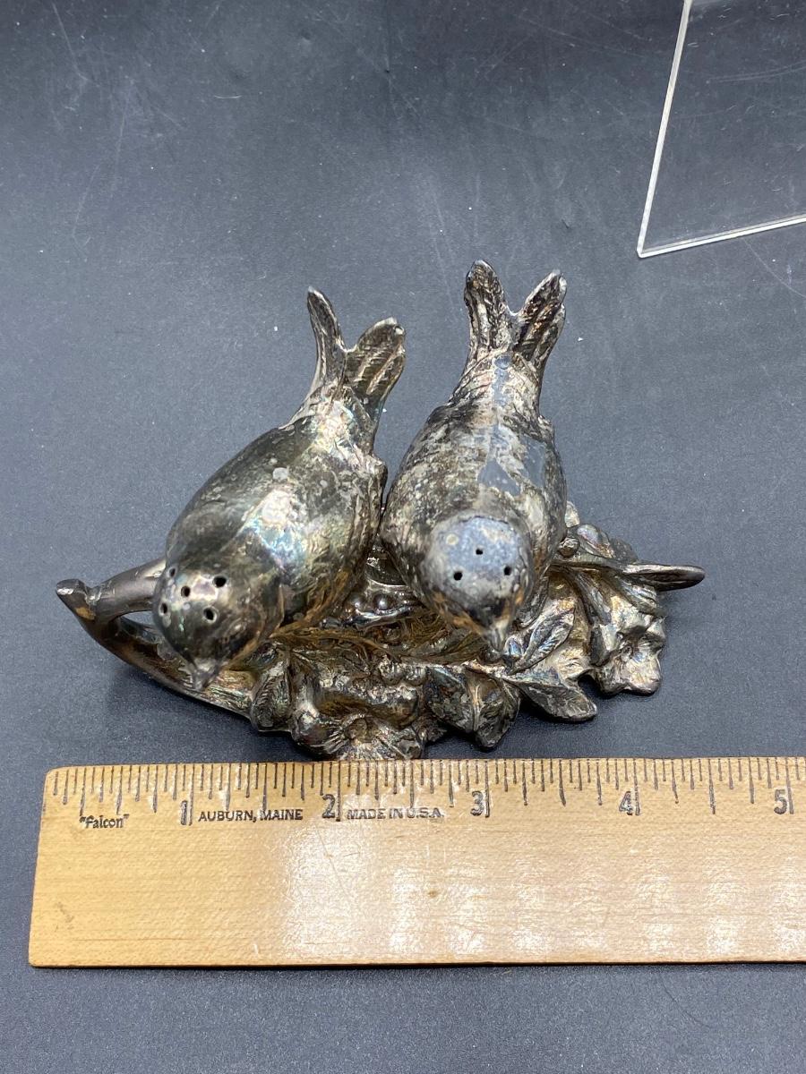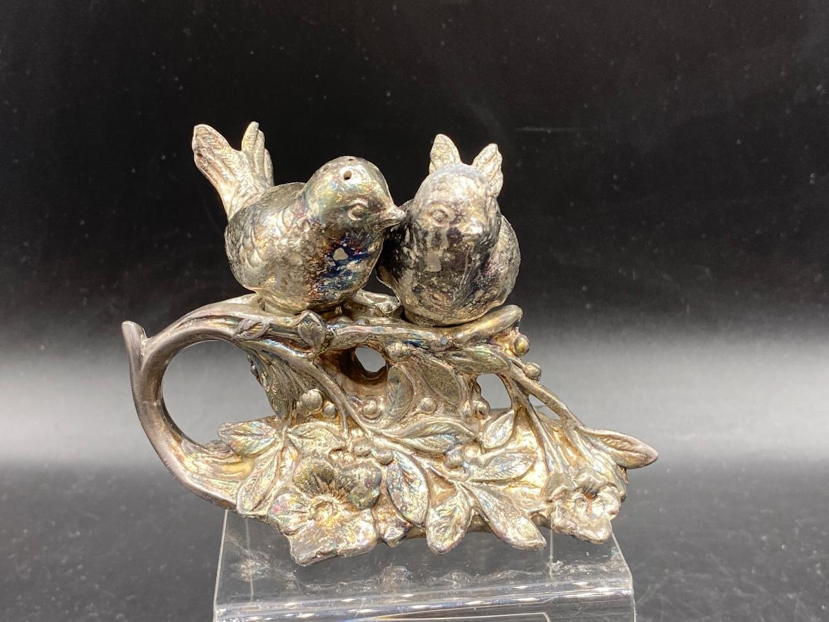 Vintage salt and pepper shaker set of lovebirds sitting on a tree branch. Looks like silver plate, there is some marks on bottom, not sterling. One bird is missing the cork.