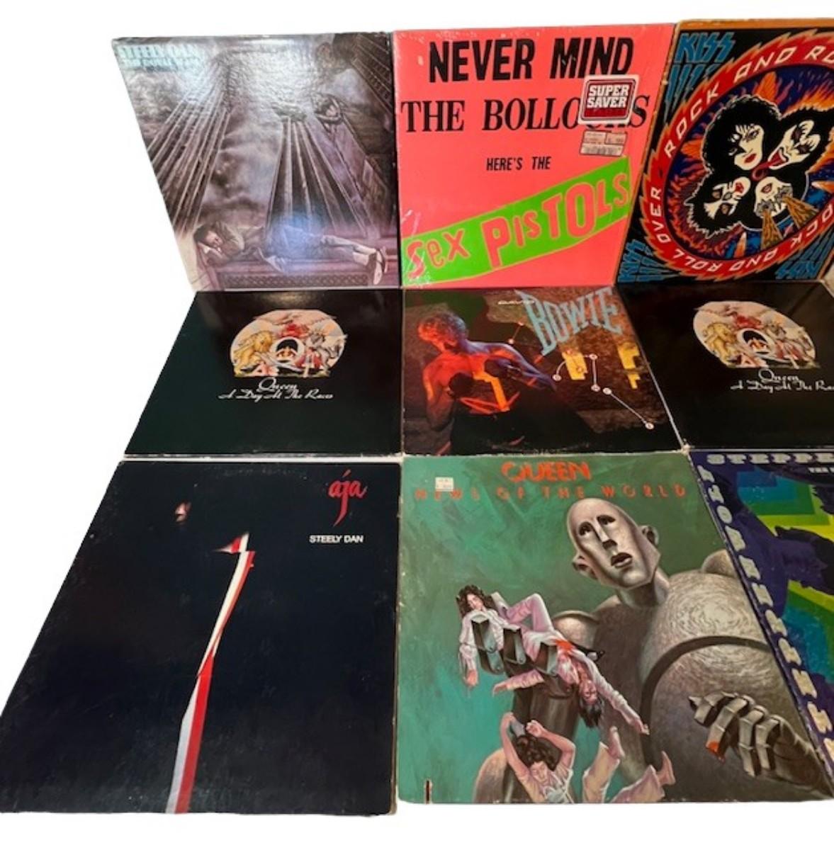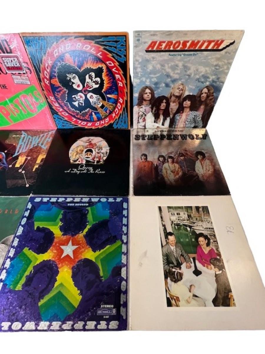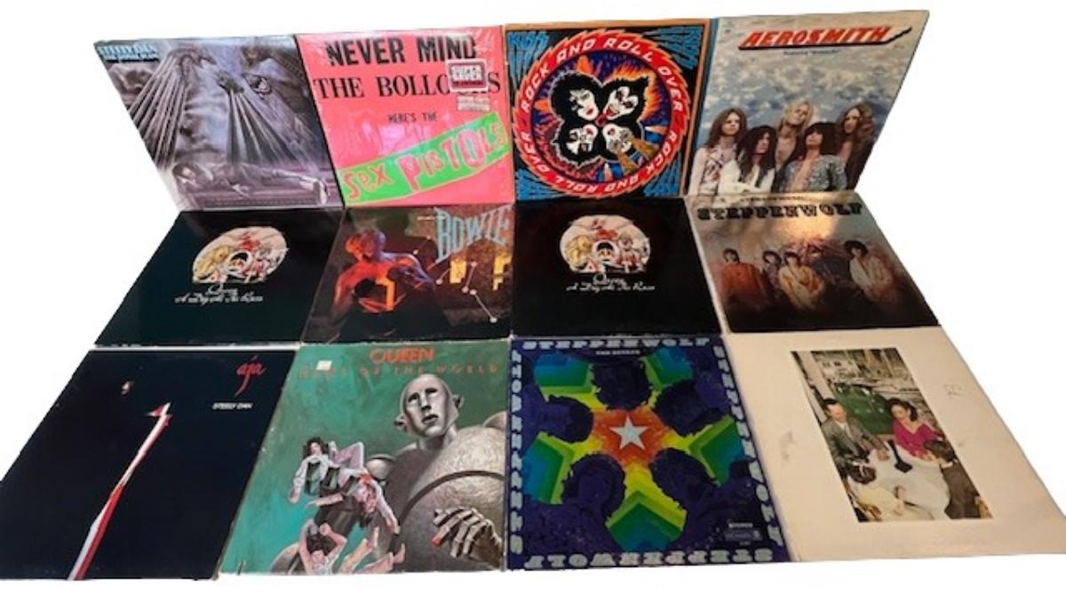 Includes Queen, Aerosmith, Sex Pistols, Kiss, and more. Total of 12 pieces. Jackets and sleeves may have age related wear.