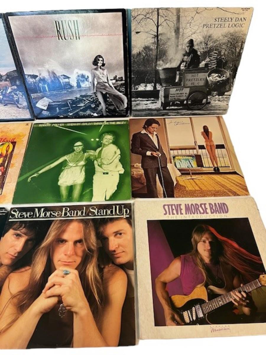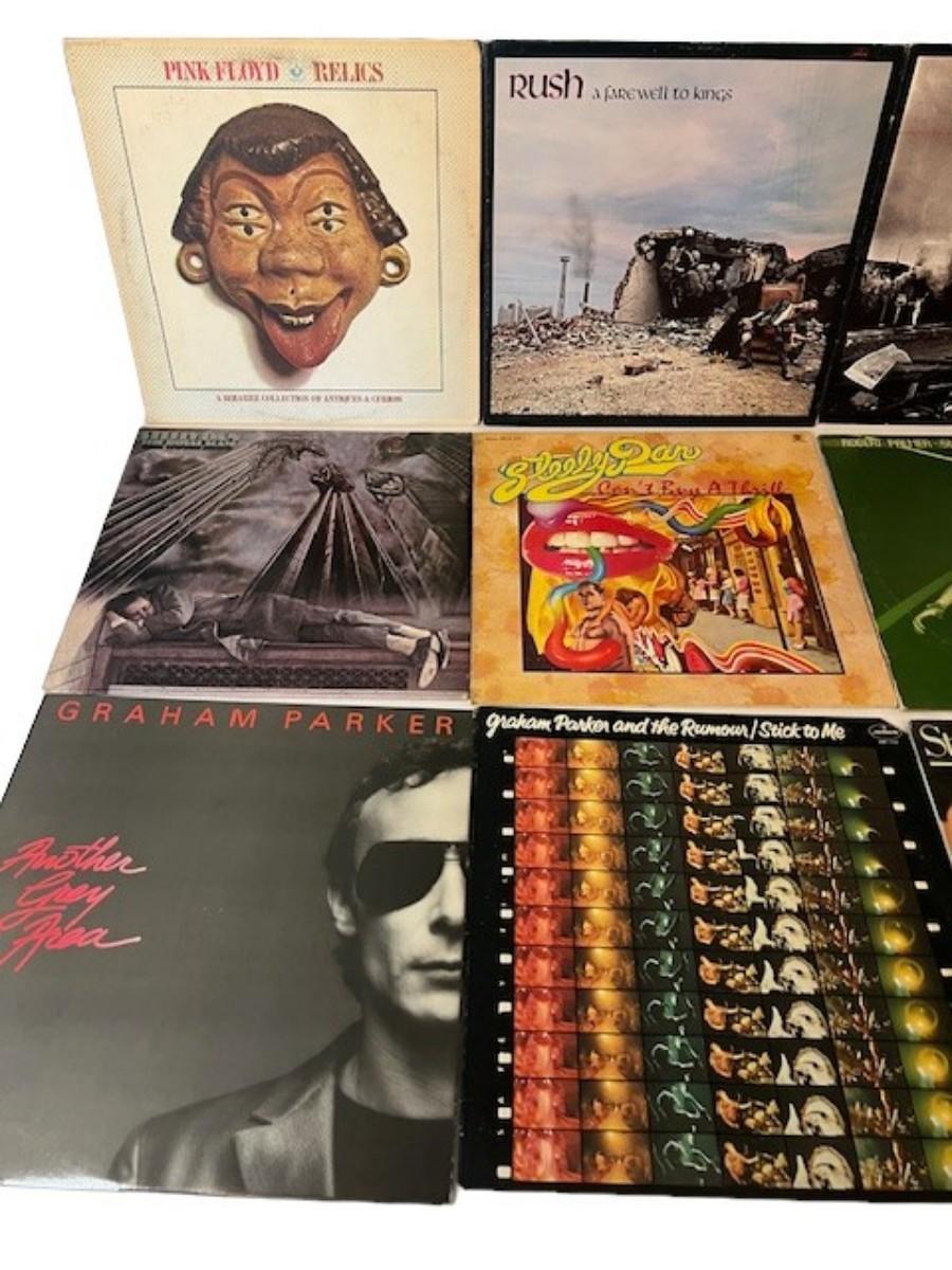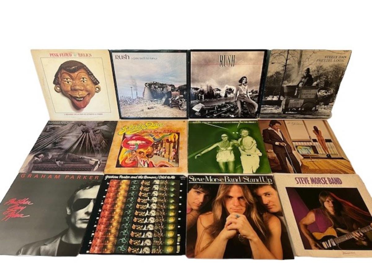 Includes Rush, Pink Floyd, Steely Dan, Robert Palmer, and more. Total of 12 pieces. Jackets and sleeves may have age related wear.