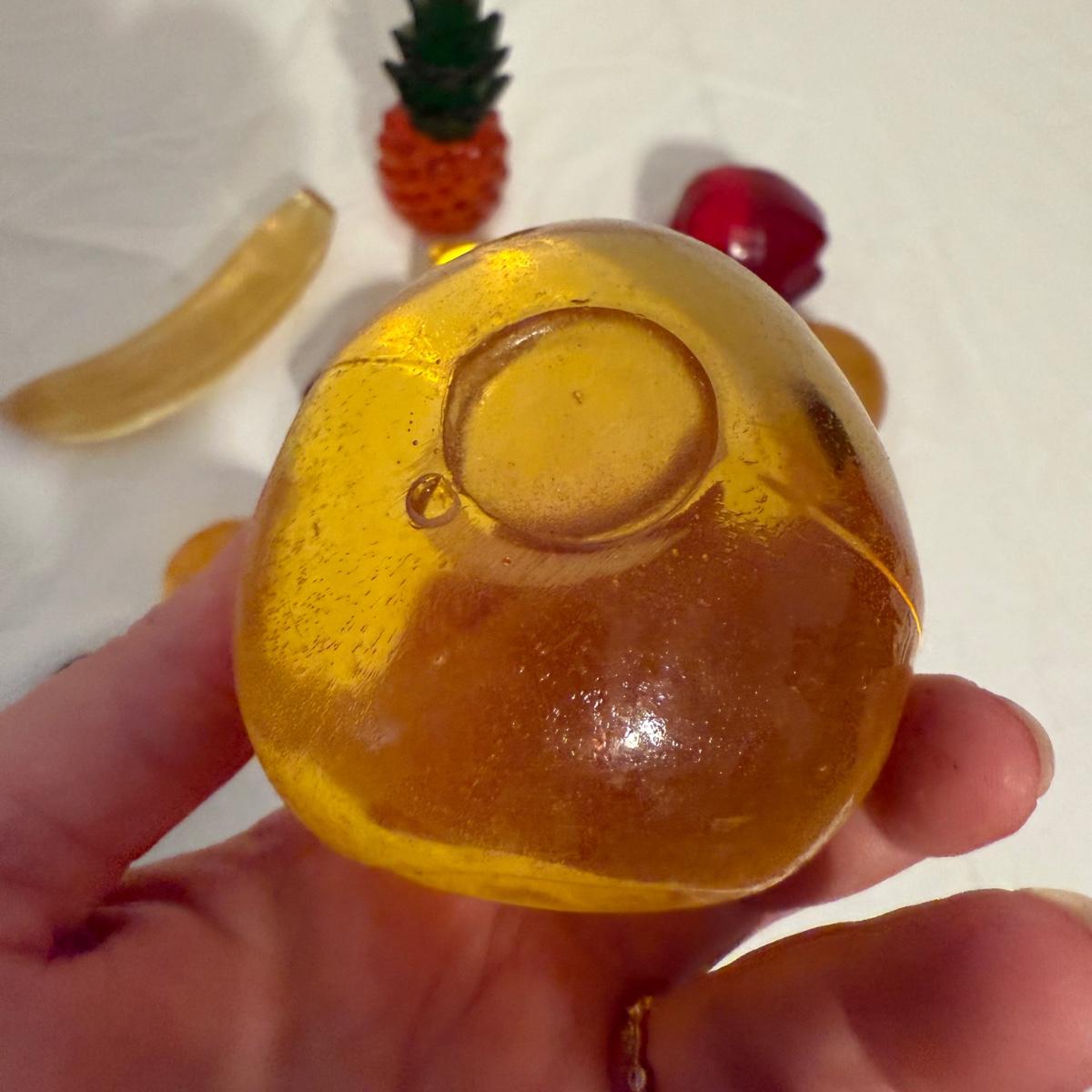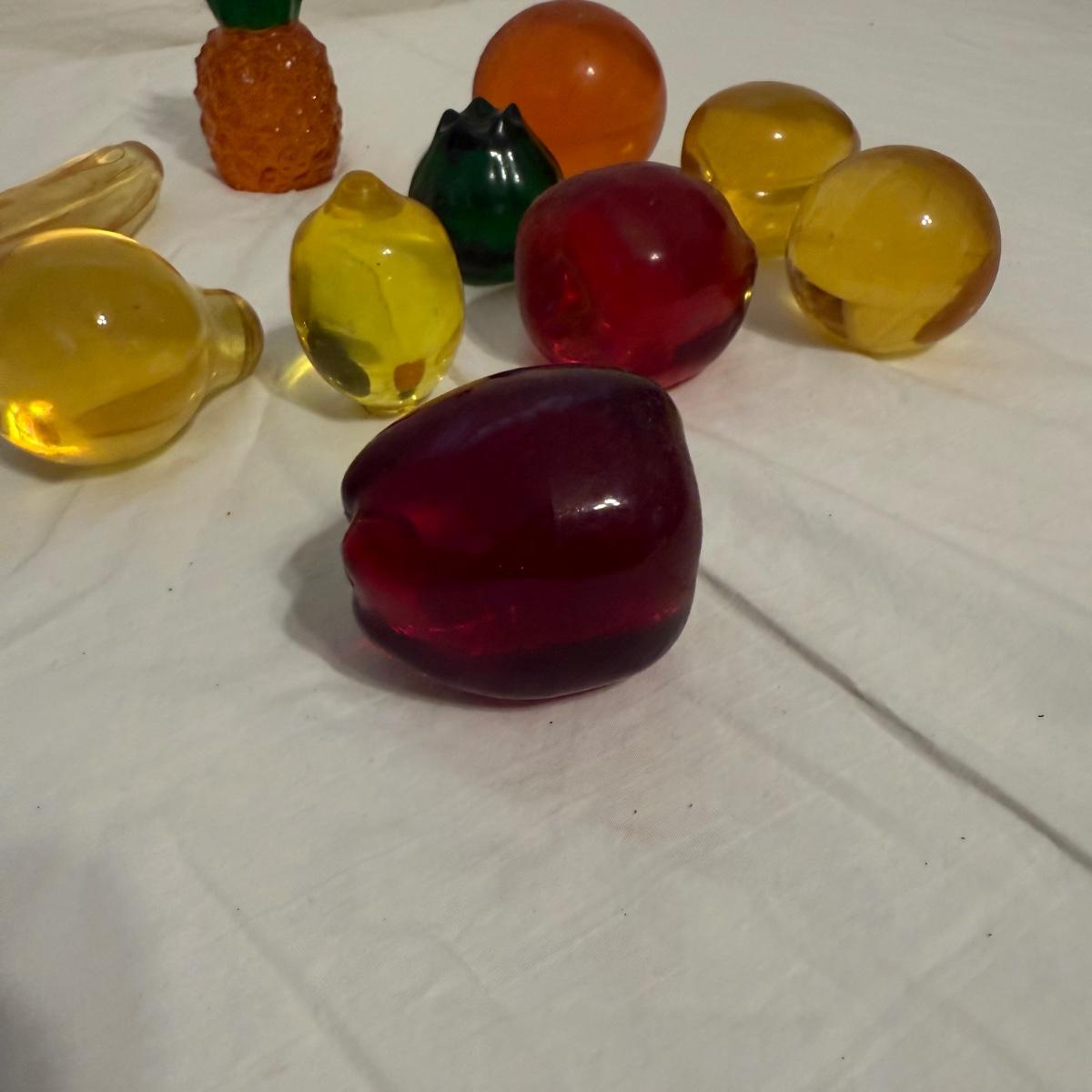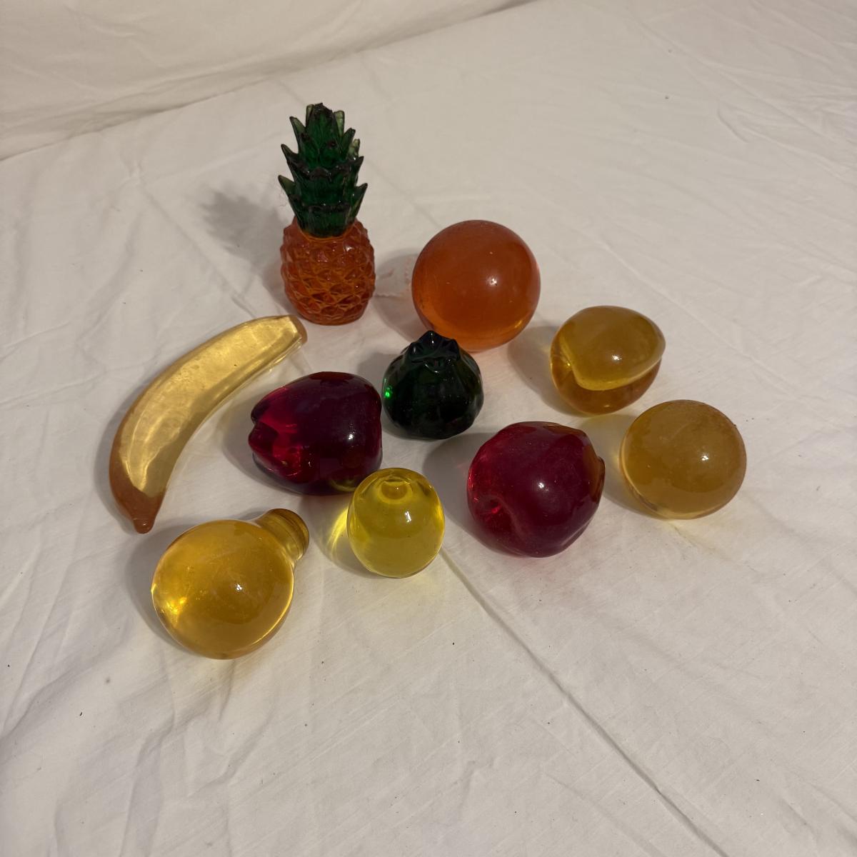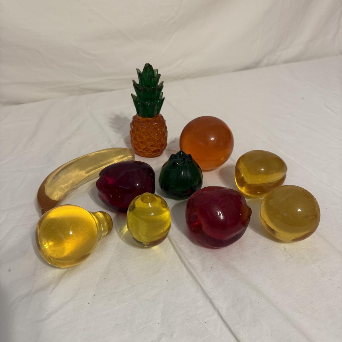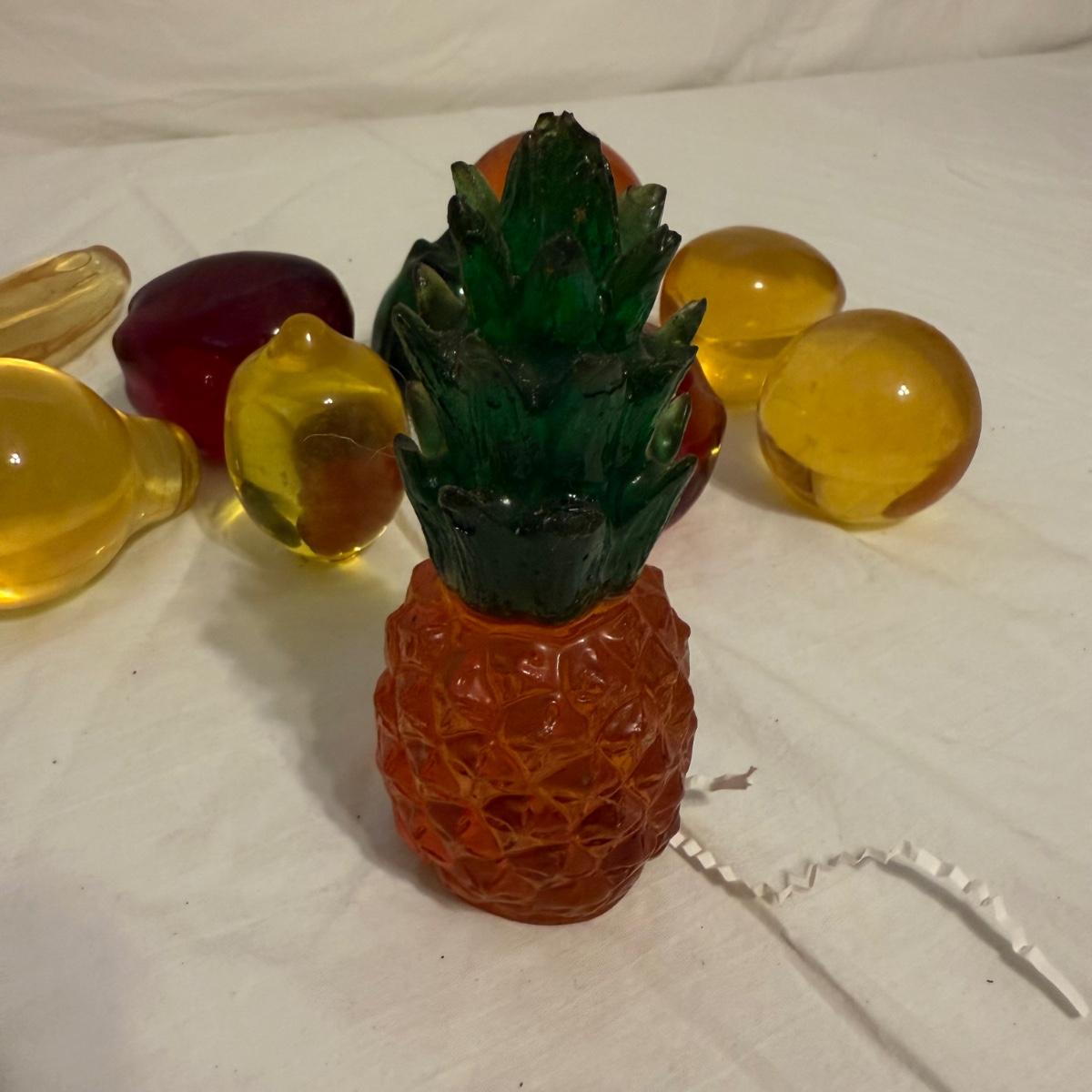 This lot contains ten pieces of seemingly vintage fruit that appear to be lucite or acrylic. This precious assortment contains a banana, pear, lemon, two apples, a pineapple, two oranges, a peach and possibly a pomegranate. The banana measures 7” x 1”H and the pineapple measures 2”D x 5.5”H. Most have little divots on them so they sit securely and don’t roll around. Shipping available.