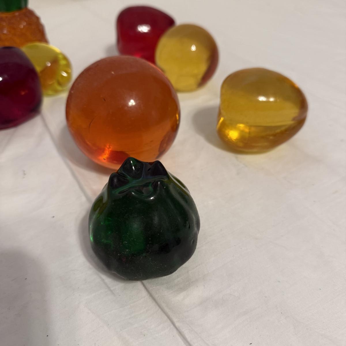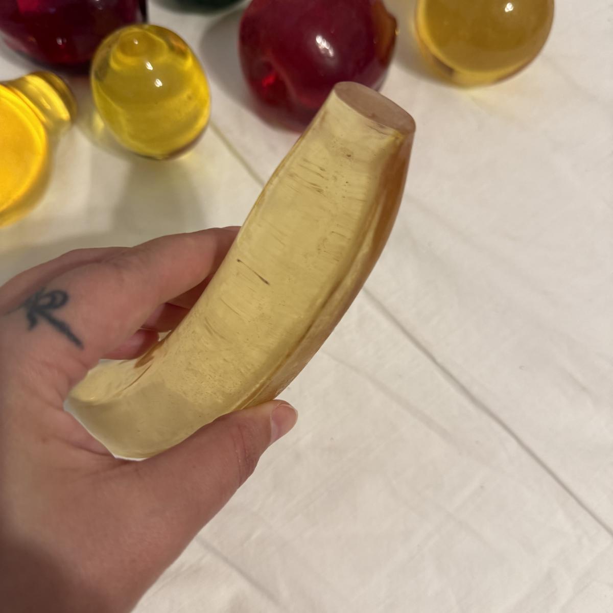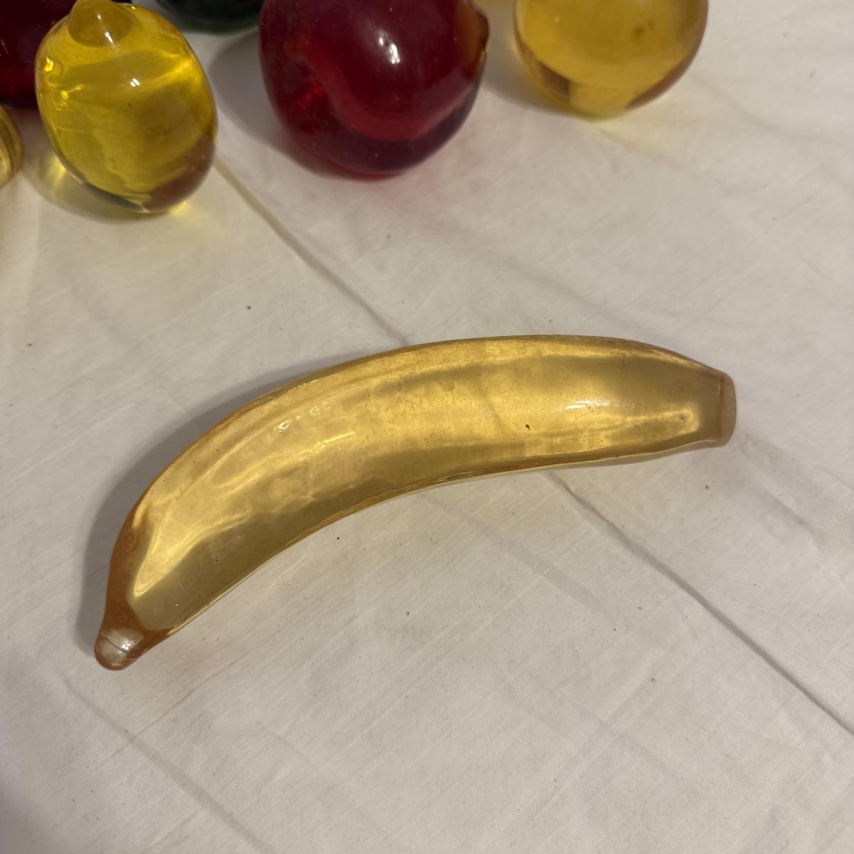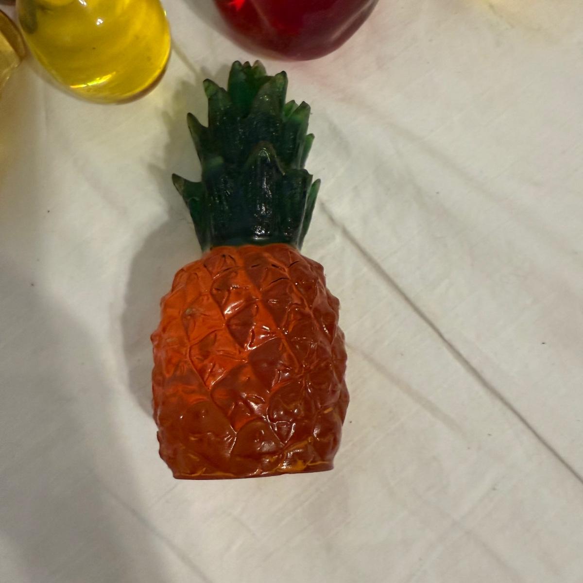This lot contains ten pieces of seemingly vintage fruit that appear to be lucite or acrylic. This precious assortment contains a banana, pear, lemon, two apples, a pineapple, two oranges, a peach and possibly a pomegranate. The banana measures 7” x 1”H and the pineapple measures 2”D x 5.5”H. Most have little divots on them so they sit securely and don’t roll around. Shipping available.
