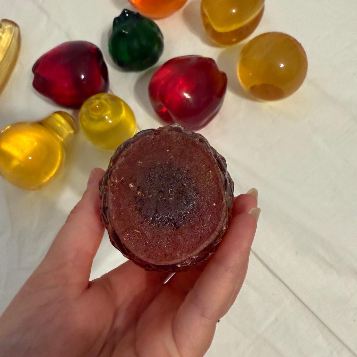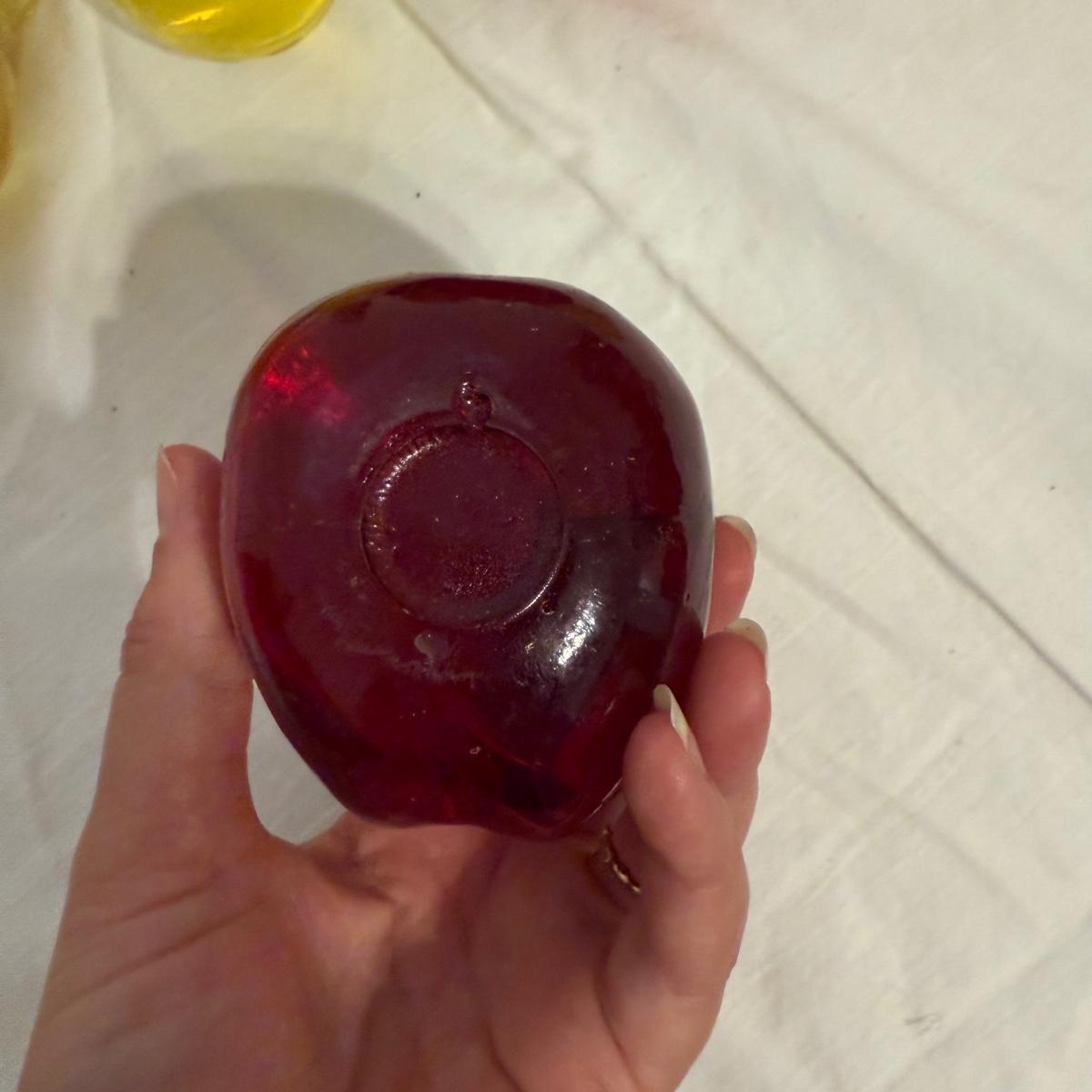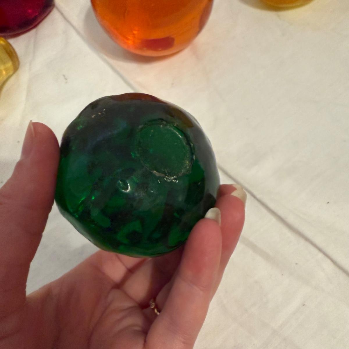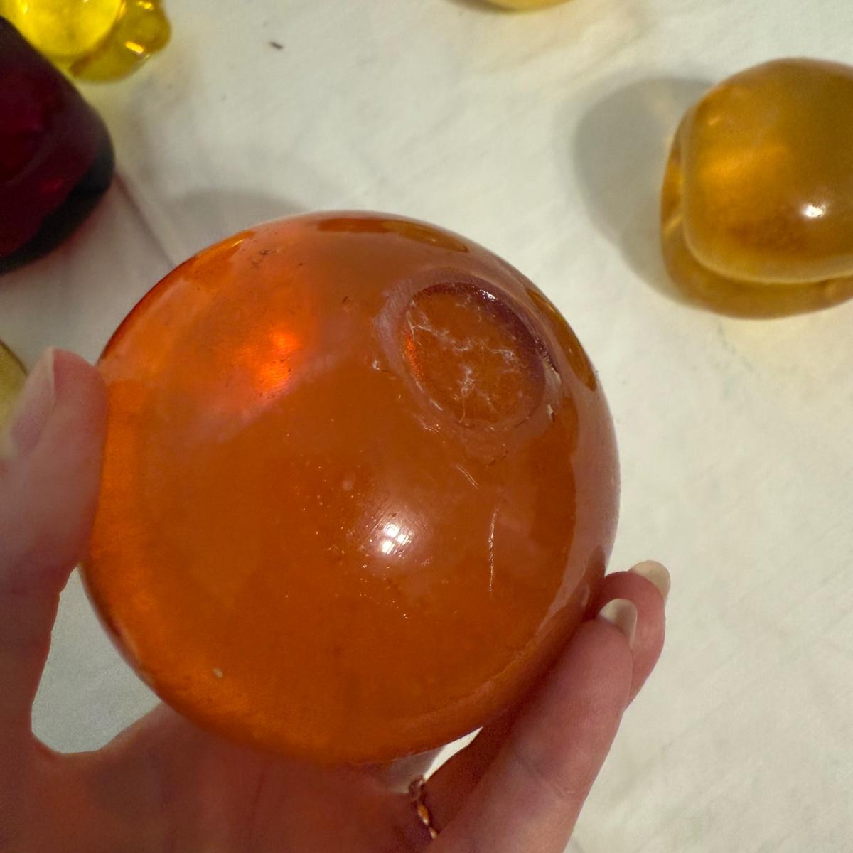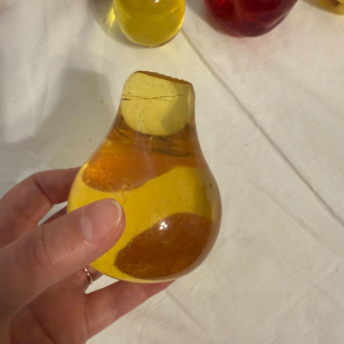 This lot contains ten pieces of seemingly vintage fruit that appear to be lucite or acrylic. This precious assortment contains a banana, pear, lemon, two apples, a pineapple, two oranges, a peach and possibly a pomegranate. The banana measures 7” x 1”H and the pineapple measures 2”D x 5.5”H. Most have little divots on them so they sit securely and don’t roll around. Shipping available.