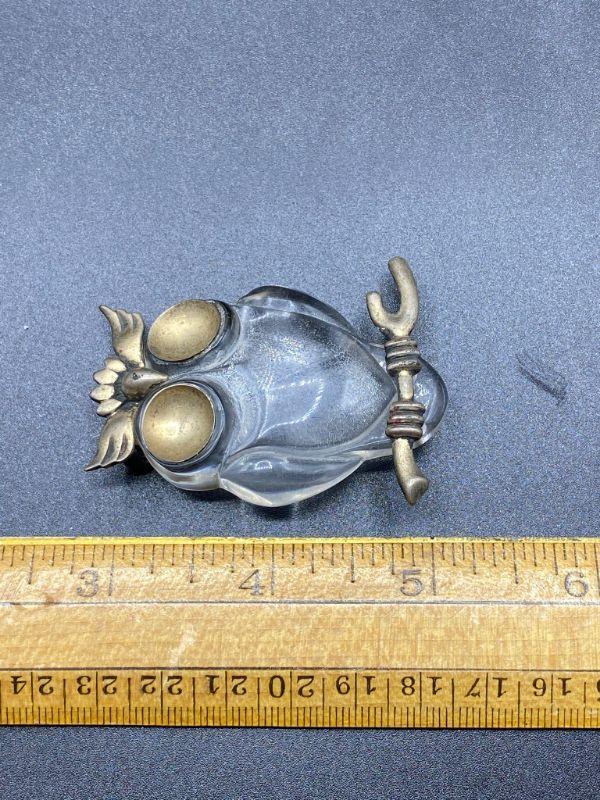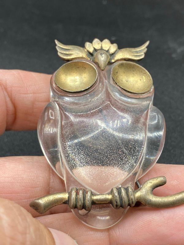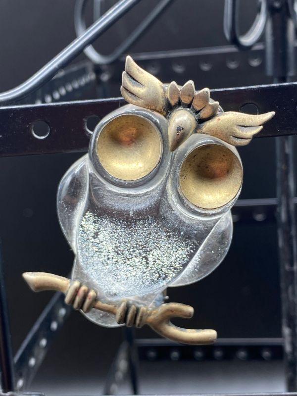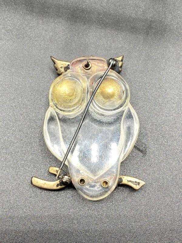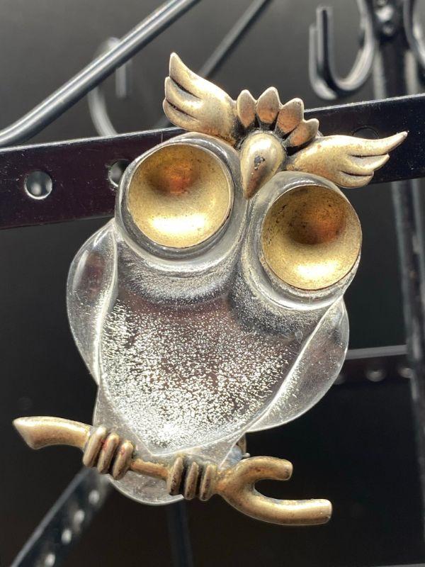 Vintage lucite owl pin. Gold tone accents. About 2" size. There is what looks like wear to the owl body, not sure if it suppose to be that way, like texture.