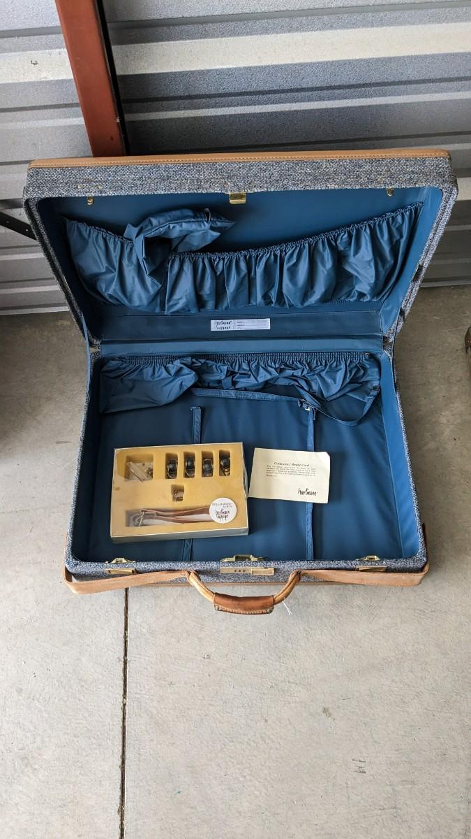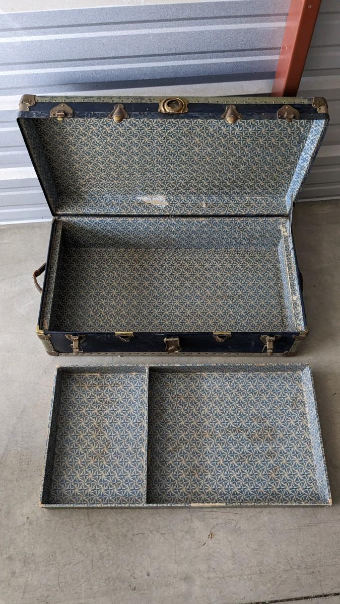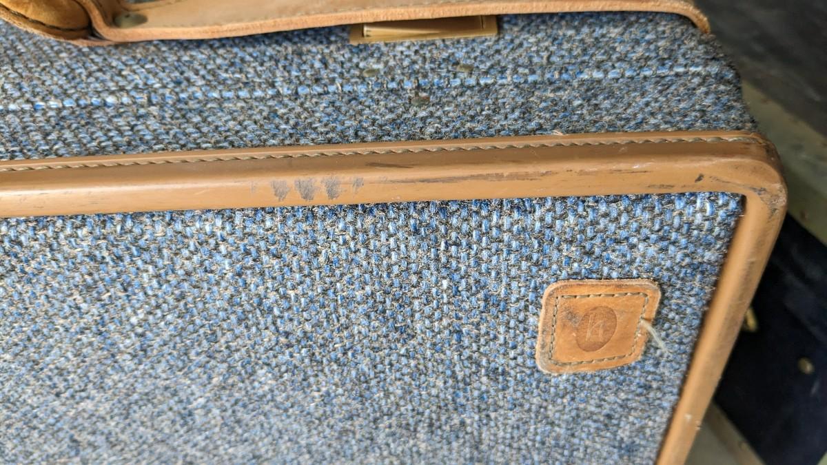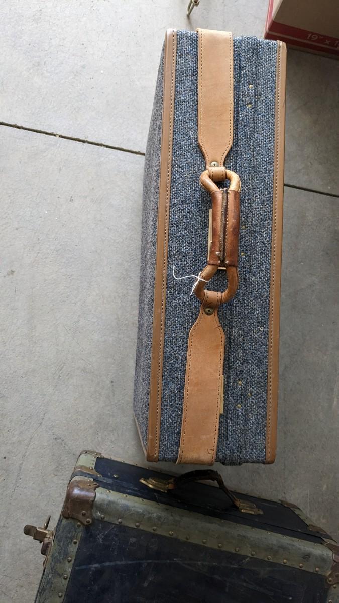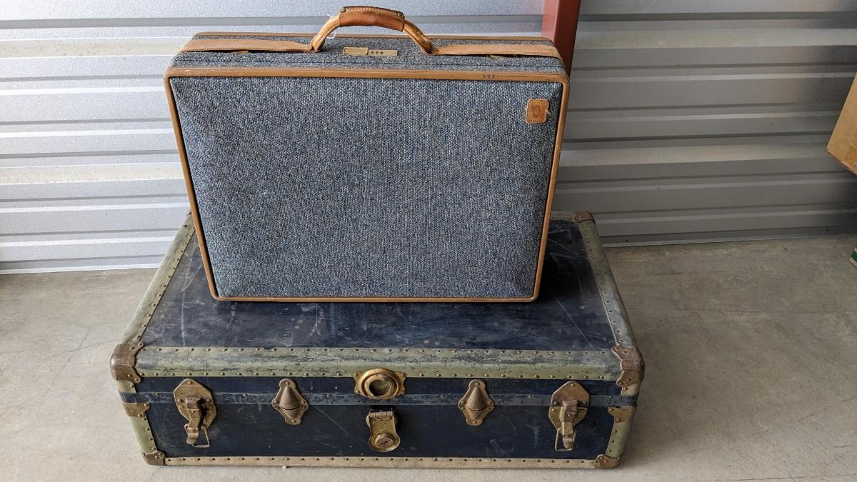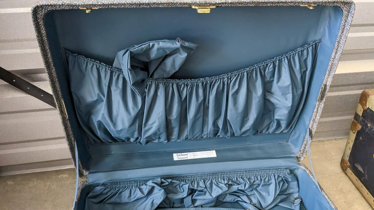 2 beautiful blue tone vintage pieces of luggage. Includes 36"x19.75"x 12" leather handle steamer trunk with original insert, minor interior wear is noted with exterior wear showing in accordance to age, both leather handles are intact, no key. Also includes beautiful tweed Hartmann luggage with original casters and other hardware, this piece was never used and is in phenomenal condition with leather embellishments, note very minimal scuffing to edges. No shipping, 2616
