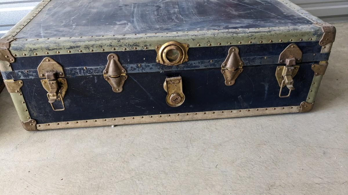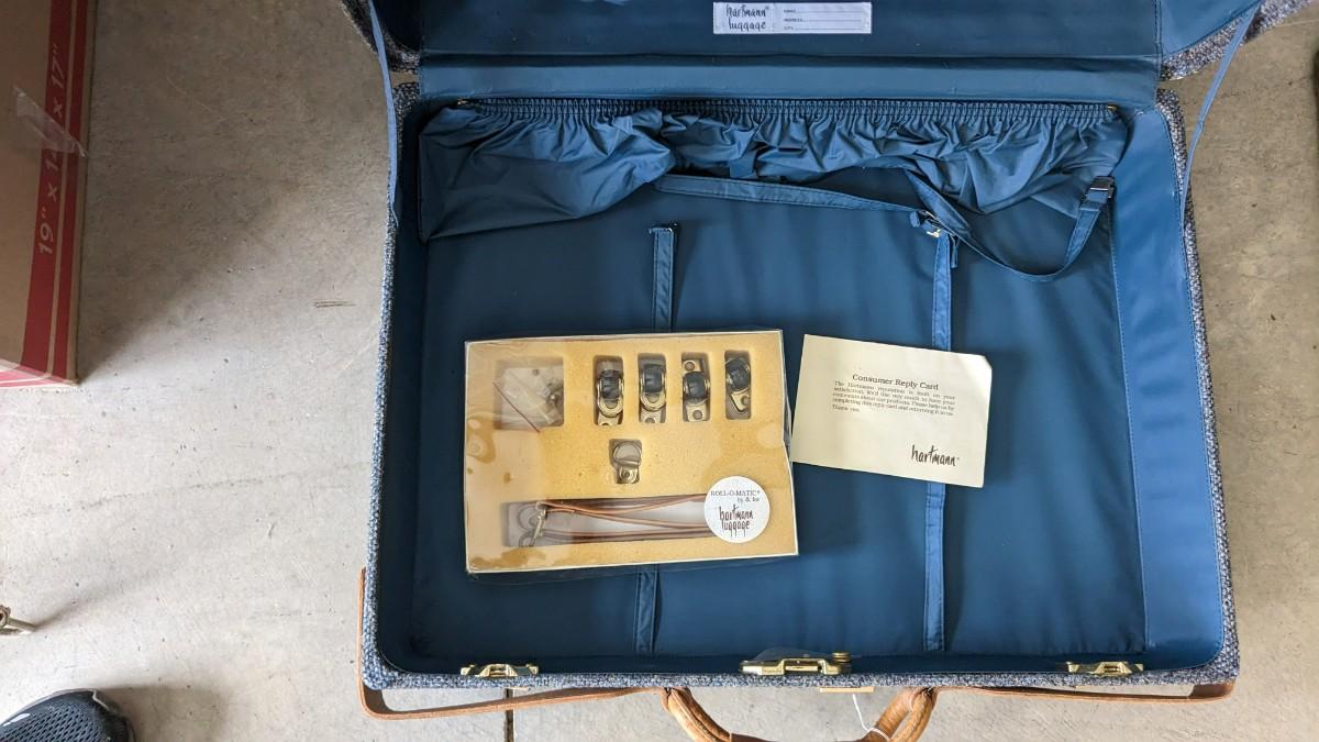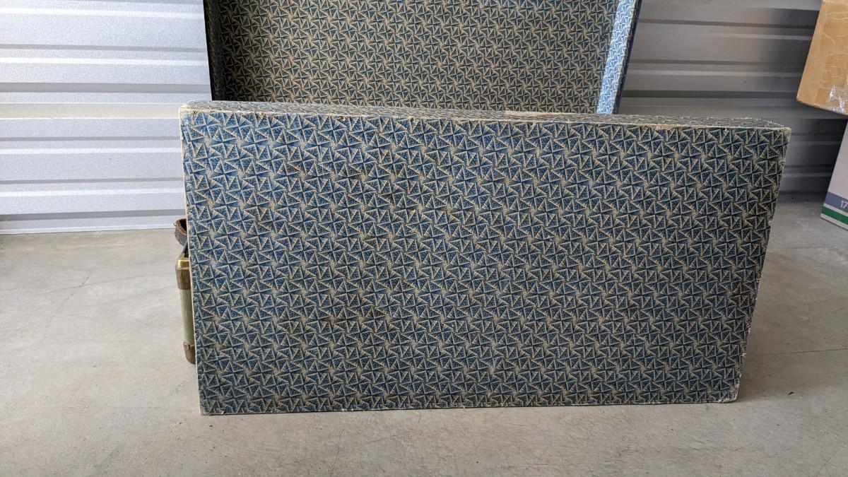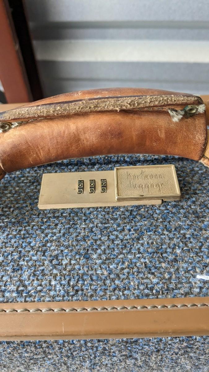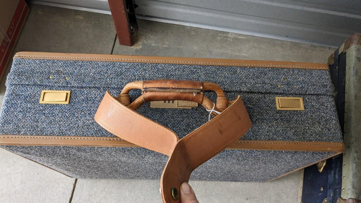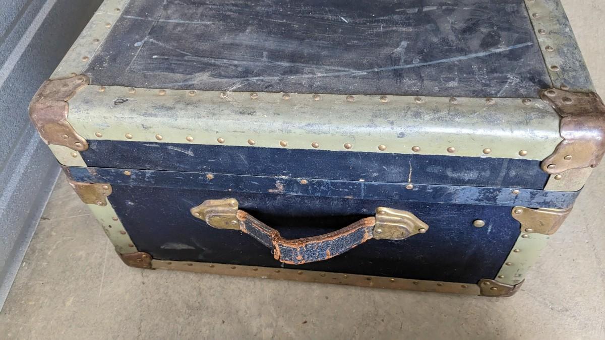 2 beautiful blue tone vintage pieces of luggage. Includes 36"x19.75"x 12" leather handle steamer trunk with original insert, minor interior wear is noted with exterior wear showing in accordance to age, both leather handles are intact, no key. Also includes beautiful tweed Hartmann luggage with original casters and other hardware, this piece was never used and is in phenomenal condition with leather embellishments, note very minimal scuffing to edges. No shipping, 2616