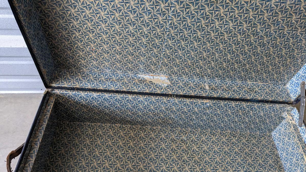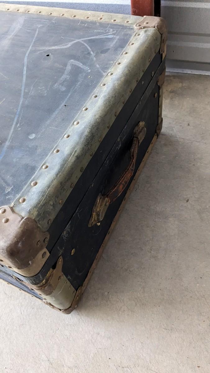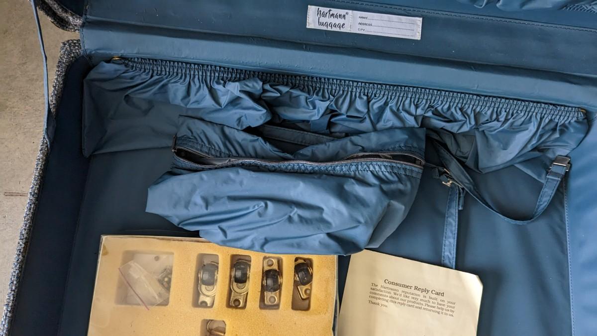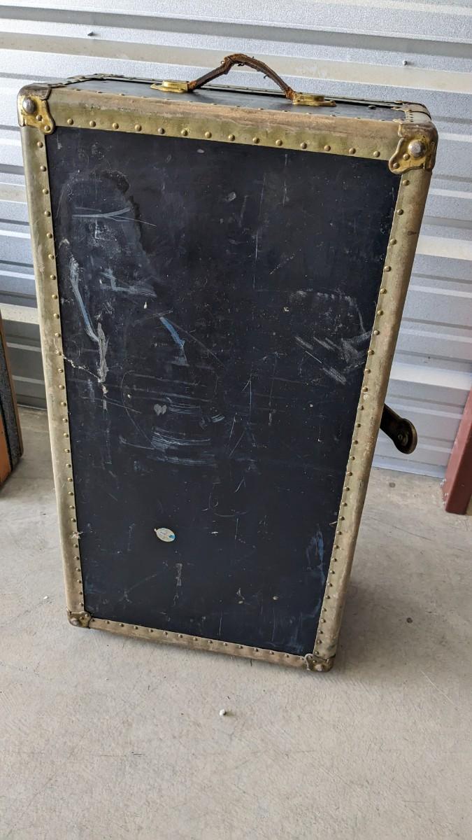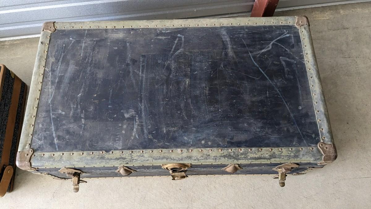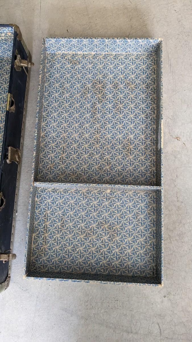 2 beautiful blue tone vintage pieces of luggage. Includes 36"x19.75"x 12" leather handle steamer trunk with original insert, minor interior wear is noted with exterior wear showing in accordance to age, both leather handles are intact, no key. Also includes beautiful tweed Hartmann luggage with original casters and other hardware, this piece was never used and is in phenomenal condition with leather embellishments, note very minimal scuffing to edges. No shipping, 2616