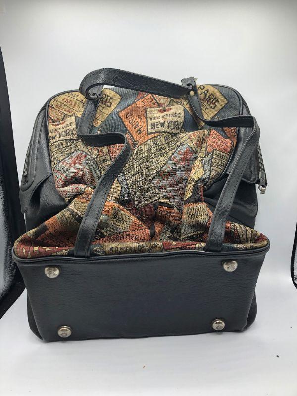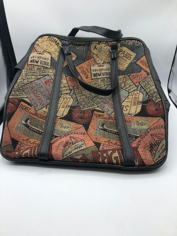 Vintage luggage hand bag carry on. Has a vacation postcard pattern. Good condition.