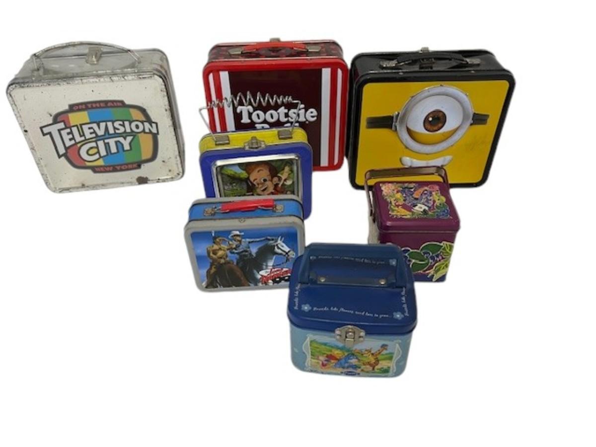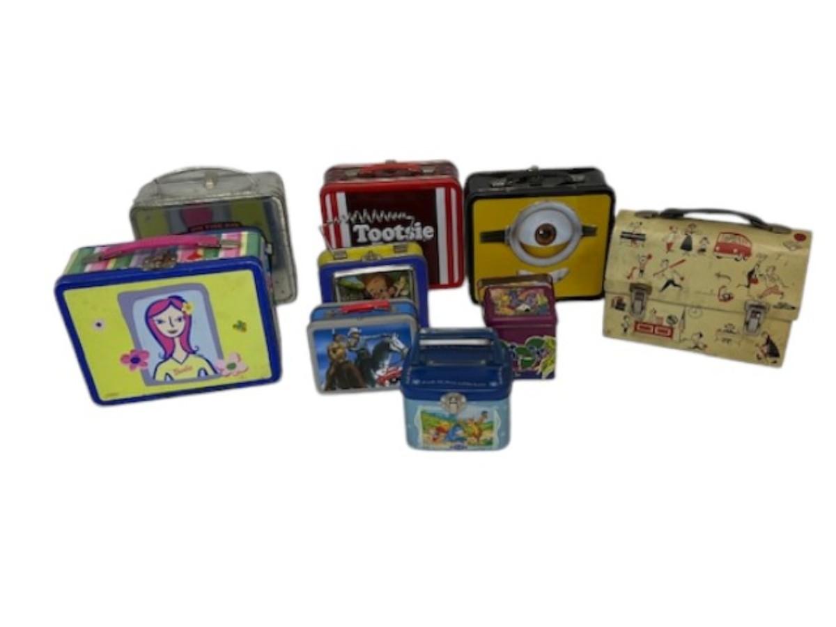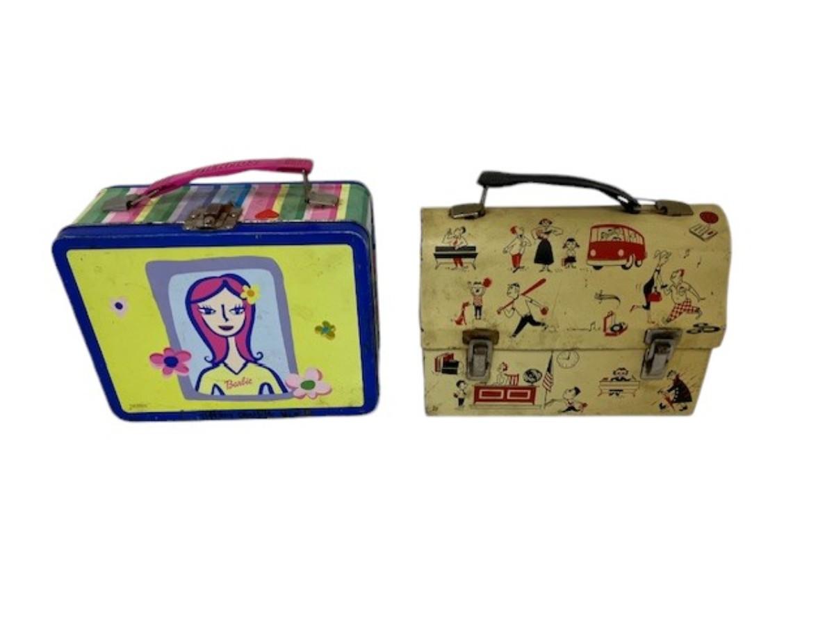 Includes a 1950s American Thermos, a NOS Television City New York, Barbie, and more. Total of 10 pieces. All are metal construction. [VY]