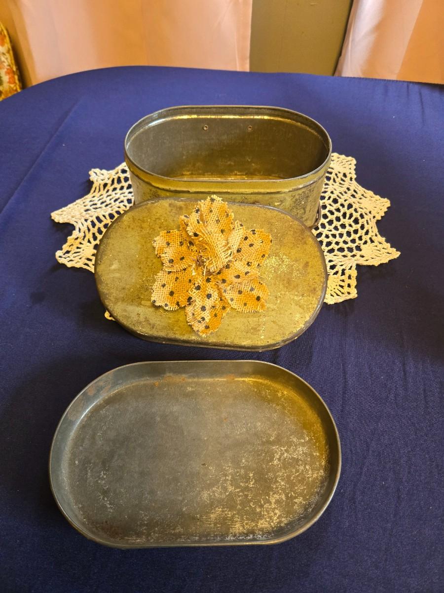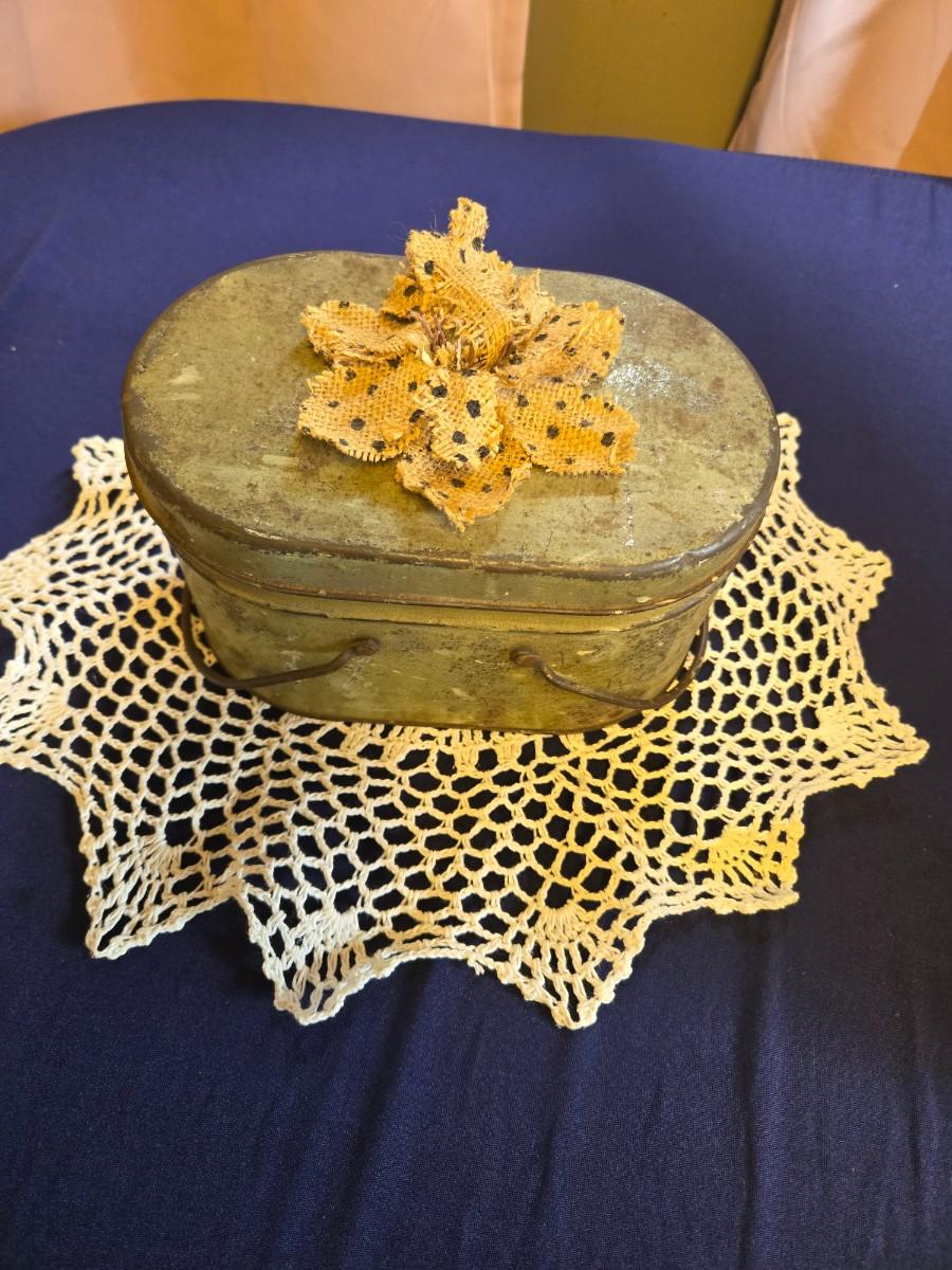Vintage decorated lunch pail with insert & a hand crocheted doily