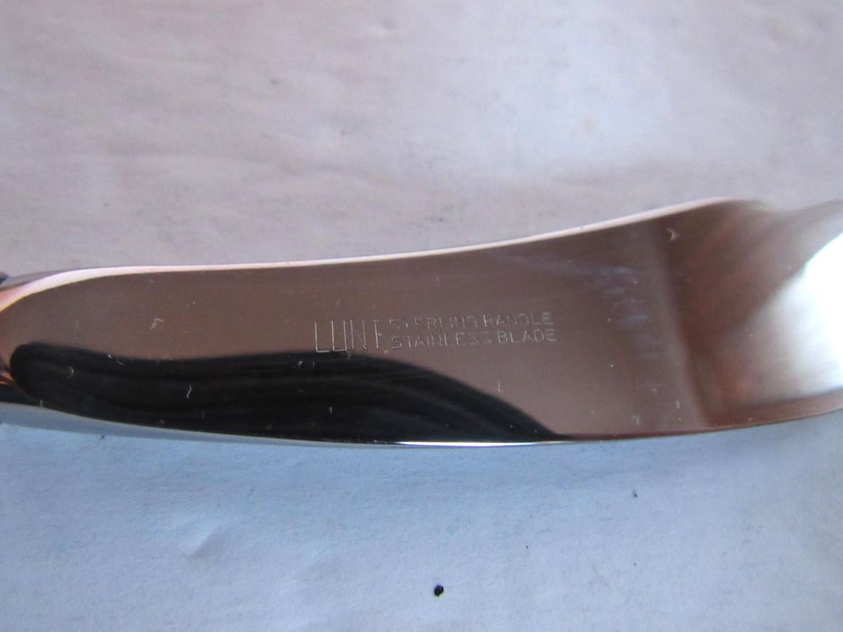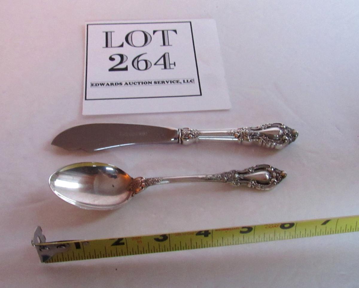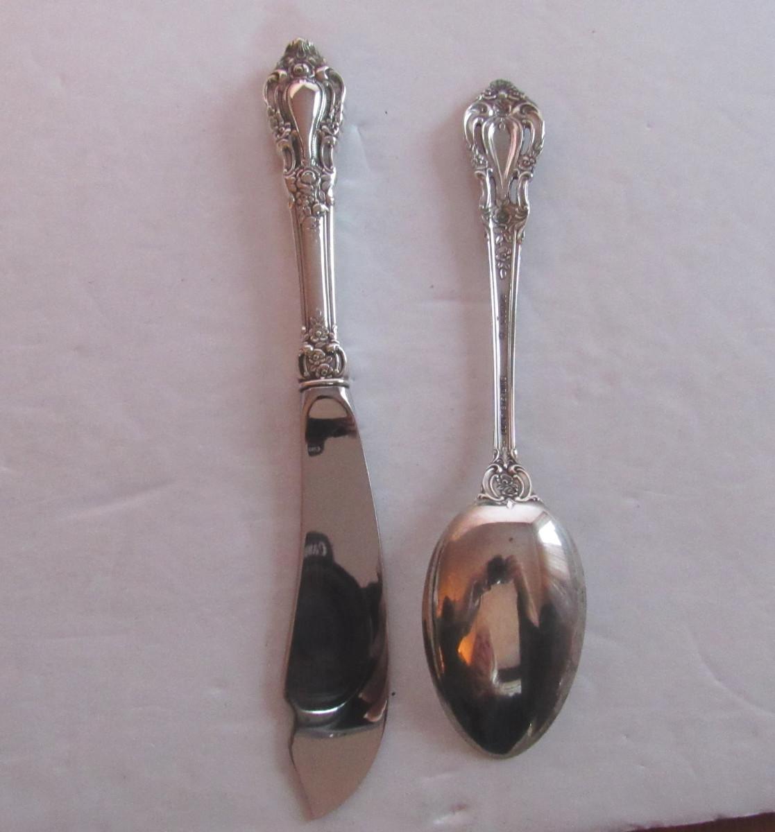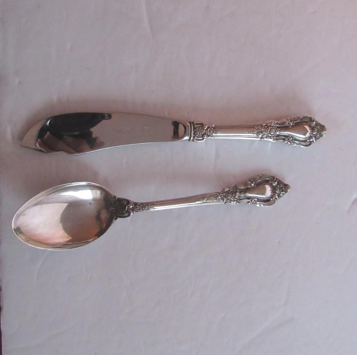 Very pretty fancy pattern, nice shape. One tiny dark spot on spoon. Stainless blade, Sterling handle on knife. Highly sought after pattern. Shipping available at actual cost plus $5.00 handling/supply fee per box. See our terms for details. All sales final.
