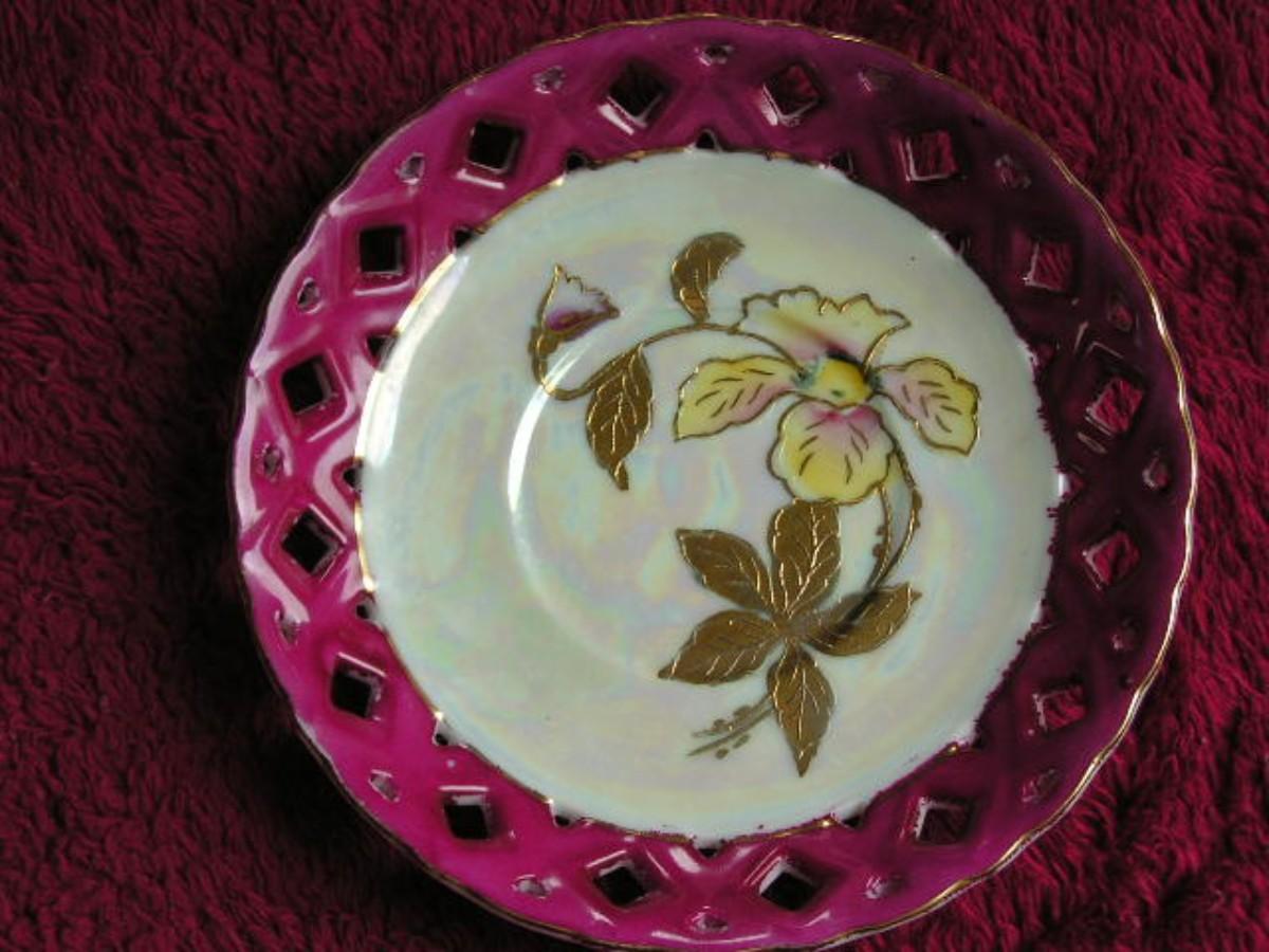 Vintage Lusterware (Japan) footed teacup & reticulated saucer hand painted