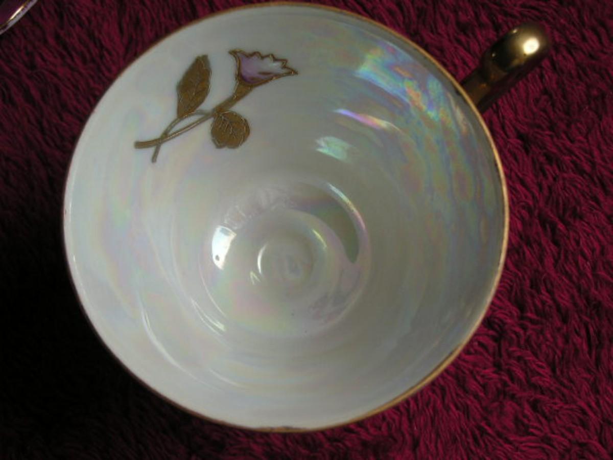 Vintage Lusterware (Japan) footed teacup & saucer mid-20th century, iridescent pearlescent finish, hand painted w/gold accents, reticulated saucer.