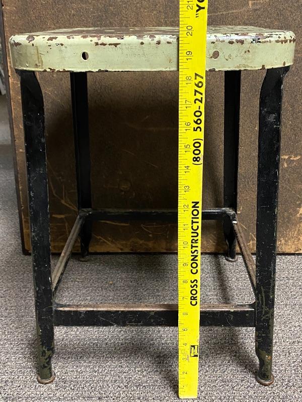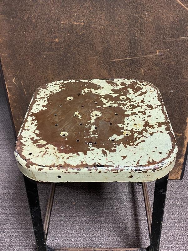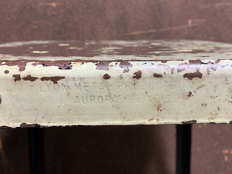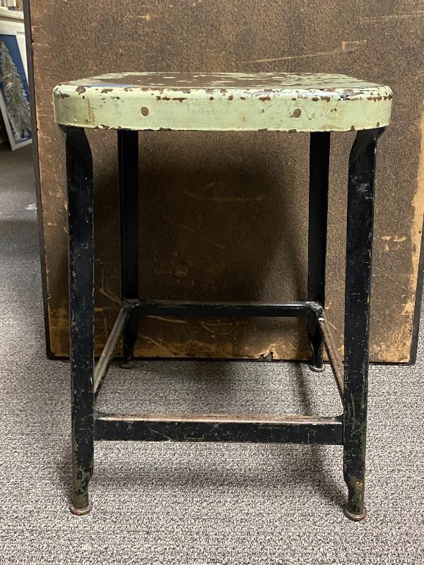 Vintage metal stool. Made by Lyon Metal Productions. Paint is scratched up but the stool is sturdy. Sits at 20" tall. Great as is or with a fresh coat of paint.