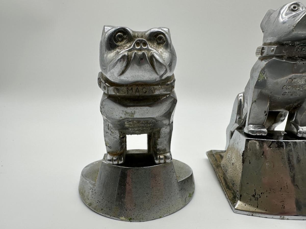 Vintage Mack bulldog hood ornaments made of cast metal with original aged finish. Classic truck mascot design with strong industrial appeal.