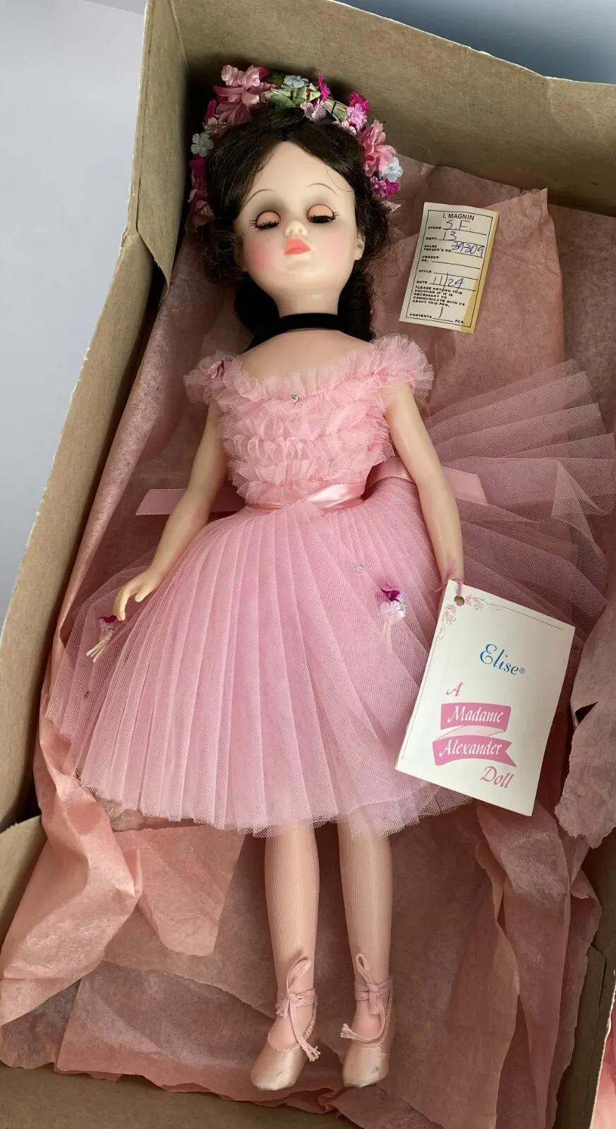 From a collector's estate here is a vintage Madame Alexander "Elise" 17" ballerina doll in pink tutu..all original with tag #1630..Circa 1970s...in original box(mismarked)...she has dark brown hair and black eyes....as shown.
