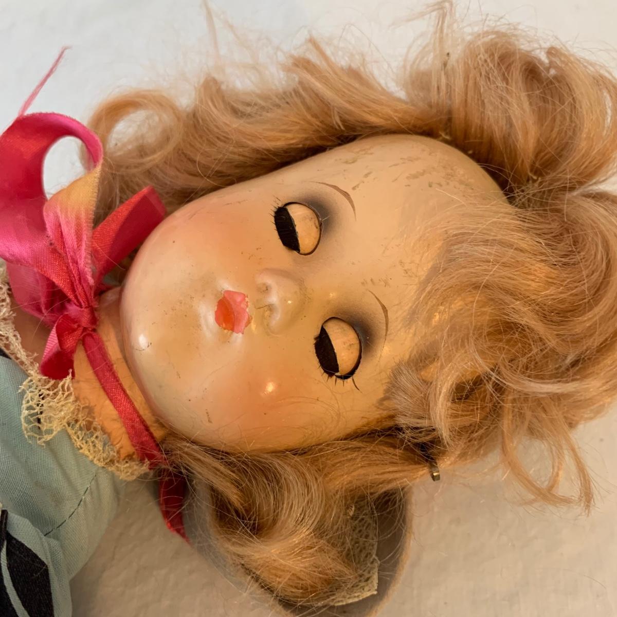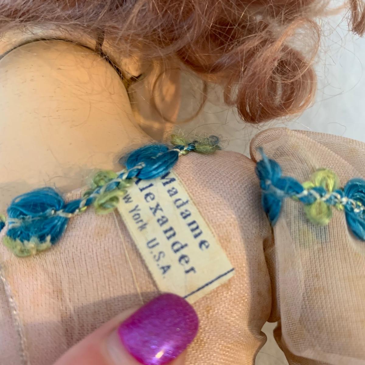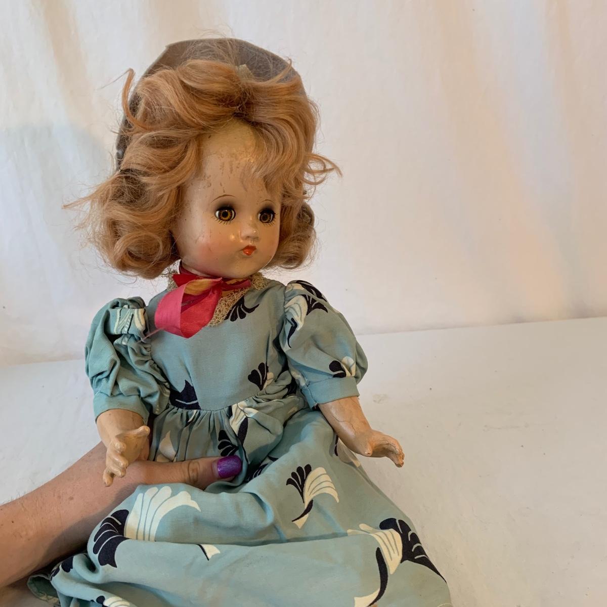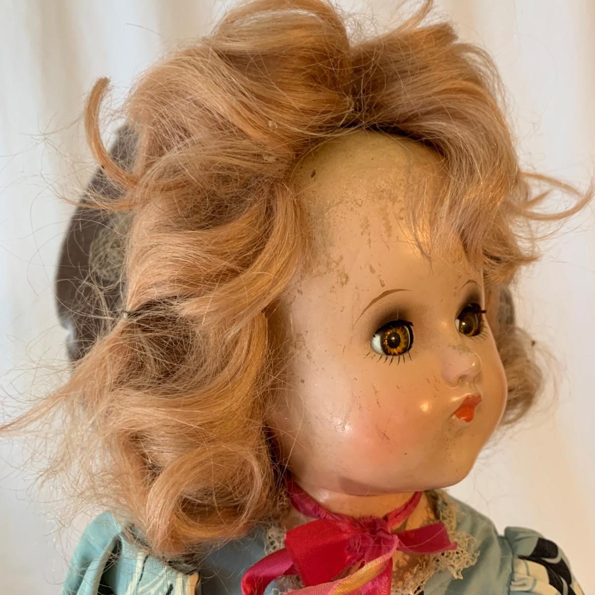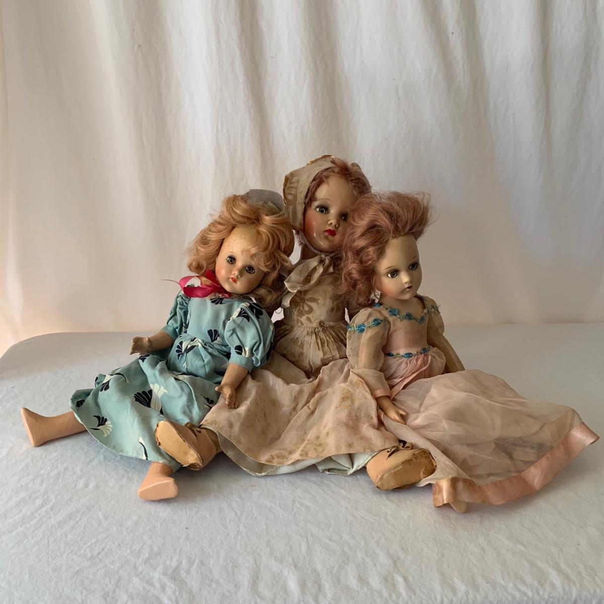 Three vintage baby dolls. All have eyes that open when the doll is upright and close when it is laying down. The doll with the light pink long sleeved dress has a dress tag that reads Madame Alexander and it appears that the back of her neck is branded with MME Alexander as well. All three dolls are in fair condition with cracks and other blemishes apparent on all three, as well as clothing that is quite worn. The largest doll that is wearing shoes is approximately 21” long. This doll and the Madame Alexander can sit upright with no help, but the doll with the blue dress cannot. Shipping available.