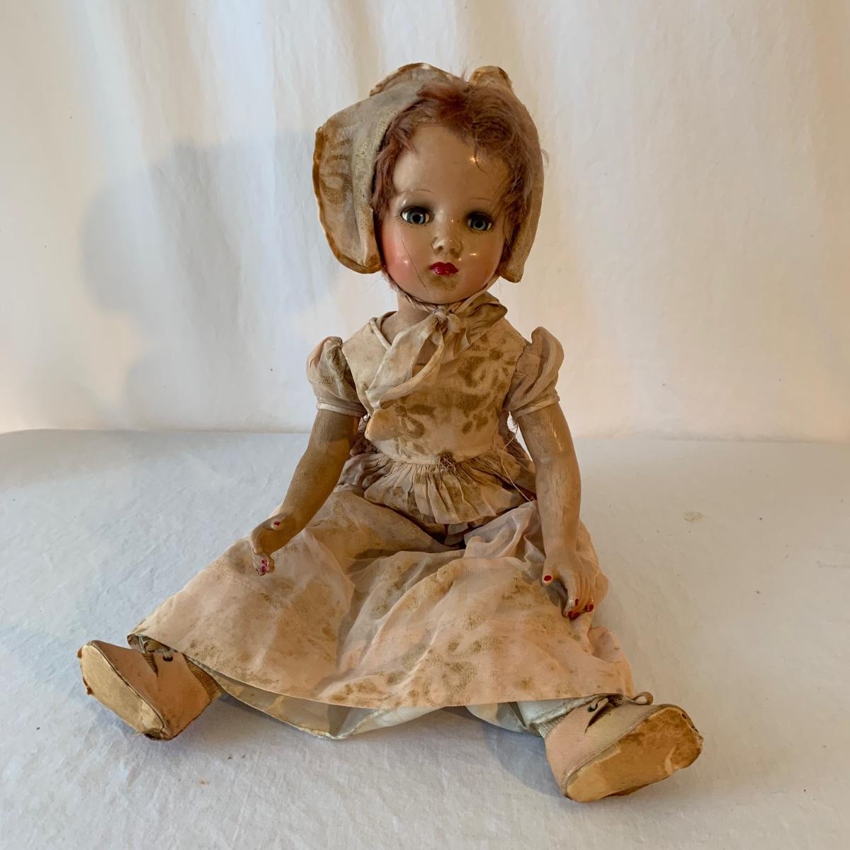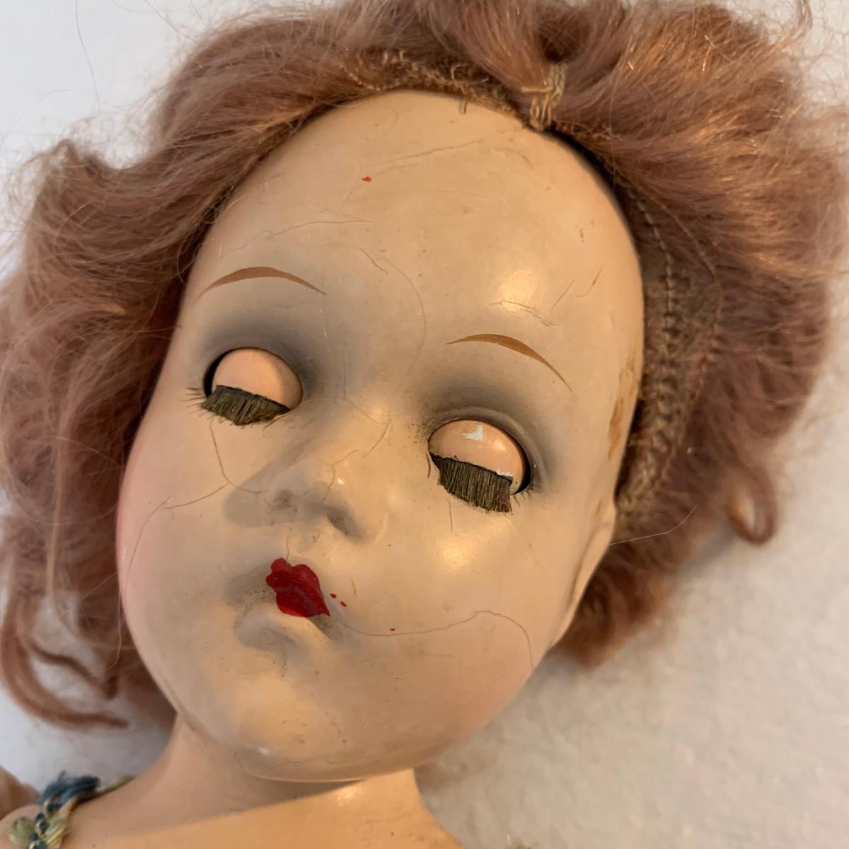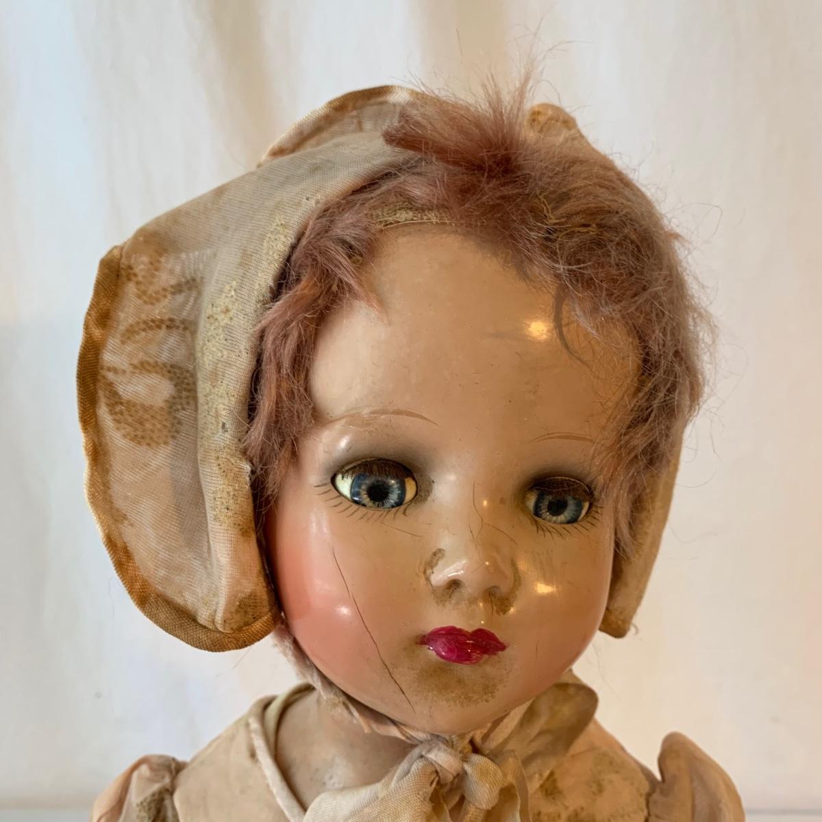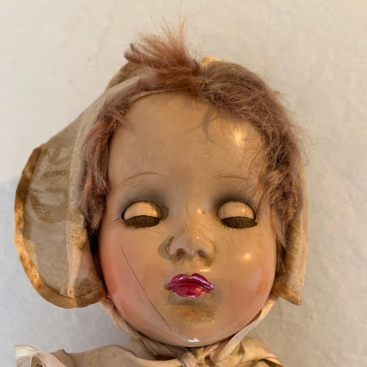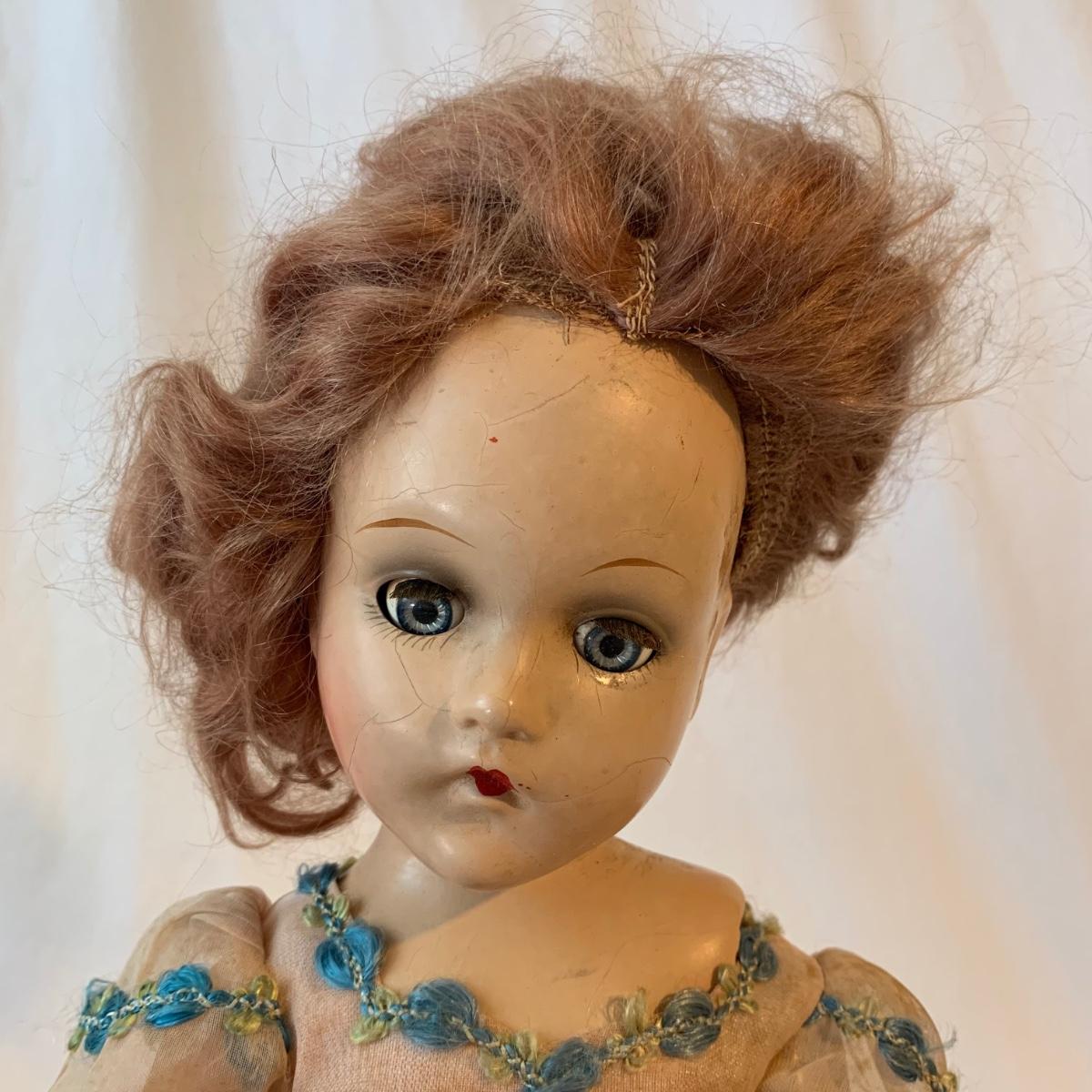 Three vintage baby dolls. All have eyes that open when the doll is upright and close when it is laying down. The doll with the light pink long sleeved dress has a dress tag that reads Madame Alexander and it appears that the back of her neck is branded with MME Alexander as well. All three dolls are in fair condition with cracks and other blemishes apparent on all three, as well as clothing that is quite worn. The largest doll that is wearing shoes is approximately 21” long. This doll and the Madame Alexander can sit upright with no help, but the doll with the blue dress cannot. Shipping available.