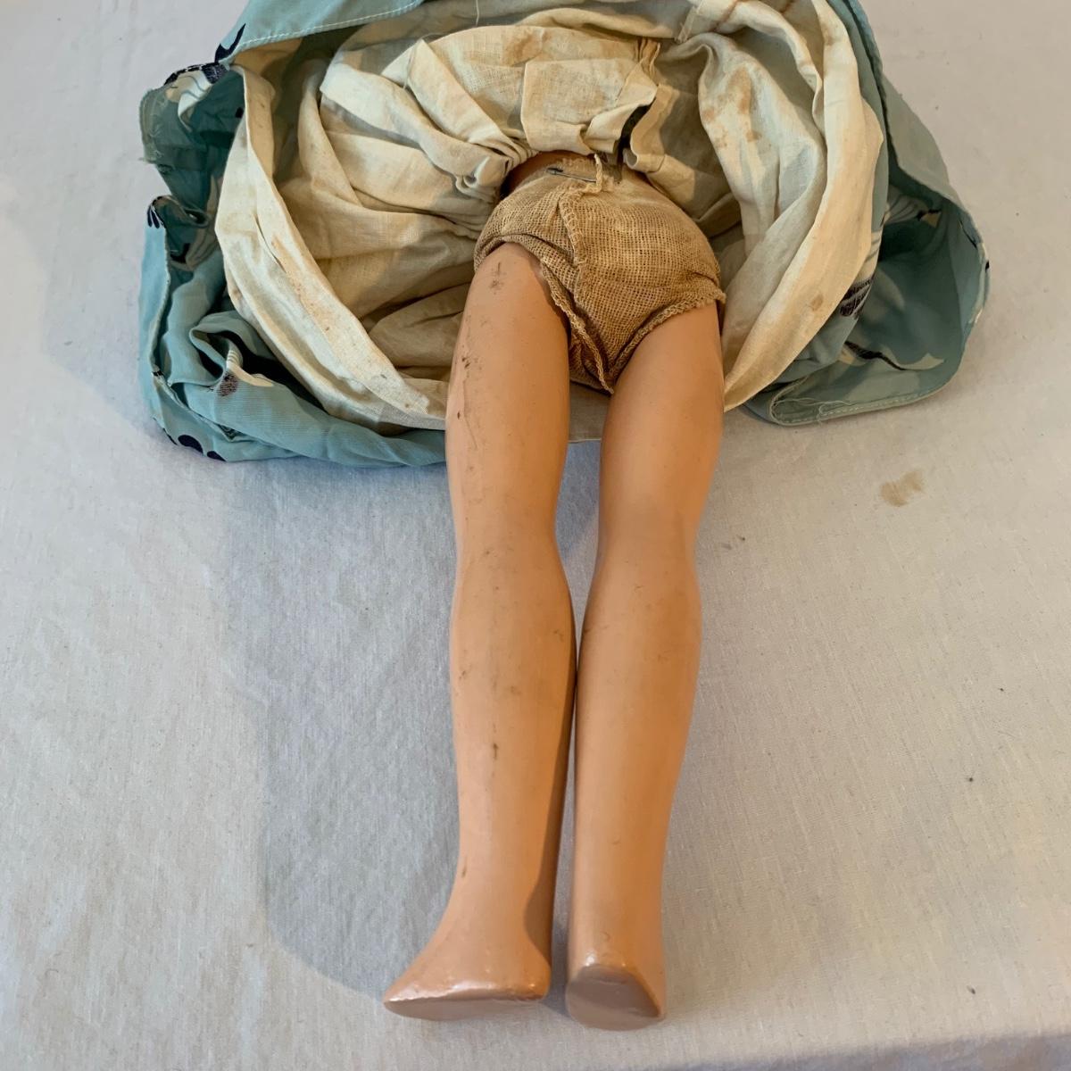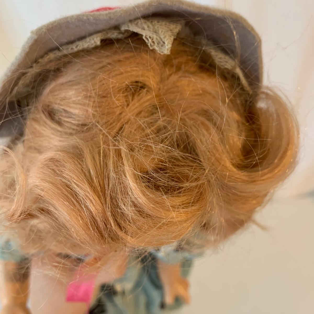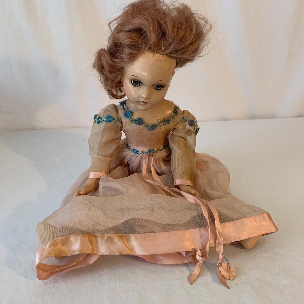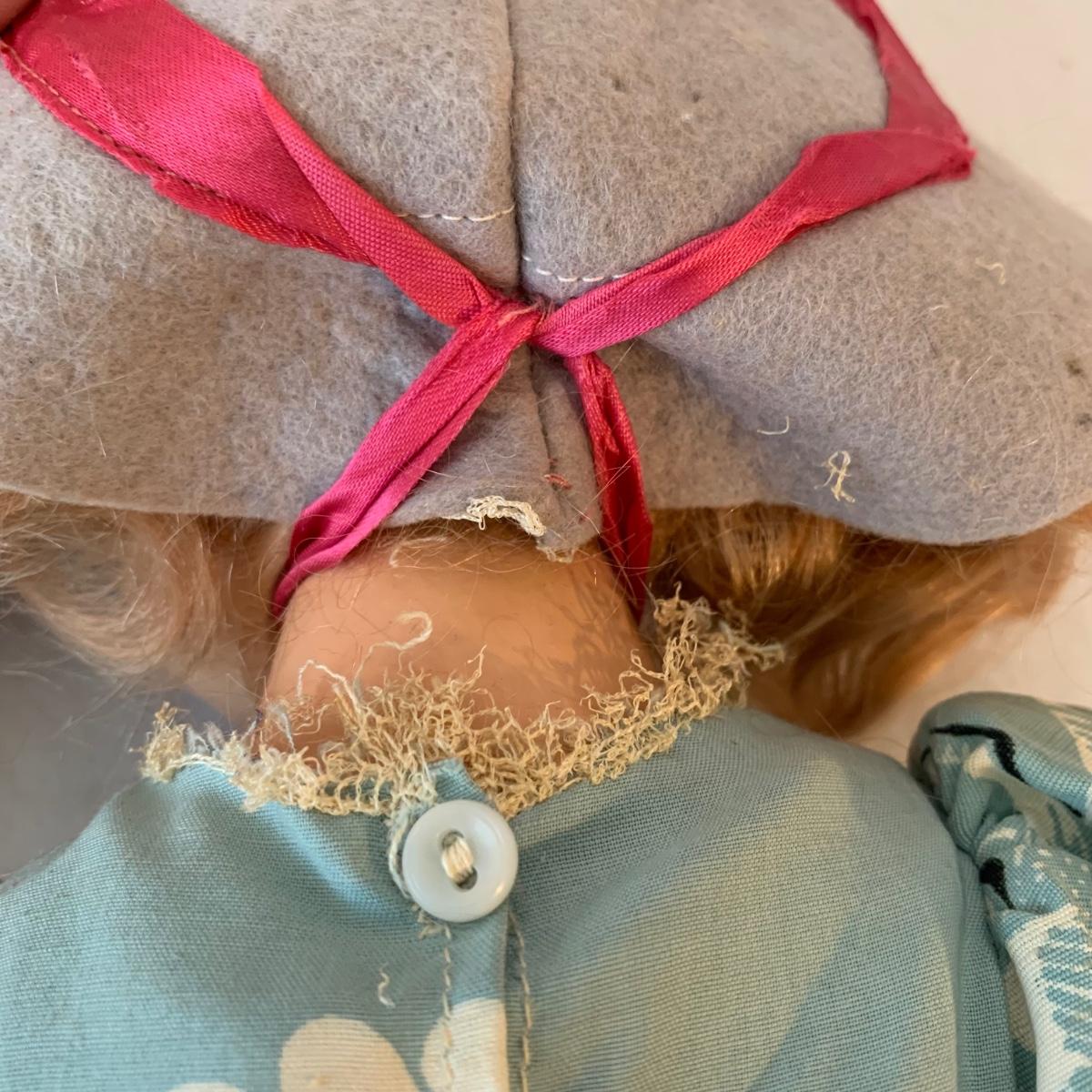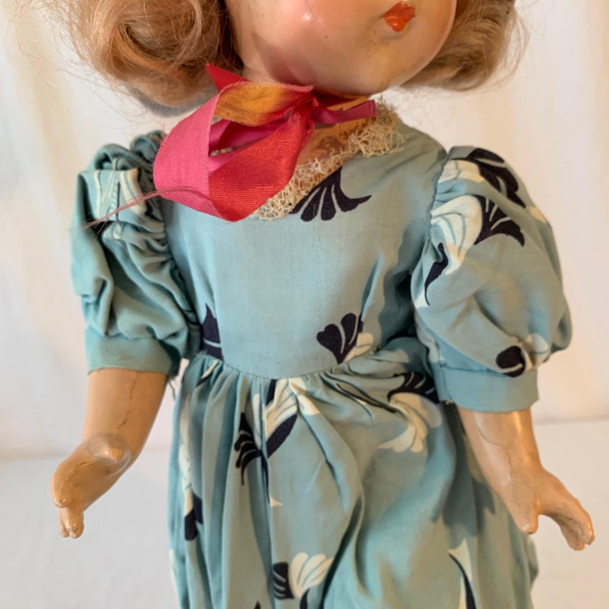 Three vintage baby dolls. All have eyes that open when the doll is upright and close when it is laying down. The doll with the light pink long sleeved dress has a dress tag that reads Madame Alexander and it appears that the back of her neck is branded with MME Alexander as well. All three dolls are in fair condition with cracks and other blemishes apparent on all three, as well as clothing that is quite worn. The largest doll that is wearing shoes is approximately 21” long. This doll and the Madame Alexander can sit upright with no help, but the doll with the blue dress cannot. Shipping available.