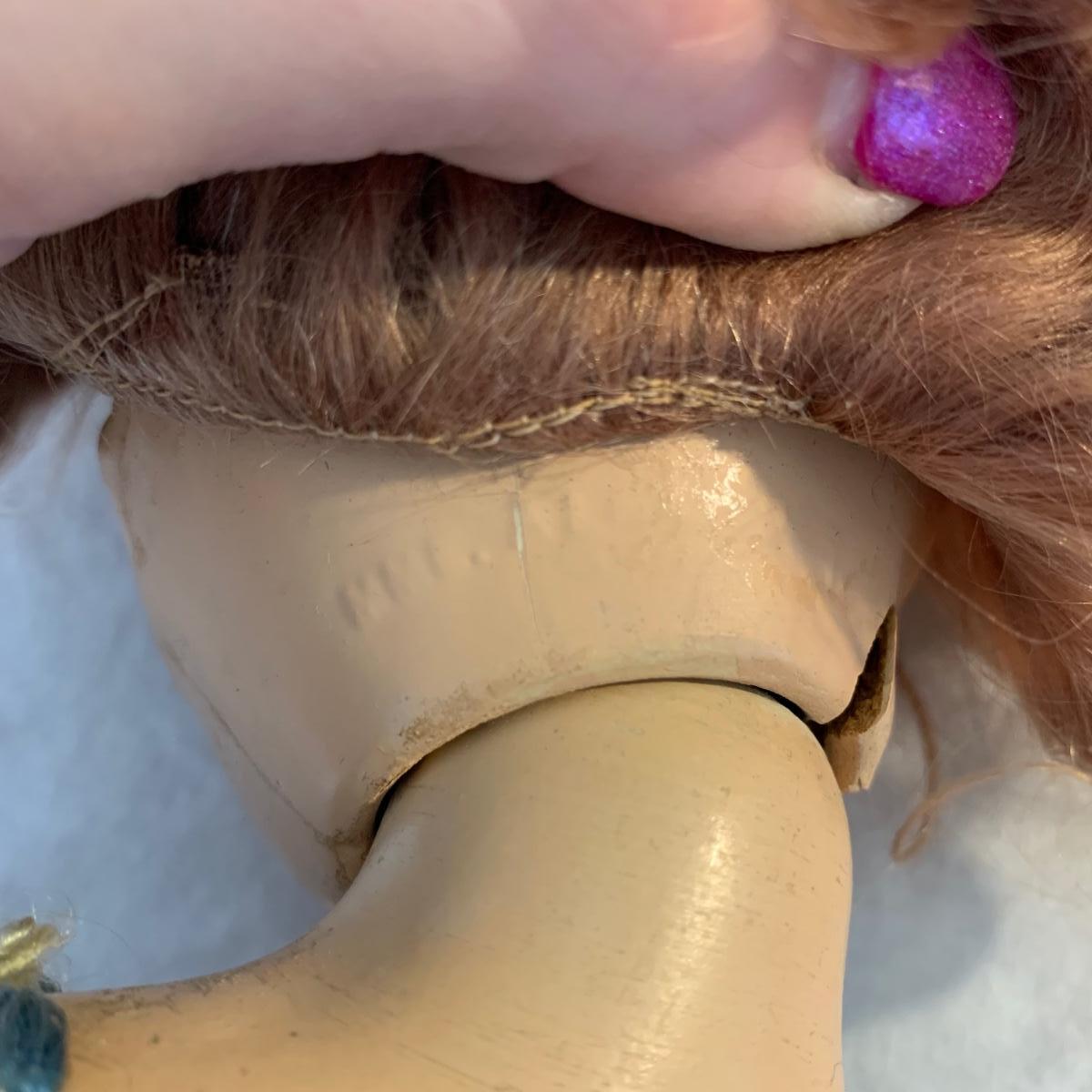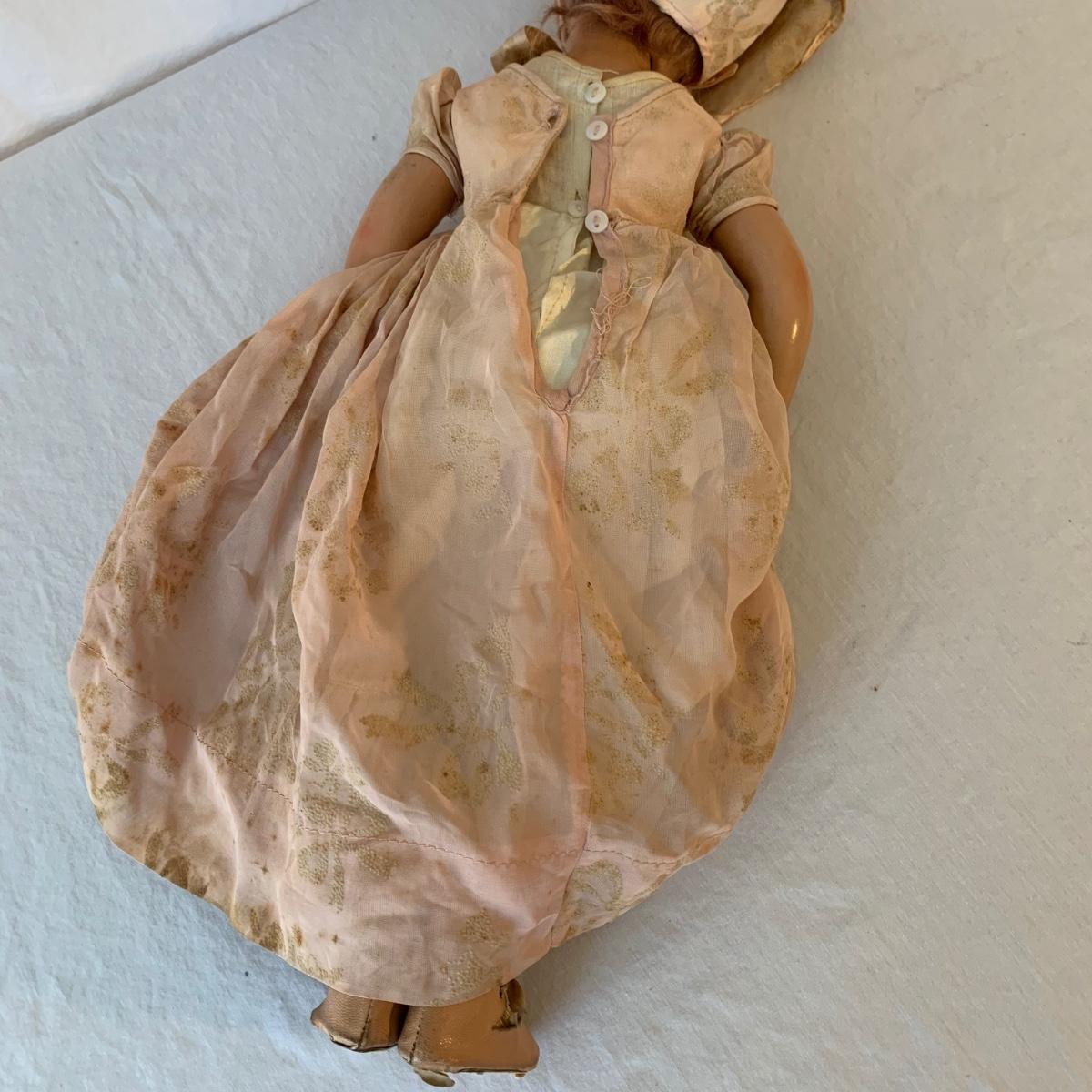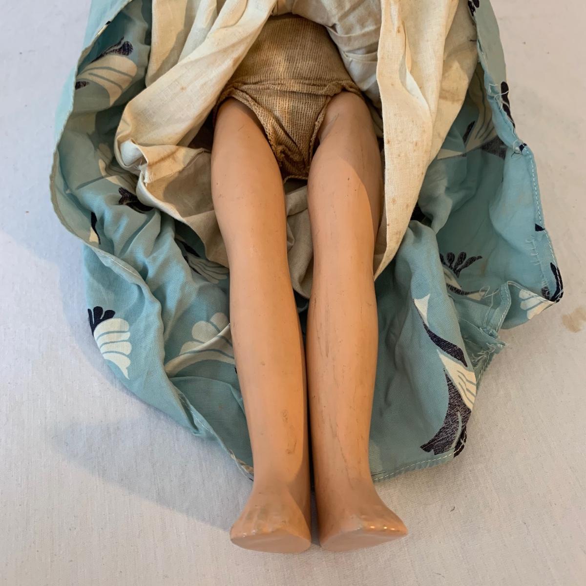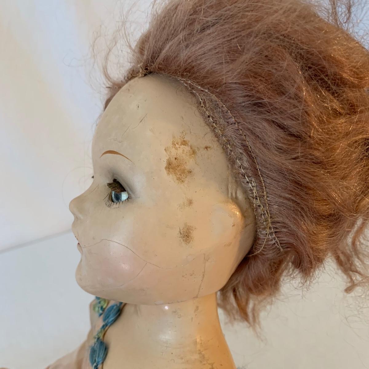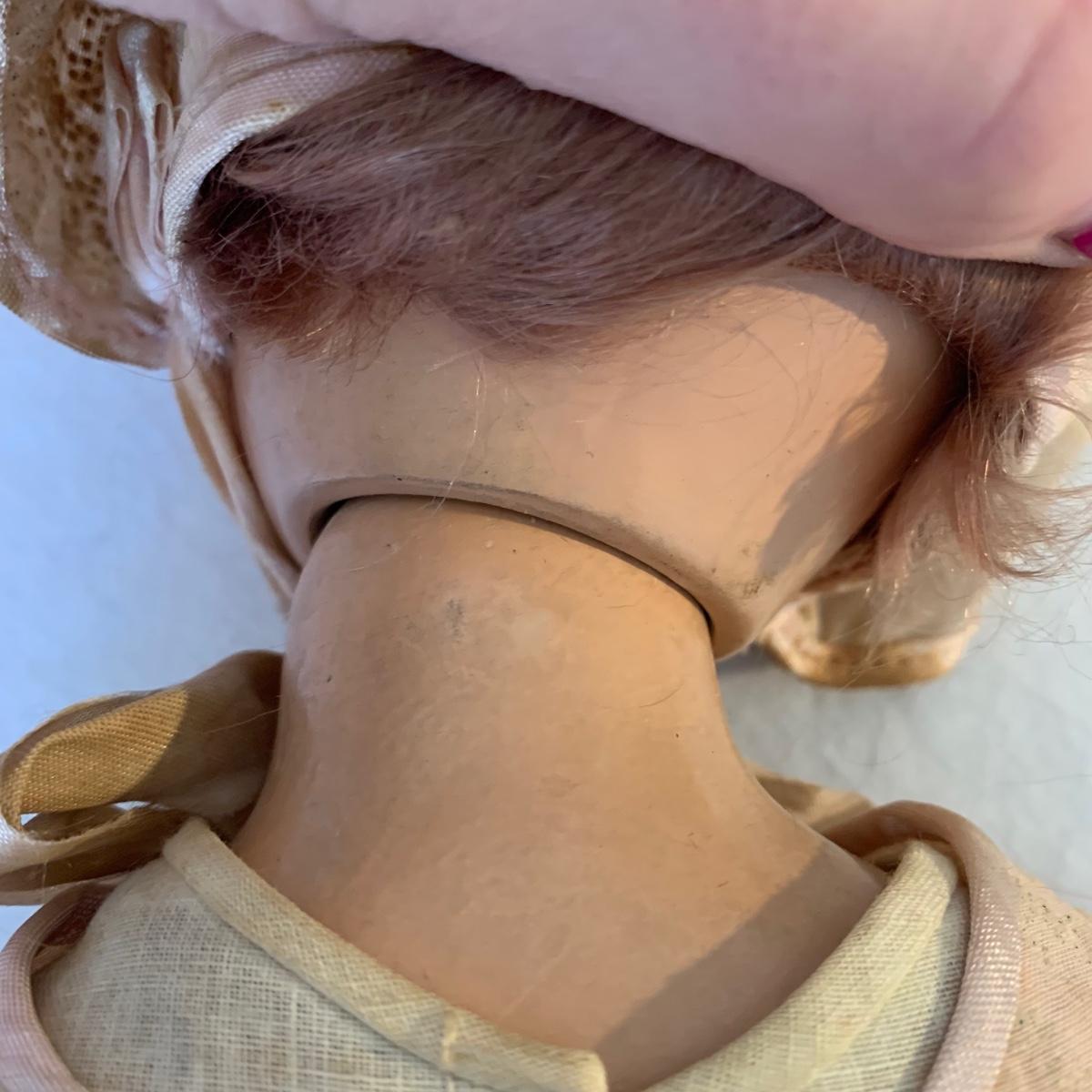 Three vintage baby dolls. All have eyes that open when the doll is upright and close when it is laying down. The doll with the light pink long sleeved dress has a dress tag that reads Madame Alexander and it appears that the back of her neck is branded with MME Alexander as well. All three dolls are in fair condition with cracks and other blemishes apparent on all three, as well as clothing that is quite worn. The largest doll that is wearing shoes is approximately 21” long. This doll and the Madame Alexander can sit upright with no help, but the doll with the blue dress cannot. Shipping available.
