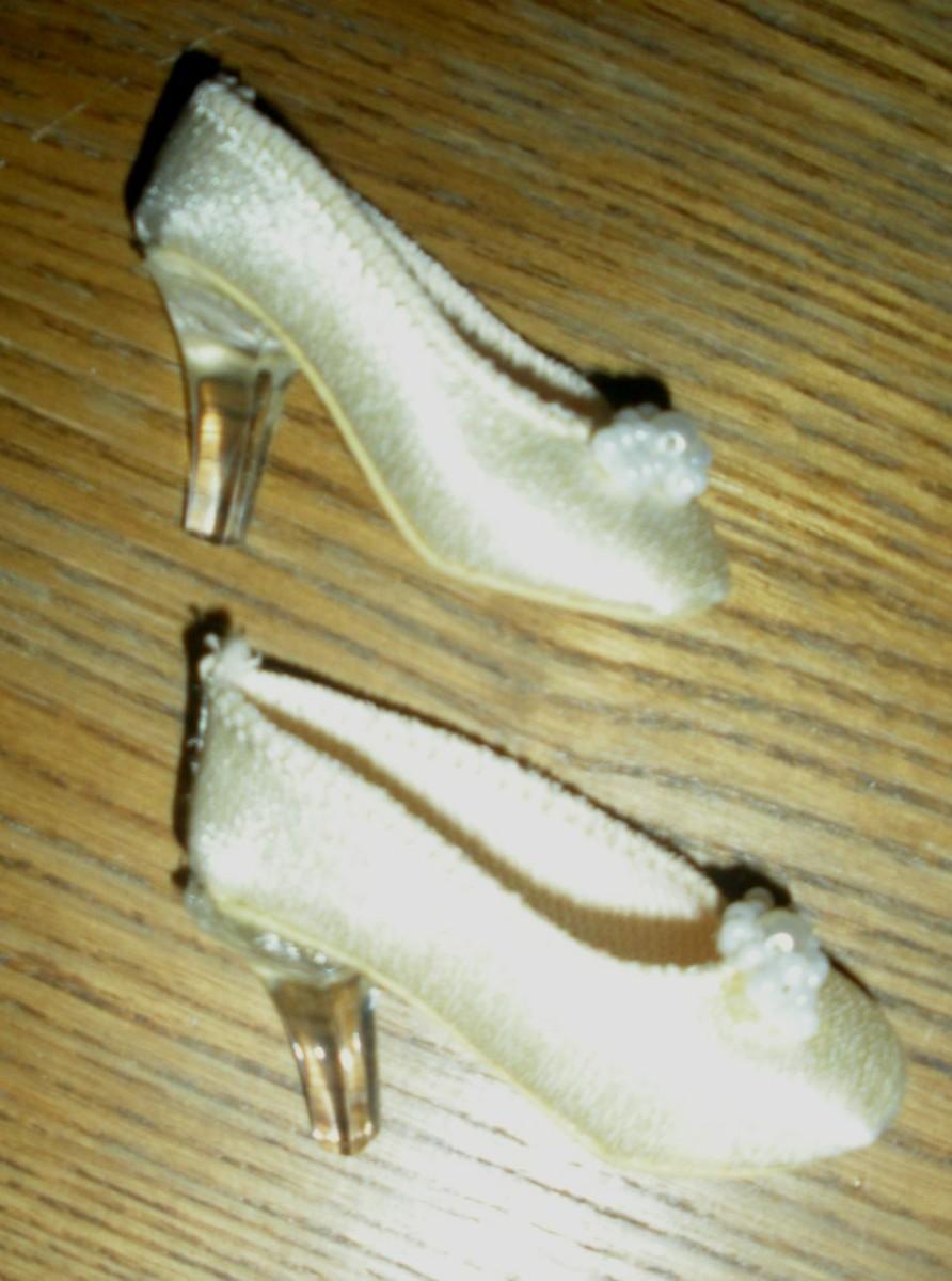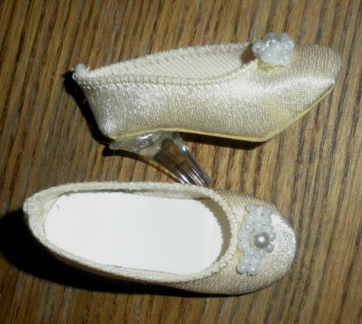 These high heels are for 21" fashion dolls such as Cissy and will fit other 21" as well. Very good vintage condition in ivory satin with clear lucite heels. Has Pear bead trim at toes. Hard to find.