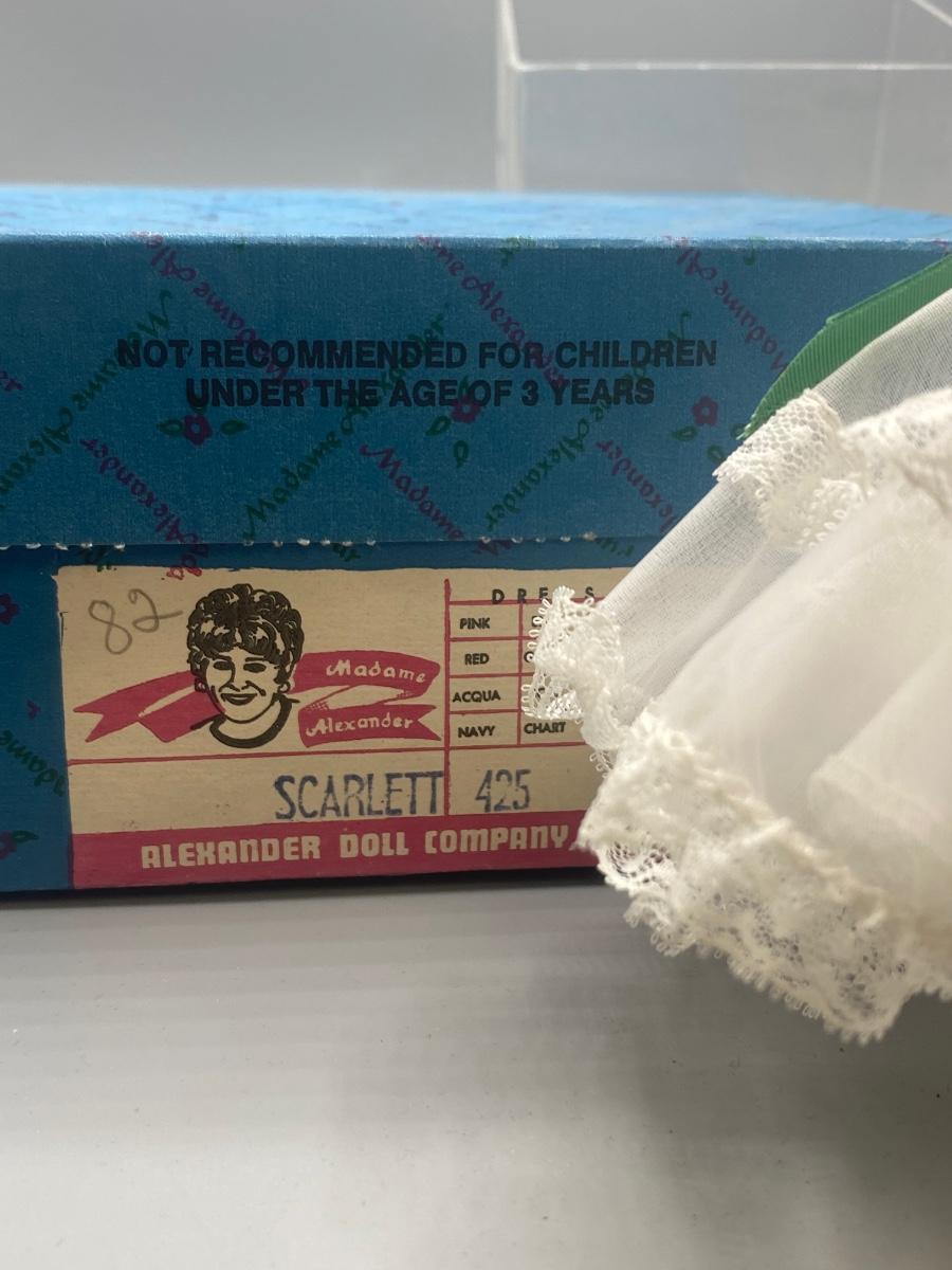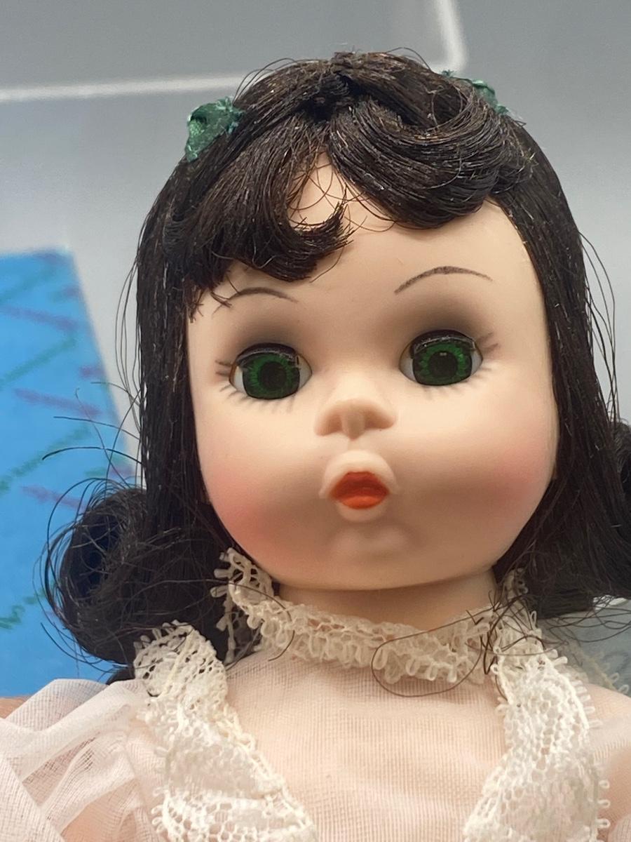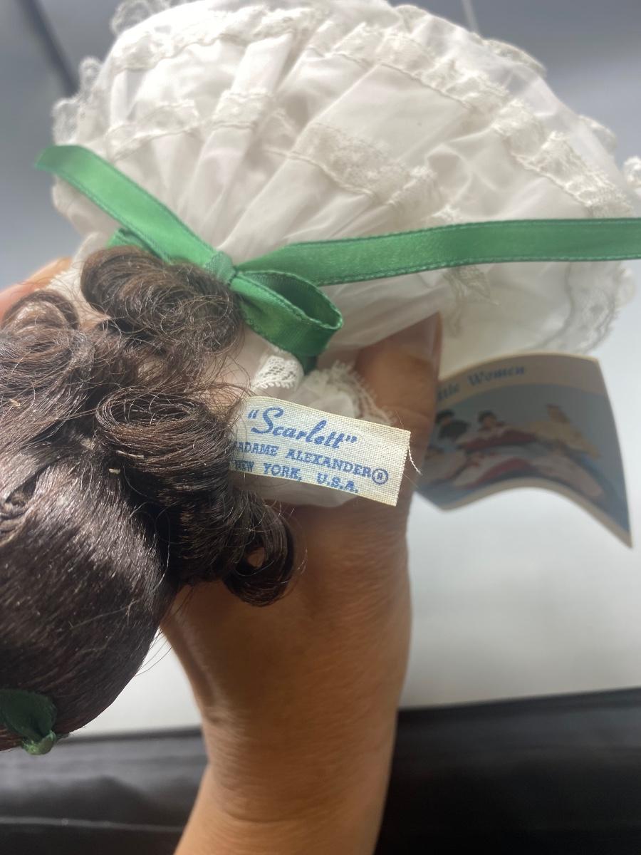 Vintage Madame Alexander Sleepy Eye Scarlett Doll with Box. Fashioned after Scarlett O'Hara. In good vintage condition. Has original hang tag booklet attached to her wrist. About 8" size.