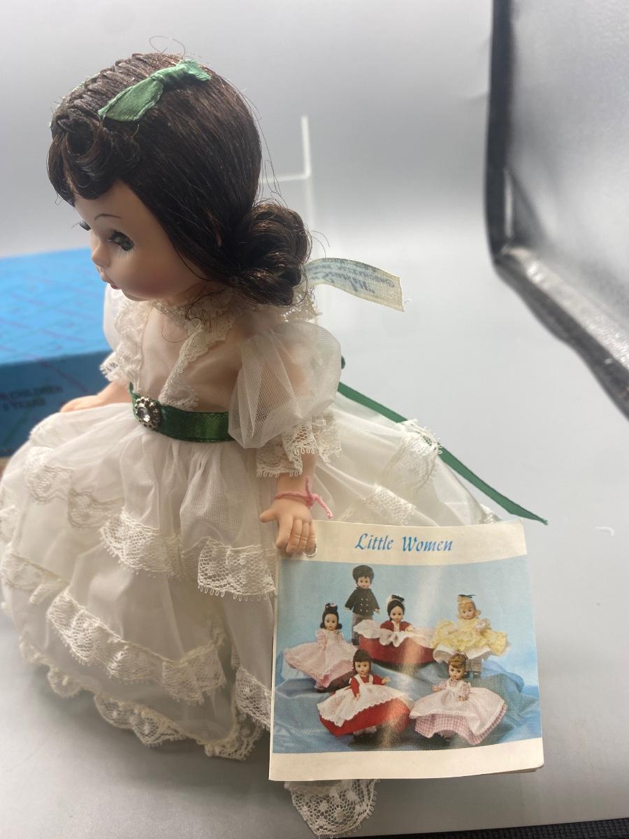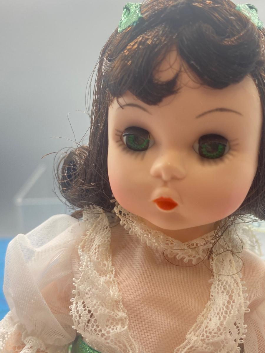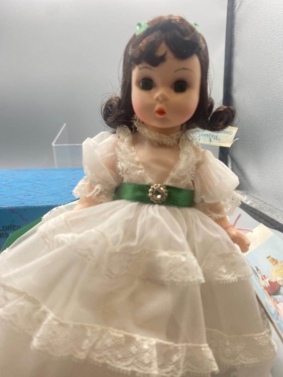 Vintage Madame Alexander Sleepy Eye Scarlett Doll with Box. Fashioned after Scarlett O'Hara. In good vintage condition. Has original hang tag booklet attached to her wrist. About 8" size.
