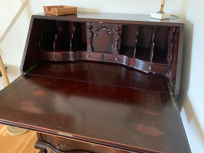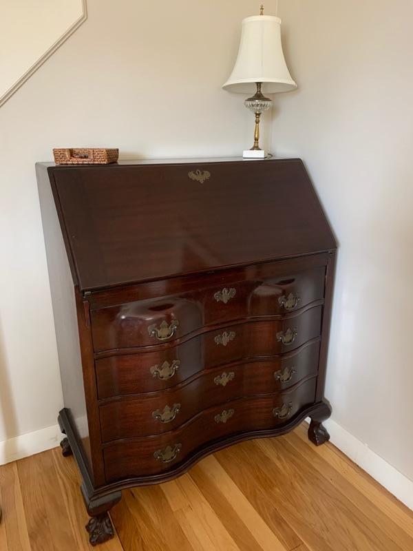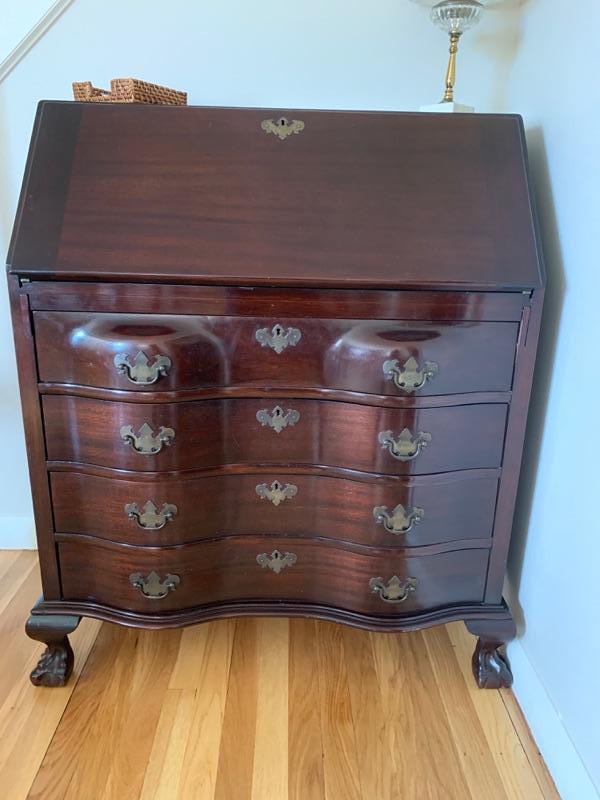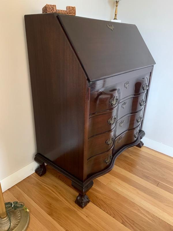 Beautiful condition, vintage 1940's serpentine front 4-drawer desk with drop-front and interior cubbies & key! Ball & claw feet, brass pulls.
