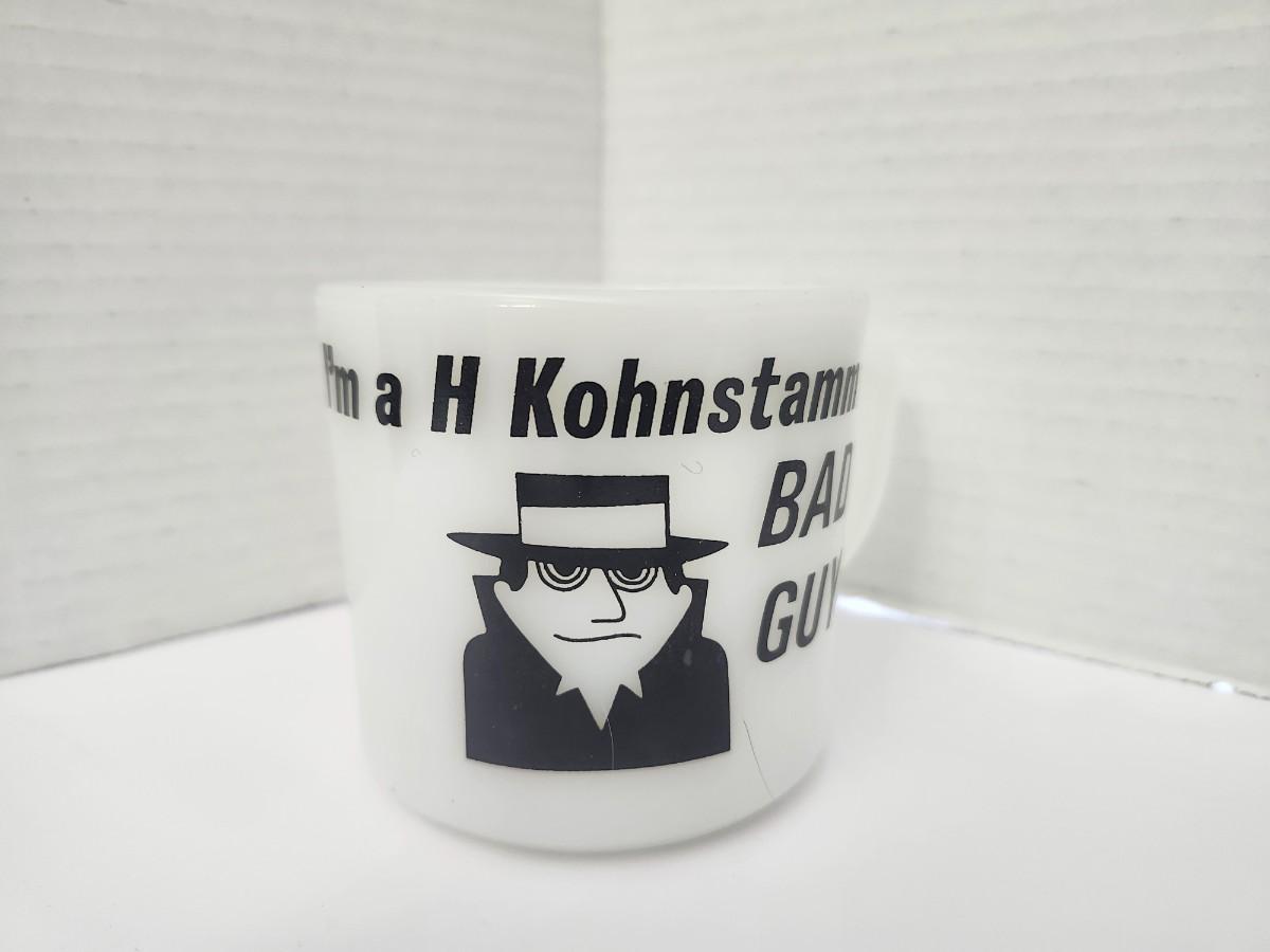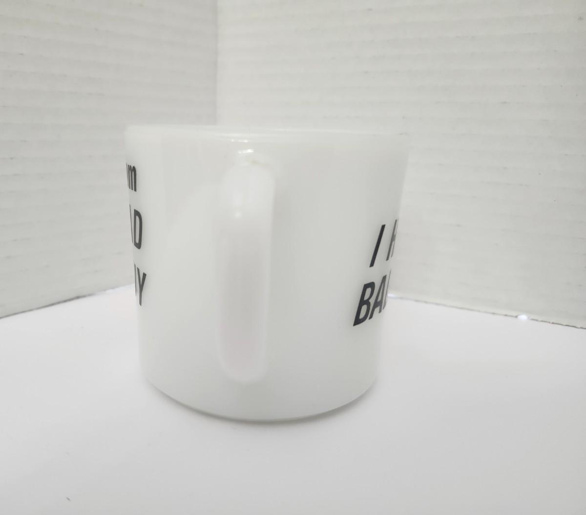 White ceramic coffee mug marked Made in USA. One side reads “I HAD A BAD IDEA” in bold black lettering. Opposite side features a black graphic illustration of a hat wearing figure with surrounding text partially visible as shown in photos. Cylindrical mug with integrated handle. Unbranded example with printed decoration only. Sold exactly as pictured.