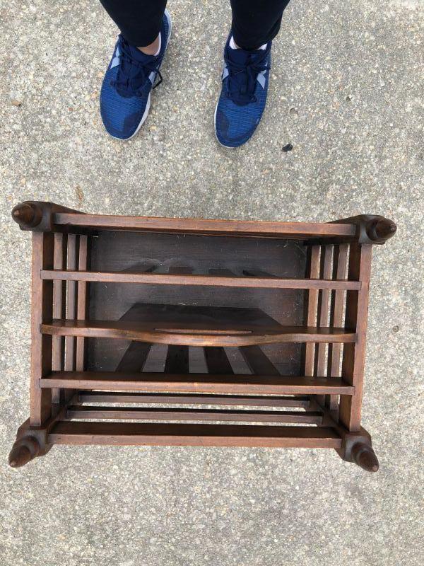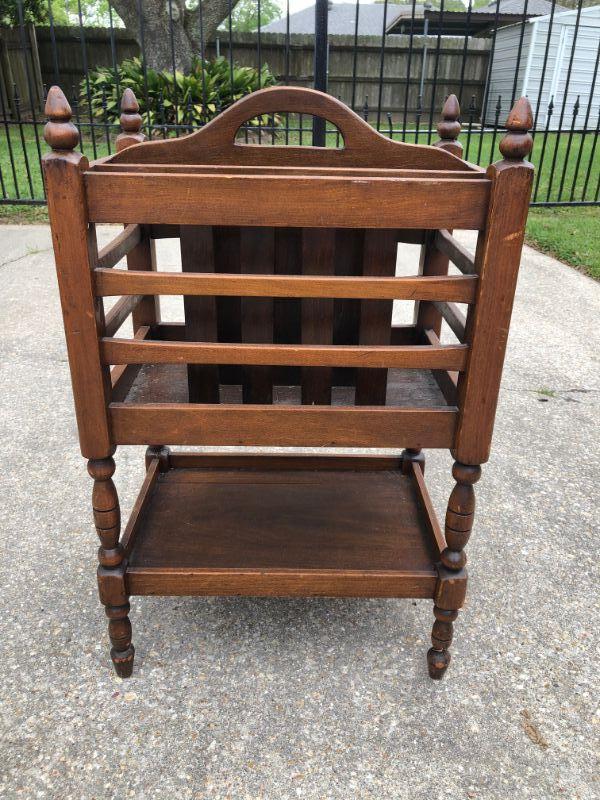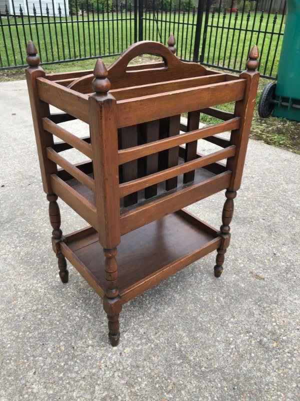 Vintage magazine holder with shelf. Good condition, unusual design. Sturdy.
