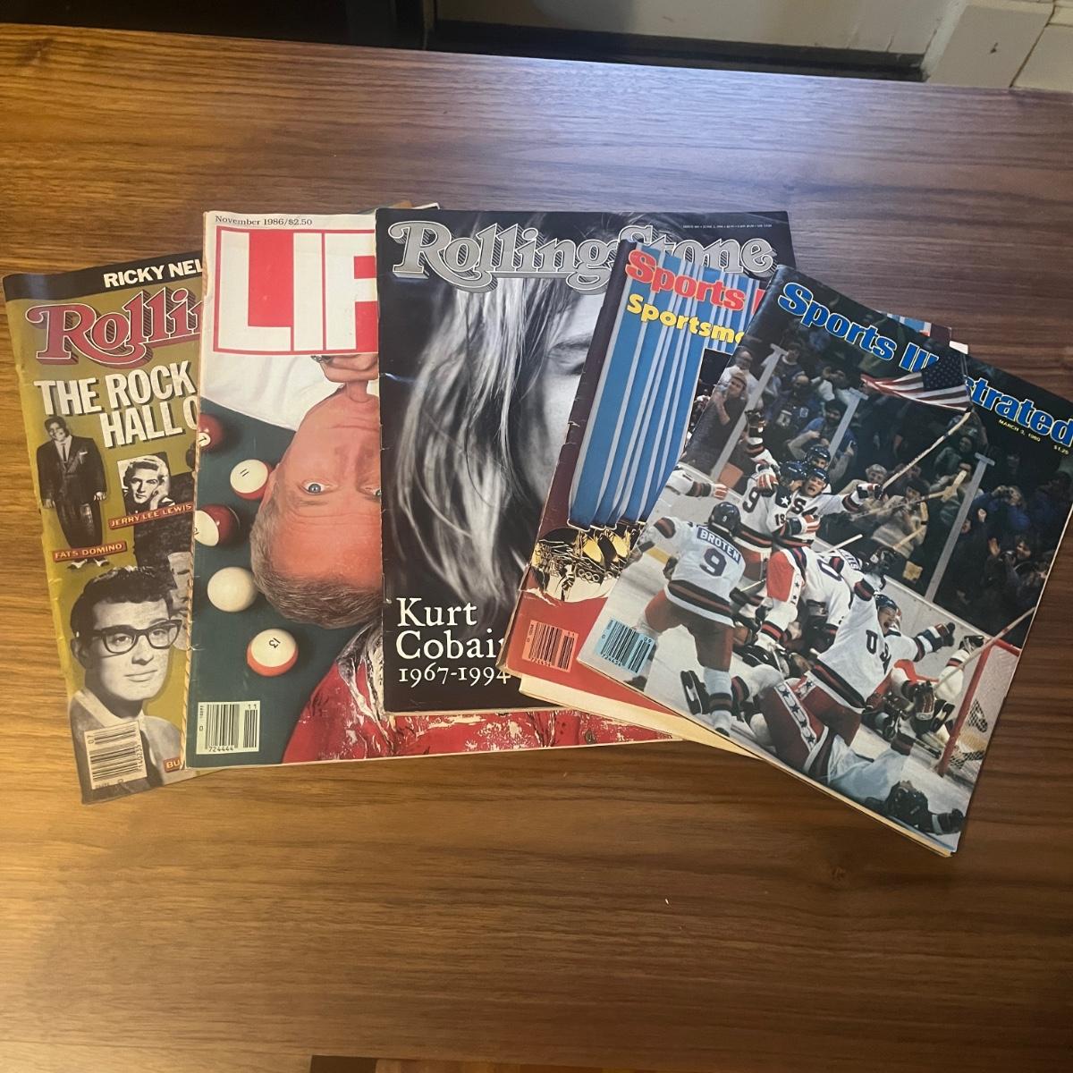 These vintage magazines include two Sports Illustrated, two Rolling Stones and a Life magazine. All appear to have some age and do not seem to be reprints.