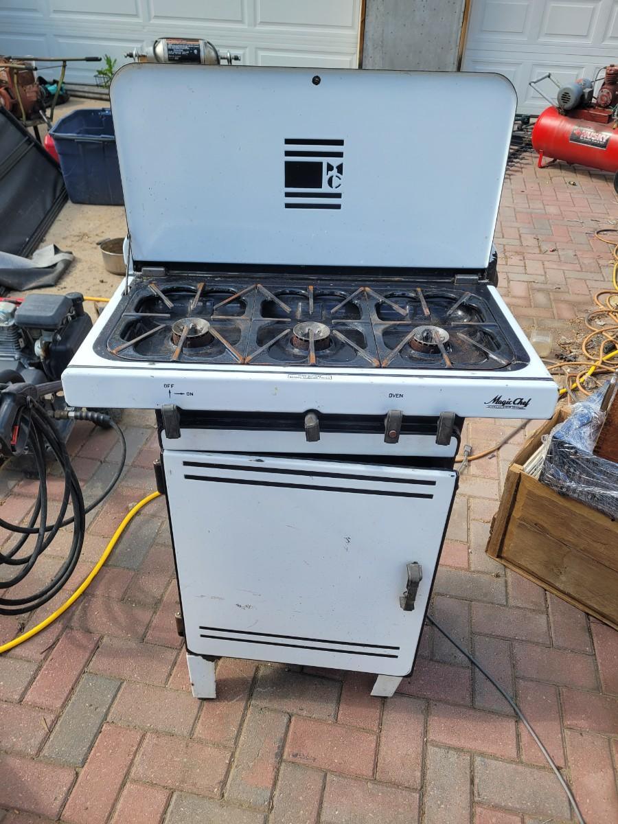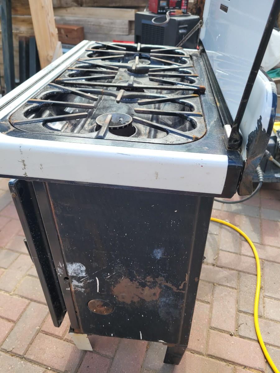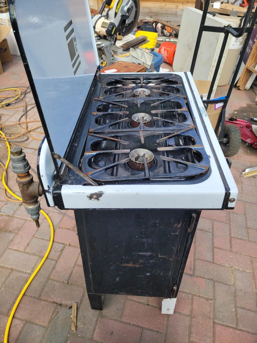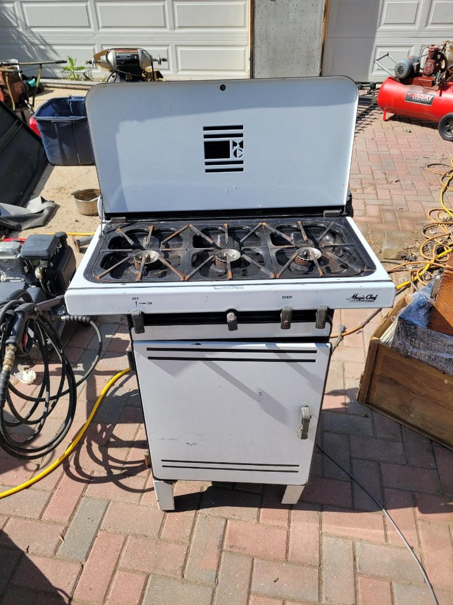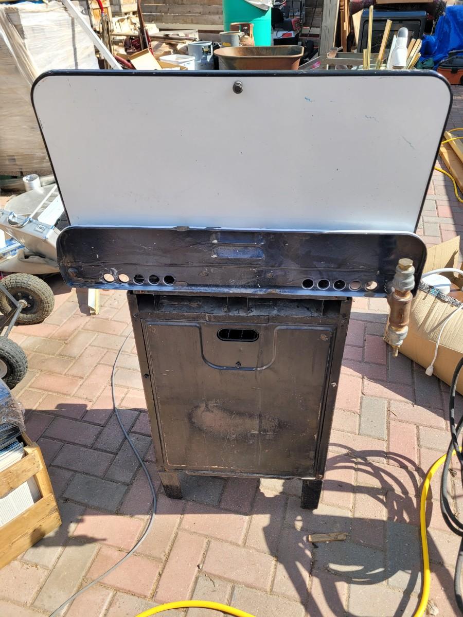 Looks to be complete, I'm not sure if it's set up for propane or natural gas. Measures 28 in wide 17 in deep and 38 in tall with the lid closed and 48 and 1/2 in tall with the lid open. The porcelain does have some chipping see the photos carefully for additional description